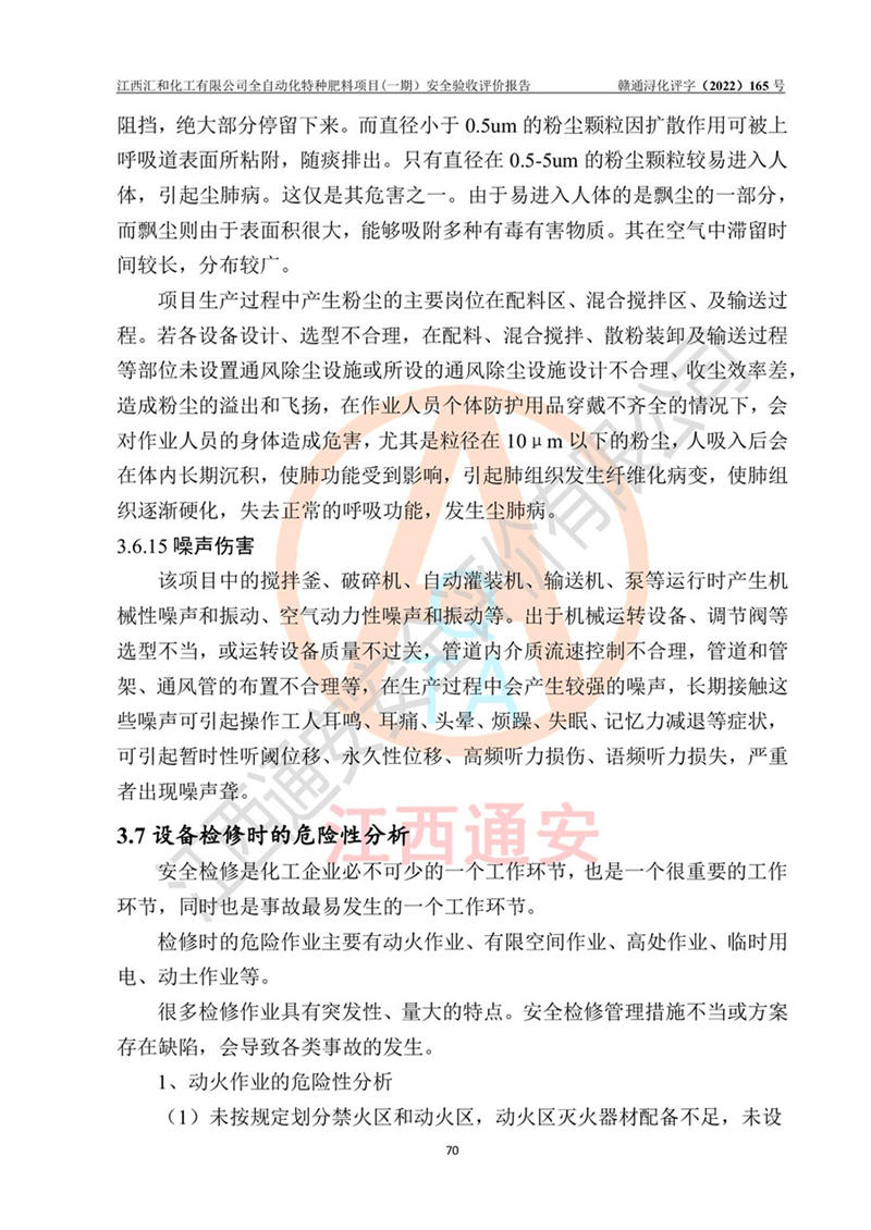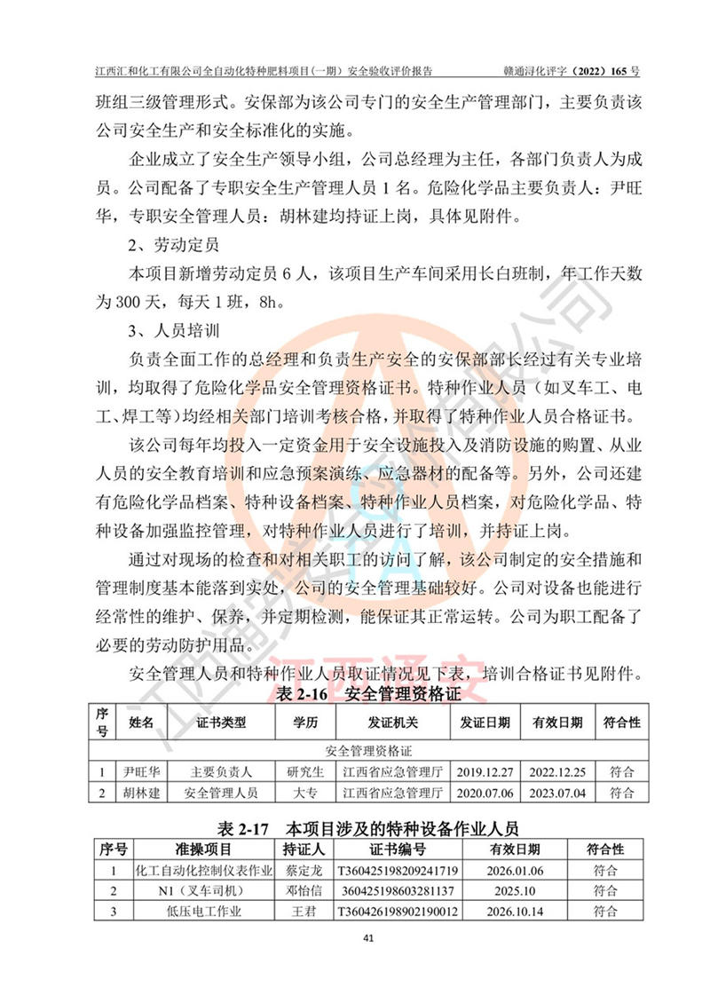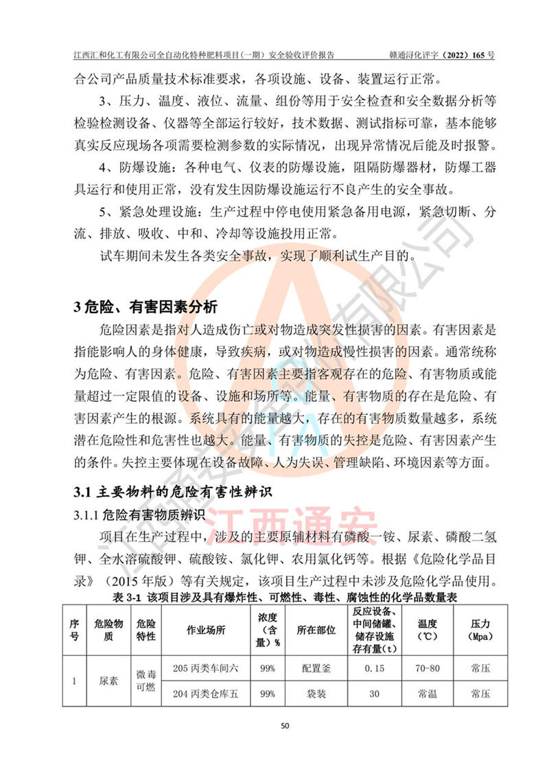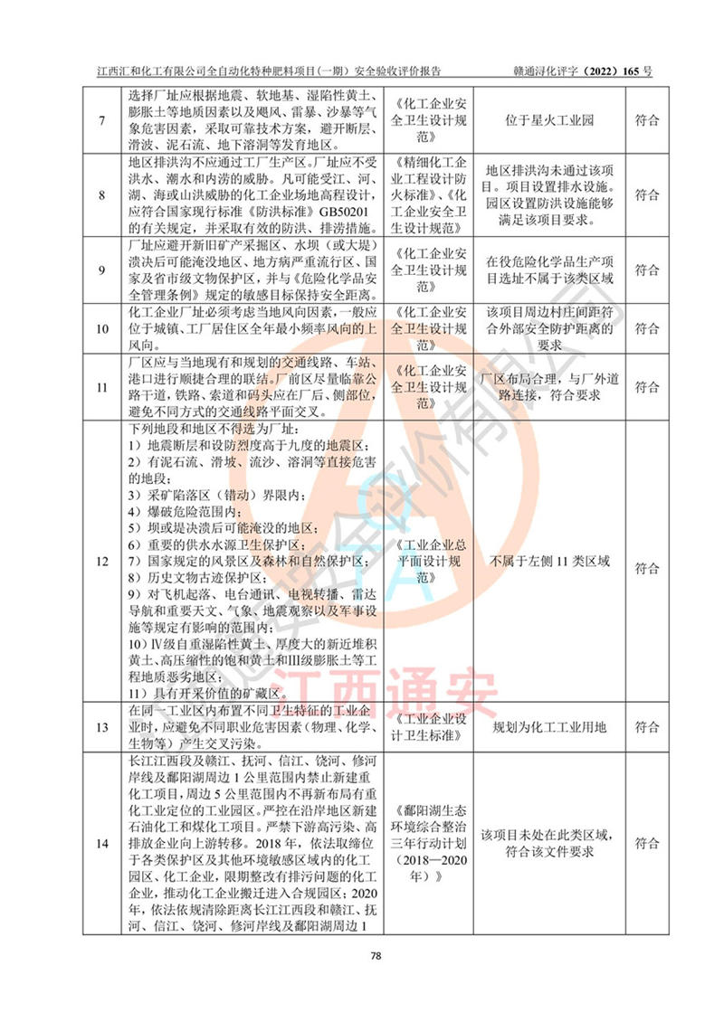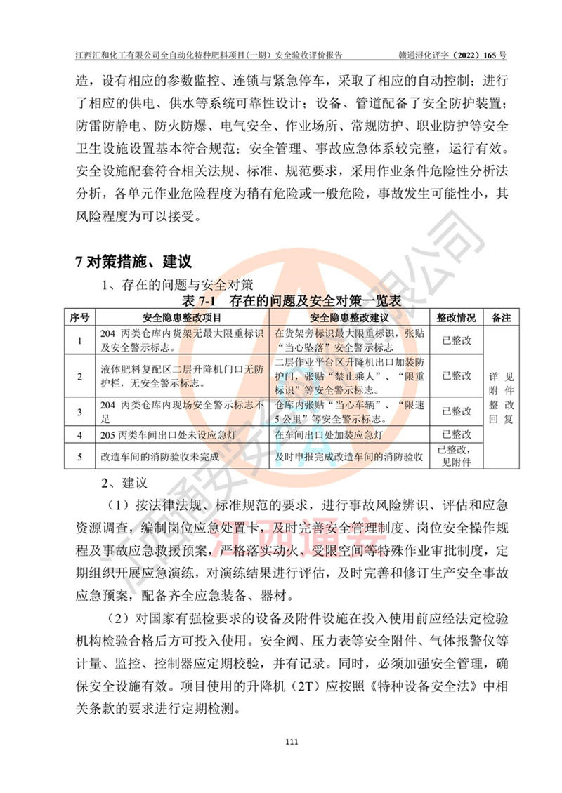 评价结论 | 评价结论:经评价组评价,江西汇和化工有限公司全自动化特种肥料项目(一期)现场总体布局、设备布置、自控系统情况与安全设计变更图纸一致;企业在役装置未涉及重点监管危险化学品,相关自控系统配置与安全设计相符并正常投用;企业主要负责人、安全负责人均不属于新入职,企业主要负责人及安全负责人已取得危险化学品生产企业主要负责人及安全管理人员考核合格证,符合三年专项整治要求。 江西汇和化工有限公司全自动化特种肥料项目(一期)配套安全装置、防护设施以及采取的安全技术措施及安全管理措施符合**有关法规、标准、规范要求,在落实本评价报告有关对策措施后,项目风险可控,其安全生产条件和安全管理方面具备竣工安全验收的条件。 | |||||||