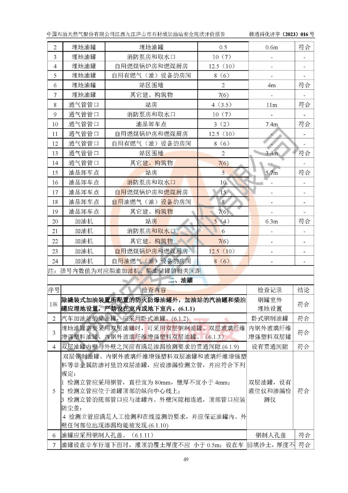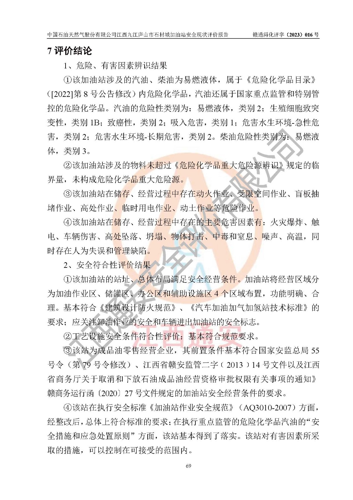 评价结论 | 中国石油天然气股份有限公司江西九江庐山市石材城加油站涉及的安全条件、安全经营条件、安全生产管理符合《危险化学品经营许可证管理办法》、《汽车加油加气加氢站技术标准》等**有关法规、标准、规范要求,能满足危险化学品经营安全条件。 | |||