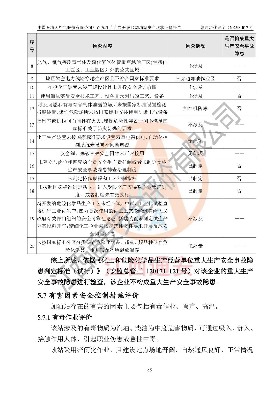 评价结论 | 中国石油天然气股份有限公司江西九江庐山市开发区加油站涉及的安全条件、安全经营条件、安全生产管理符合《危险化学品经营许可证管理办法》、《汽车加油加气加氢站技术标准》等**有关法规、标准、规范要求,能满足危险化学品经营安全条件。 | |||