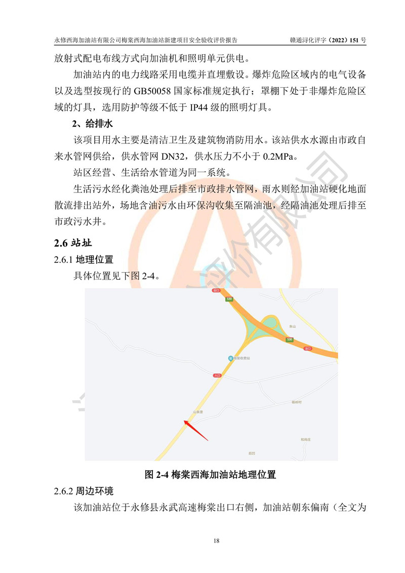 项目简介 | 永修西海加油站有限公司是一家由自然人独资的有限责任公司,依据江西省商务厅办公室文件(赣商务办运行字[2015]154号),在九江市永修县梅棠镇永武高速梅棠出口处新建一座三级加油站,站名为永修西海加油站有限公司梅棠西海加油站。 项目用地已取得永修县国土资源局颁发的不动产权证(赣(2016)永修县不动产权第00001108号),新建项目于2016年9月14日取得《危险化学品建设项目安全设施设计审查意见书》(九危化项目安设审字【2016】12号)。 该新建加油站占地面积3143.81m2,站内设有单层砖混结构站房一座;单层砖混结构辅房两座;钢网结构的罩棚一座;设有4台双枪加油机及配套的工艺管线,设4台SF地下储罐,其中30m3的0#柴油储罐2台、30m3的92#汽油储罐1台、30m3的95#汽油储罐1台,油品储罐总容积共计120 m3(折算为汽油为90m3)。按现行《汽车加油加气加氢站技术标准》对加油站的等级划分原则,属三级加油站。 | |||