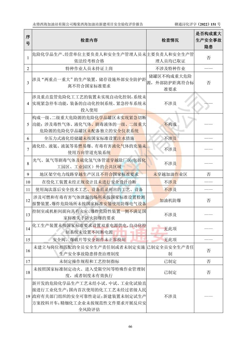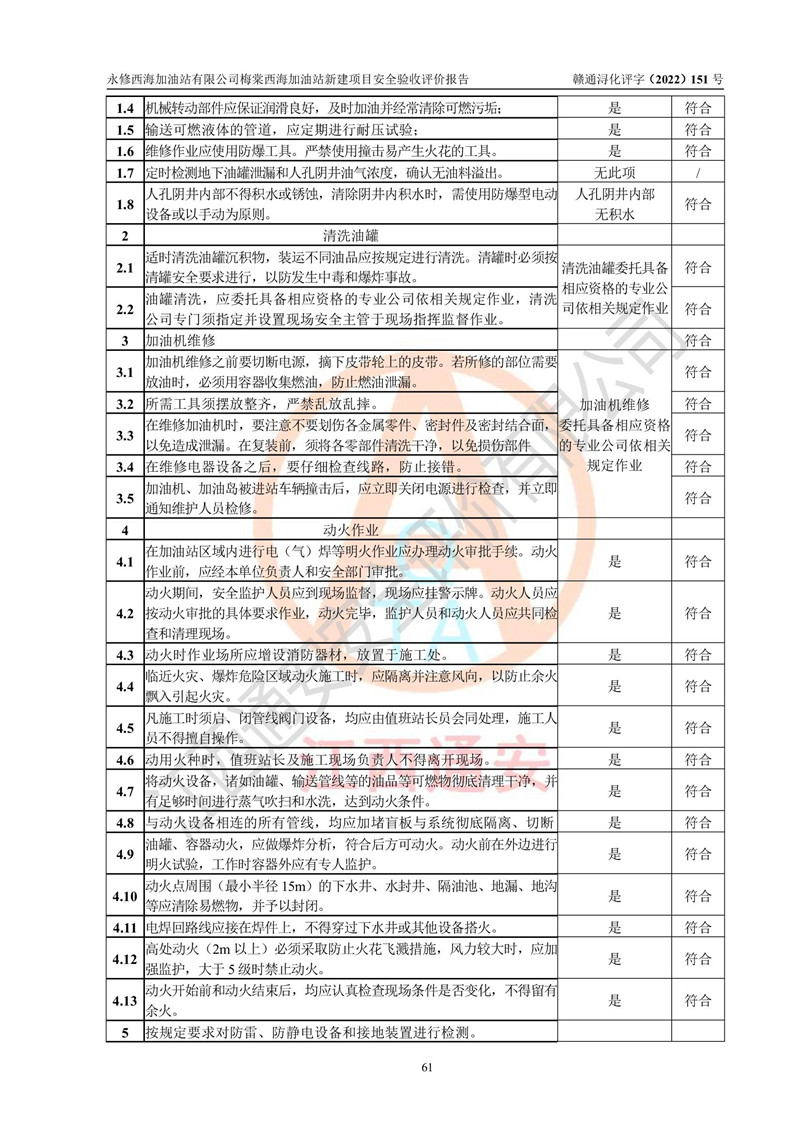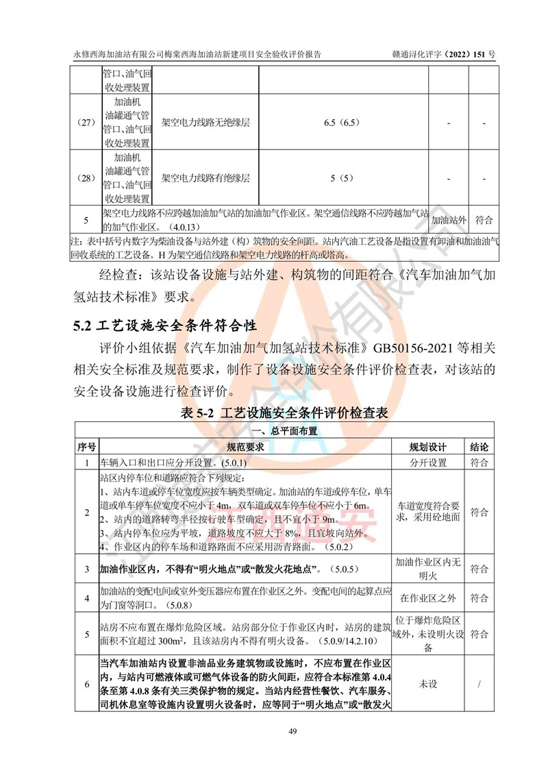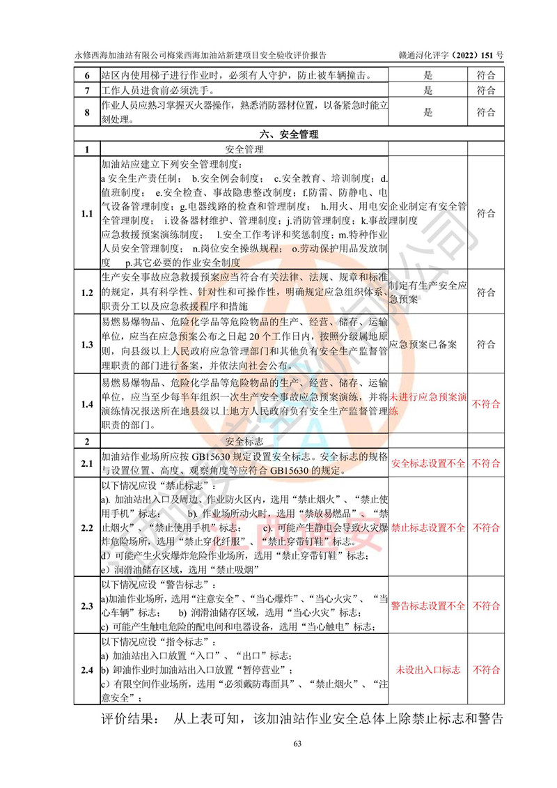 评价结论 | 永修西海加油站有限公司梅棠西海加油站新建项目涉及的安全条件、安全生产条件、安全生产管理符合《危险化学品经营许可证管理办法》、《汽车加油加气加氢站技术标准》等**有关法规、标准、规范要求,能满足成品油零售经营单位的安全条件,具备项目竣工验收的条件。 | |||