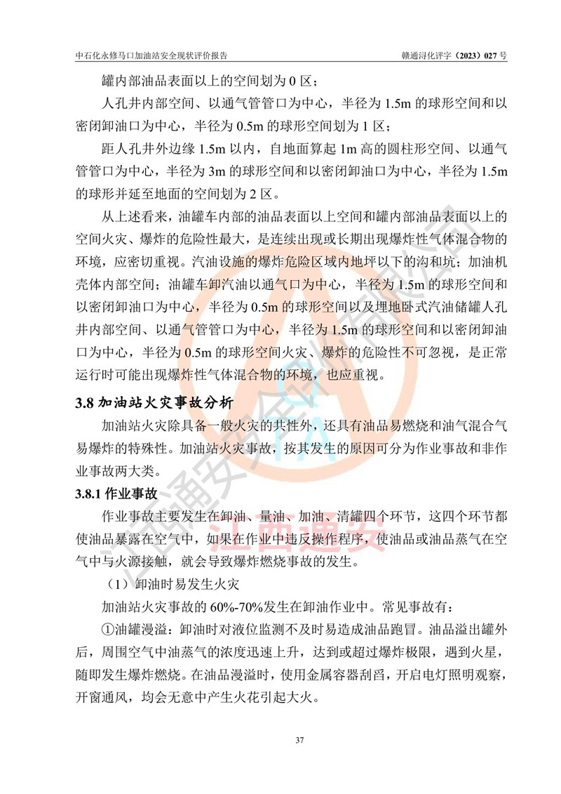 项目简介 | 中国石化销售股份有限公司江西九江永修石油分公司马口加油站是一家专门从事成品油零售经营的有限公司分公司(外商投资企业分公司),经营场所位于九江市永修县马口镇屋场村。现有从业人员3名,其中安全管理人员1人,加油站负责人淦述锋。 该加油站占地面积4000m2,站区内设置有4台双枪税控燃油加油机及配套的工艺管线,设有SF双层储罐4台(停用1台柴油储罐,在用3台),其中30m3的92#汽油储罐1台、30m3的95#汽油储罐1台、30m3的0#柴油储罐1台,油品储罐总容积为90m3(折算成汽油为75 m3),按现行《汽车加油加气加氢站技术标准》对加油站的等级划分原则,属三级加油站。 该站由九江市应急管理局换发《危险化学品经营许可证》(证号:赣九危化经字[2020]000293号),**期限2020年03月31日至2023年03月30日。 | |||