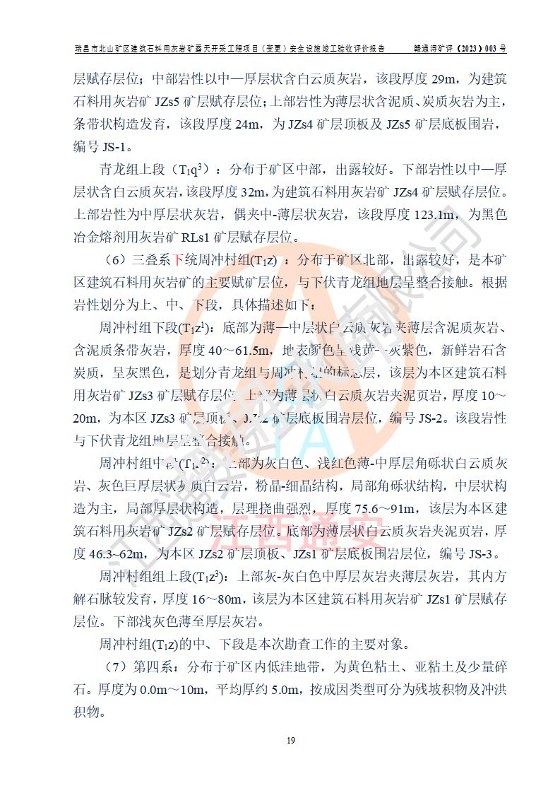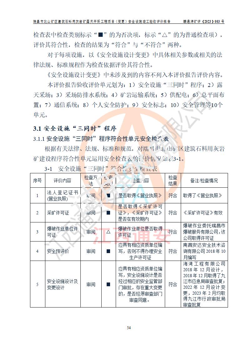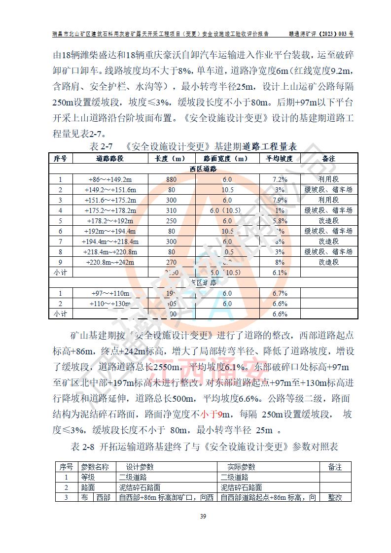 1)矿山无**矿山安全监察局印发的《金属非金属矿山重大事故隐患判定标准》规定的重大事故隐患。不构成《危险化学品重大危险源辨识》规定的危险化学品重大危险源。 2)企业应重点关注的安全对策:矿山*终边坡**达262m,*终边坡高差*过200m前,**设置边坡在线监测设施;破碎及堆料封闭棚、工间休息室、备品备件库、变配电间、中控室、石灰仓库等在矿山爆破警戒线内,爆破时作业时应撤离建筑物内所有人员至爆破警戒线以外;后期按《安全设施设计变更》设置清扫平台的排水沟;边坡角度、台阶**、平台宽度均应符合设计要求,并遵循**的有关规程、标准要求等。 评价结论:瑞昌市江瑞冶金材料有限公司瑞昌市北山矿区建筑石料用灰岩矿露天开采工程项目(变更)通过前期建设,周边环境、总平面布置、开采现场总体符合**安全生产法律、法规、规章、规范的要求,安全设施总体符合《瑞昌市江瑞冶金材料有限公司瑞昌市北山矿区建筑石料用灰岩矿露天开采工程项目安全设施设计变更》的要求,满足安全生产条件。 瑞昌市江瑞冶金材料有限公司瑞昌市北山矿区建筑石料用灰岩矿露天开采工程项目(变更)具备安全设施竣工验收条件。 |