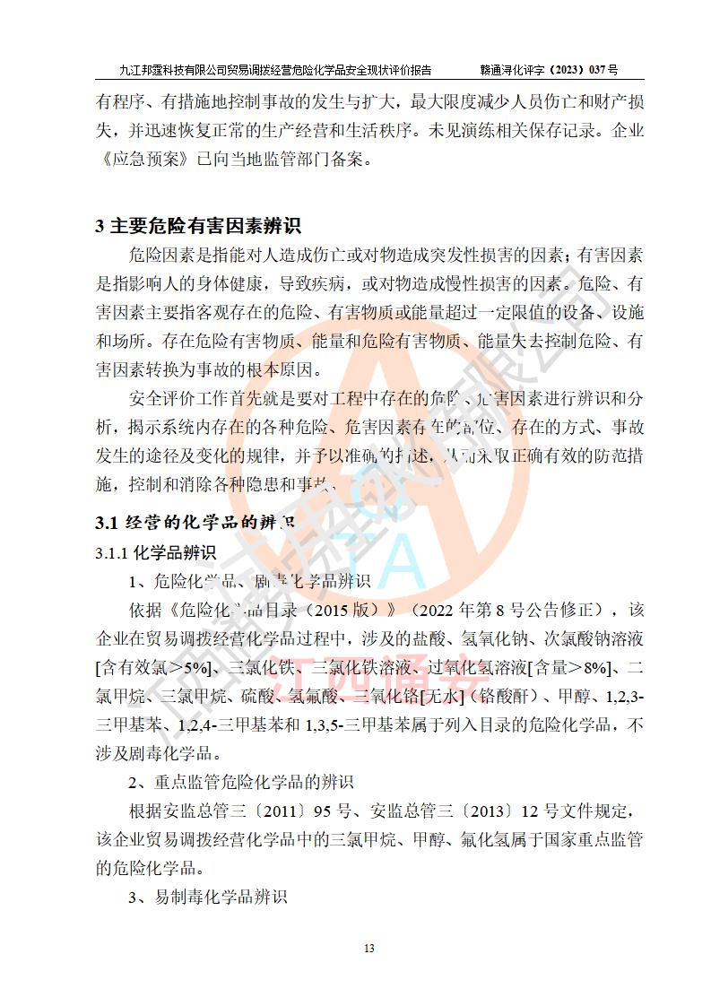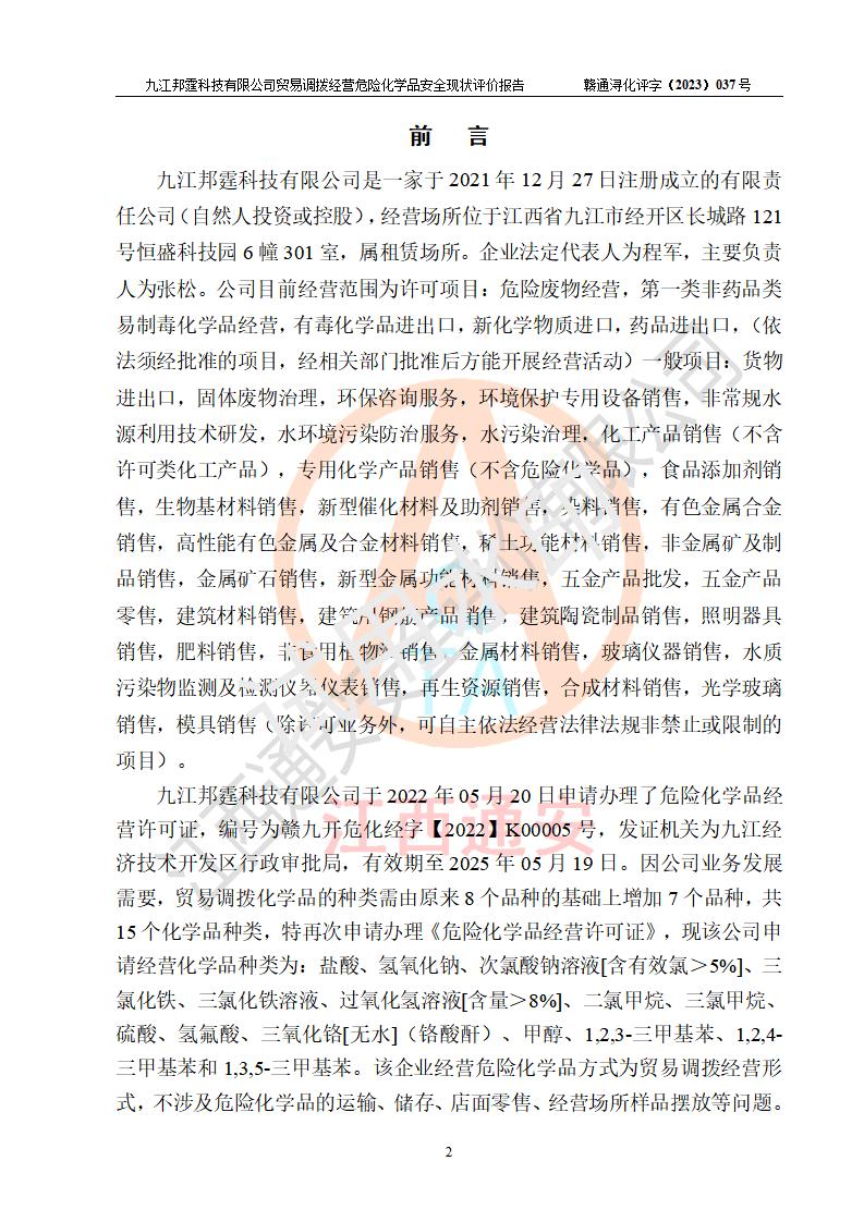 评价结论 | 九江邦霆科技有限公司贸易调拨经营危险化学品的安全条件符合**有关法规、标准、规范要求,落实评价报告有关建议后,风险可控,具备危险化学品经营安全条件。 | |||||