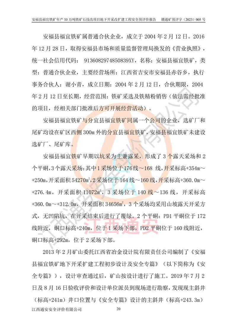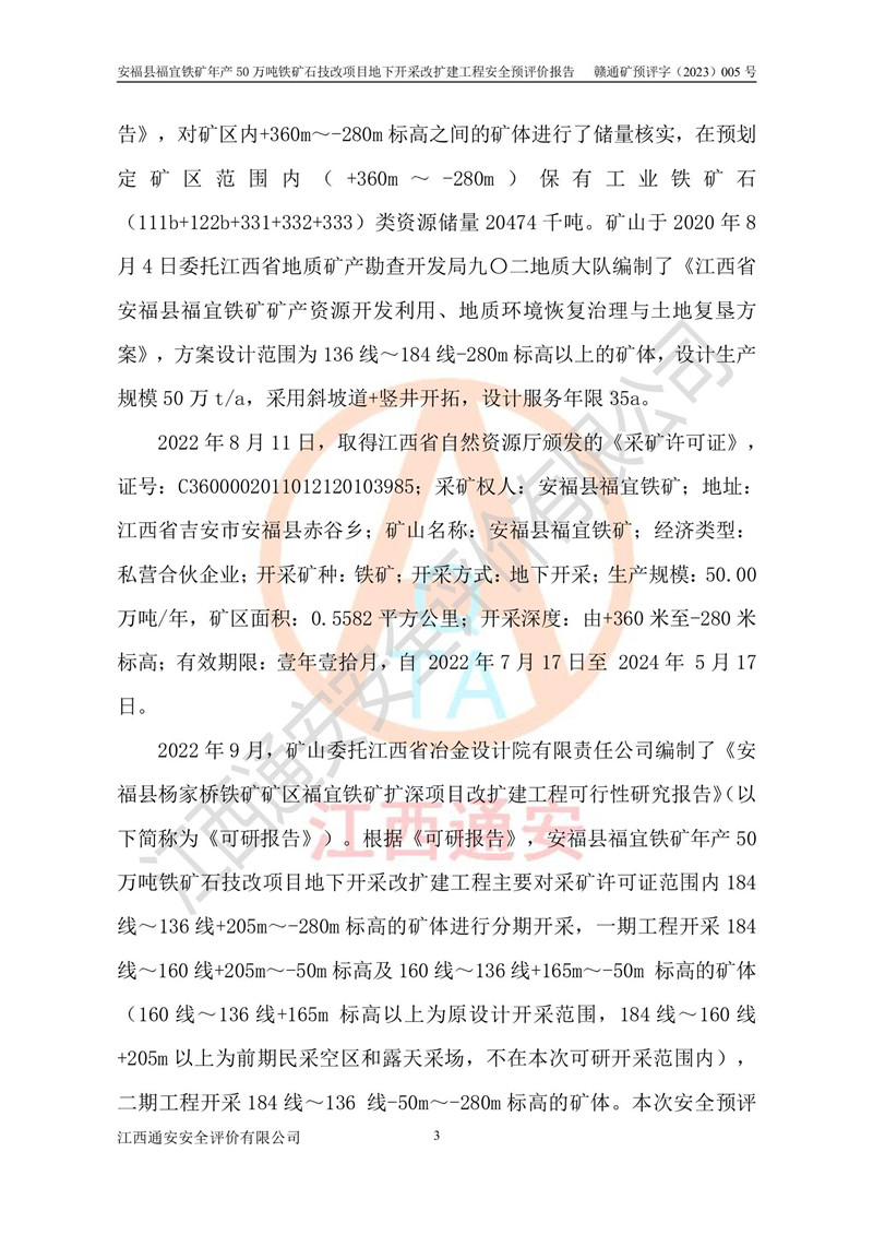 项目名称 | 安福县福宜铁矿年产50万吨铁矿石技改项目地下开采改扩建工程安全预评价报告 | ||||