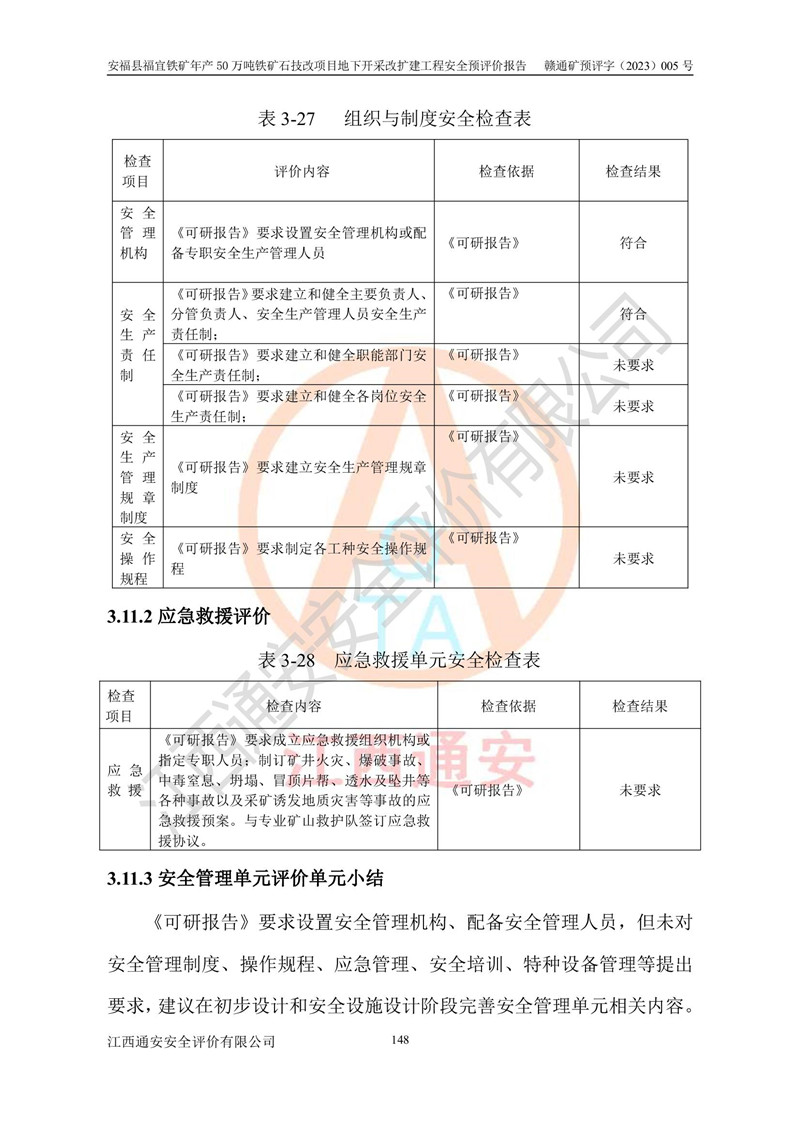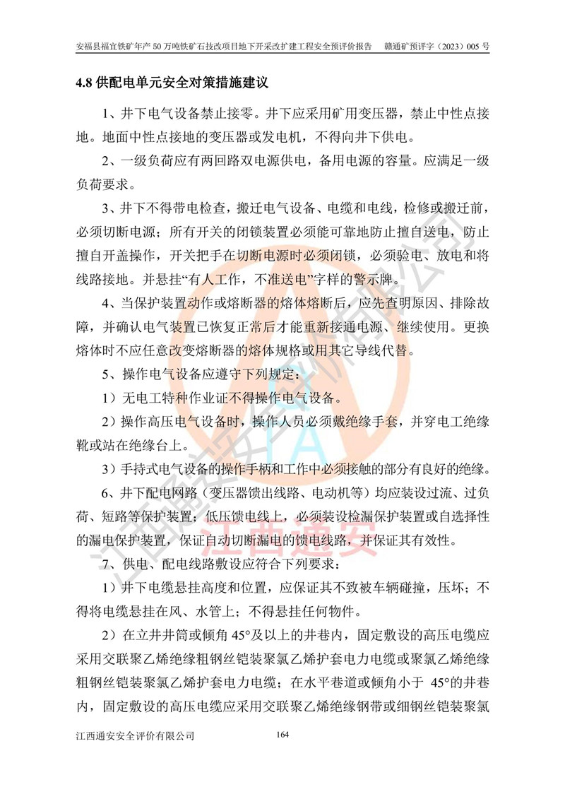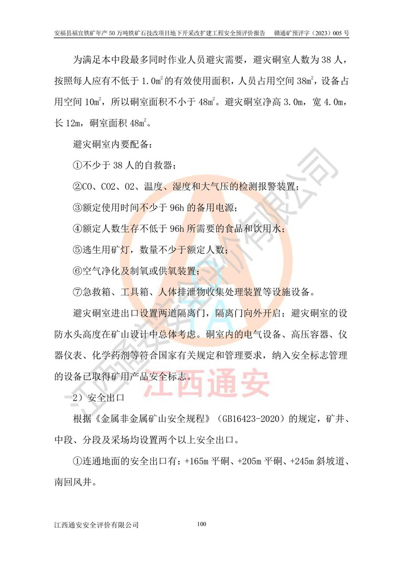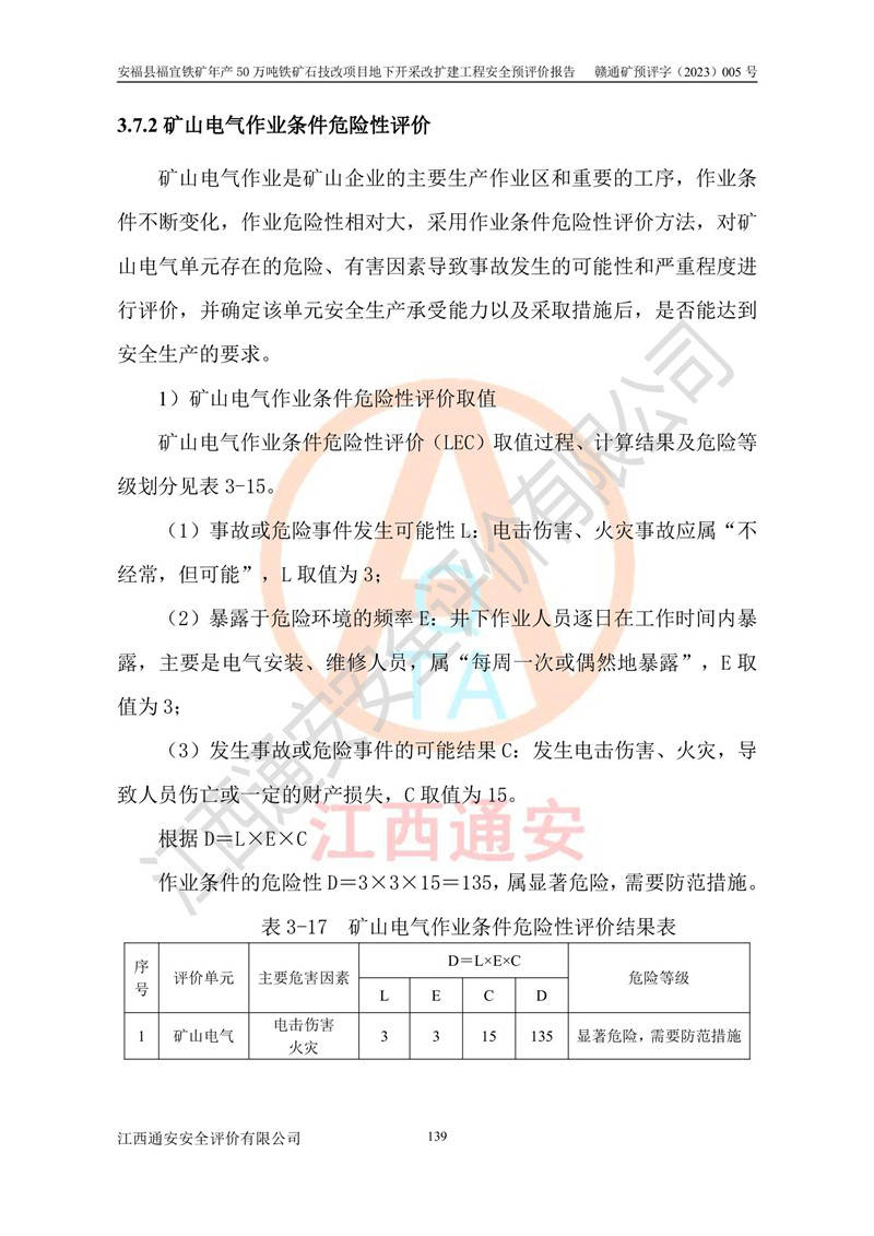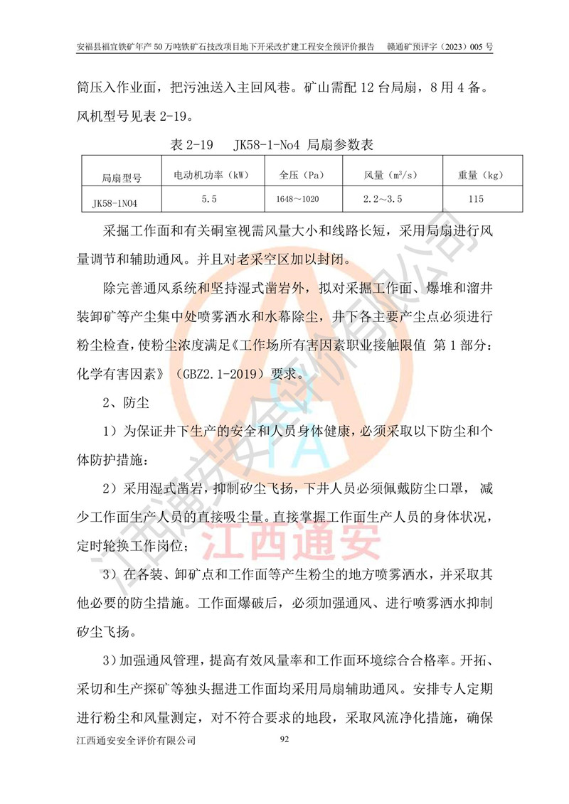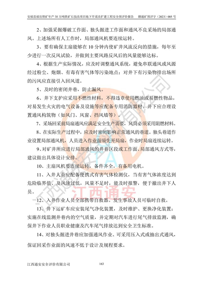 其它 | 安福县福宜铁矿年产50万吨铁矿石技改项目地下开采改扩建工程《可研报告》设计的开采方案总体可行,未使用**明令禁止使用的设备、材料和工艺,没有重大危险源。针对该项目在今后建设和生产中潜在的危险、有害因素,在安全设施设计阶段充分采纳《可研报告》及本《安全预评价报告》中提出的安全对策措施与建议,严格执行《金属非金属矿山安全规程》等的要求,是可以得到**控制的,在安全对策措施建议得到**落实后,风险是可以接受的,可以**该矿生产的安全运行。 安福县福宜铁矿年产50万吨铁矿石技改项目地下开采改扩建工程从安全生产角度符合**有关法律、法规、标准和规范的要求。 | ||||