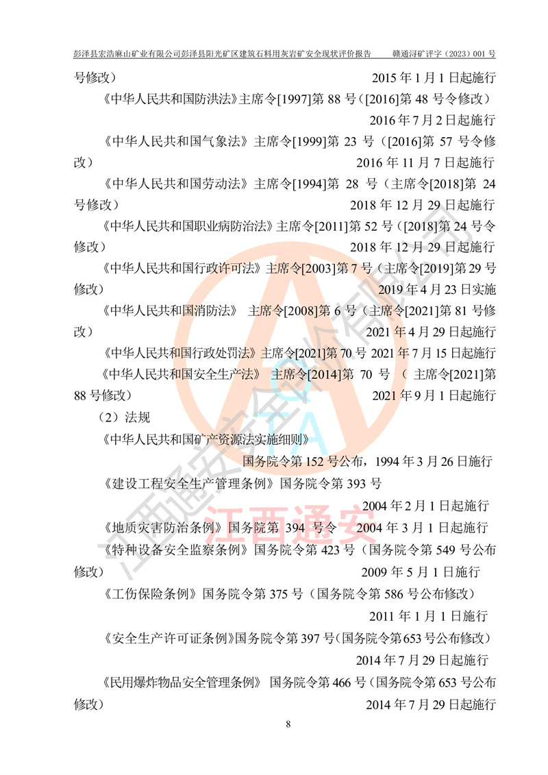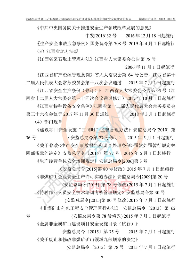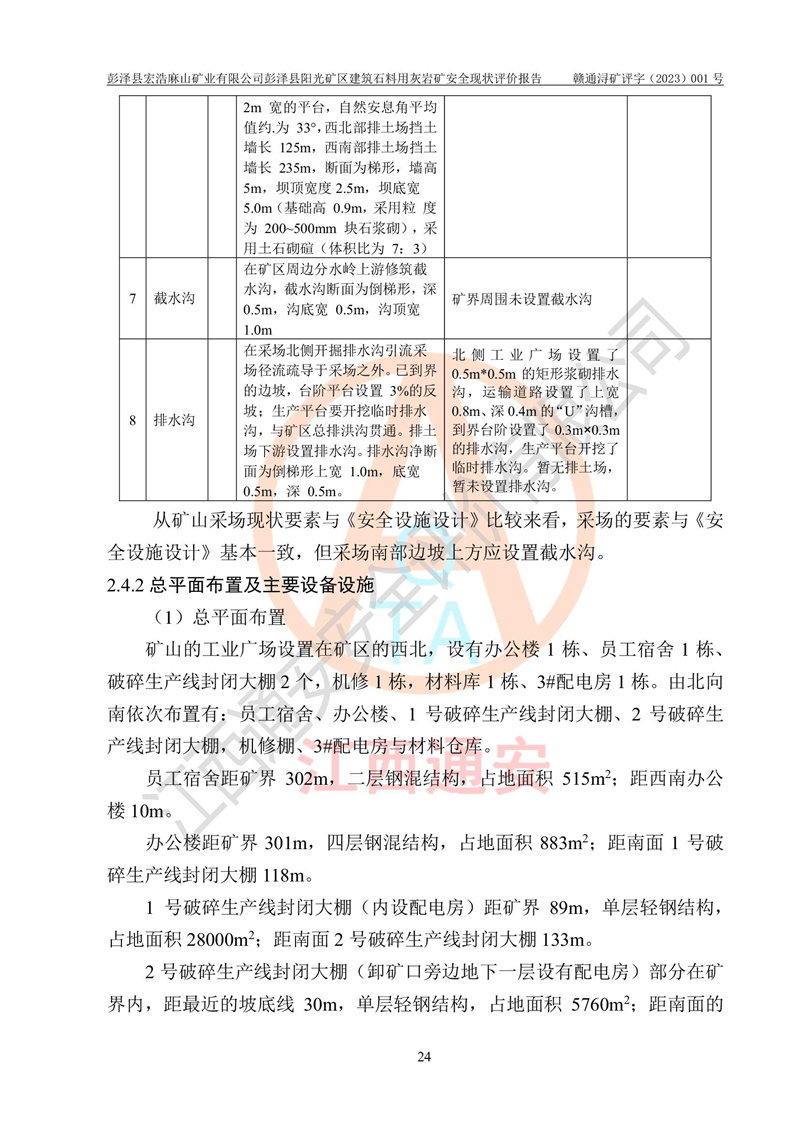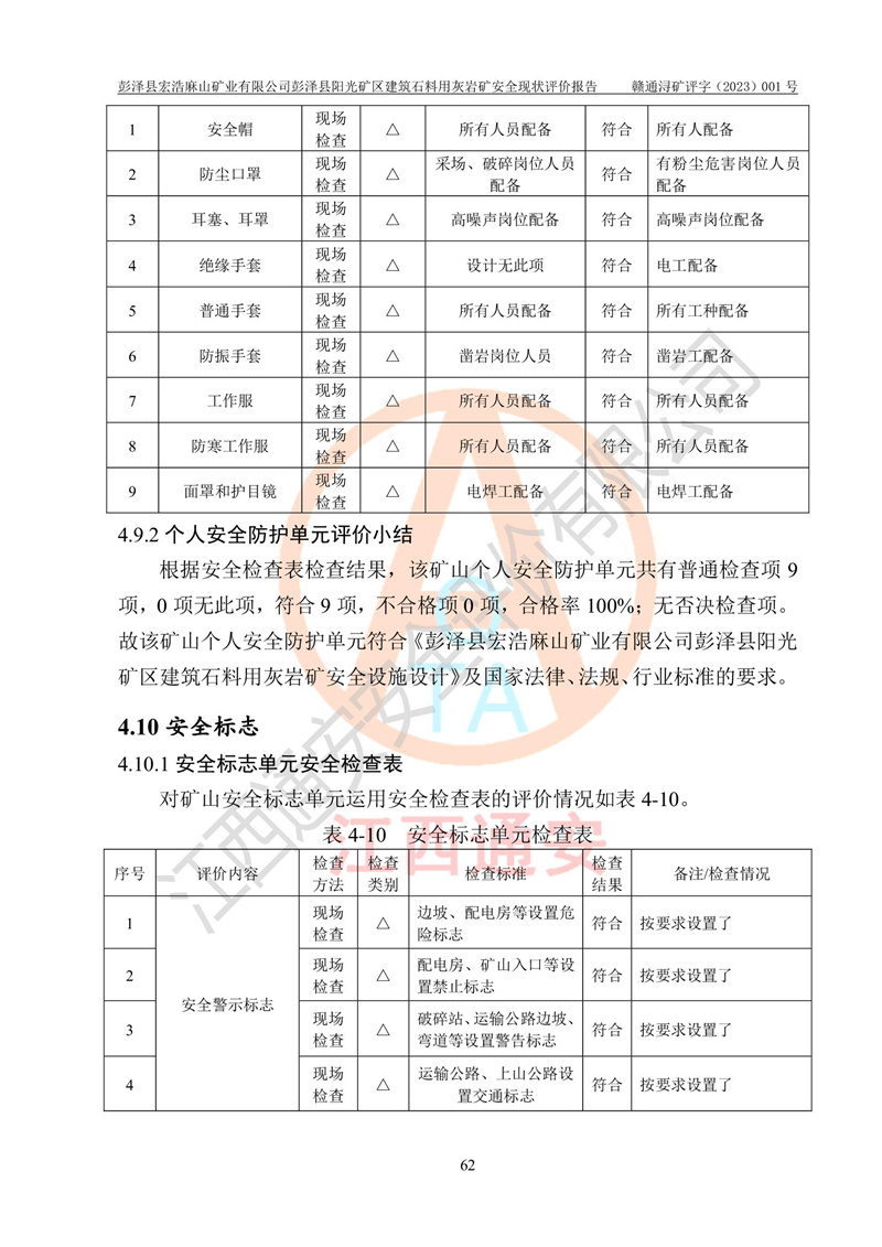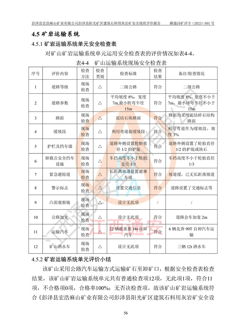 (1)矿山存在火灾、火药爆炸、雷管爆炸、放炮、坍塌(滑坡)、泥石流、机械伤害、容器爆炸、高处坠落、**伤害、触电与雷击、物体打击、淹溺、高低温、振动、粉尘危害等危险有害因素。矿山无**矿山安全监察局印发的《金属非金属矿山重大生产安全事故隐患判定标准》规定的重大事故隐患;不构成《危险化学品重大危险源辨识》规定的重大危险源。 (2)矿山总体符合《彭泽县宏浩麻山矿业有限公司彭泽县阳光矿区建筑石料用灰岩矿安全设施设计》和**安全生产法律、法规和行业标准、规范的要求。。 (3)矿山应重点防范的重大危险有害因素有:坍塌、放炮、**伤害等。 总体结论:彭泽县宏浩麻山矿业有限公司彭泽县阳光矿区建筑石料用灰岩矿周边环境符合法规要求;安全设施总体符合《彭泽县宏浩麻山矿业有限公司彭泽县阳光矿区建筑石料用灰岩矿安全设施设计》的要求,风险可控,满足安全生产条件。 |