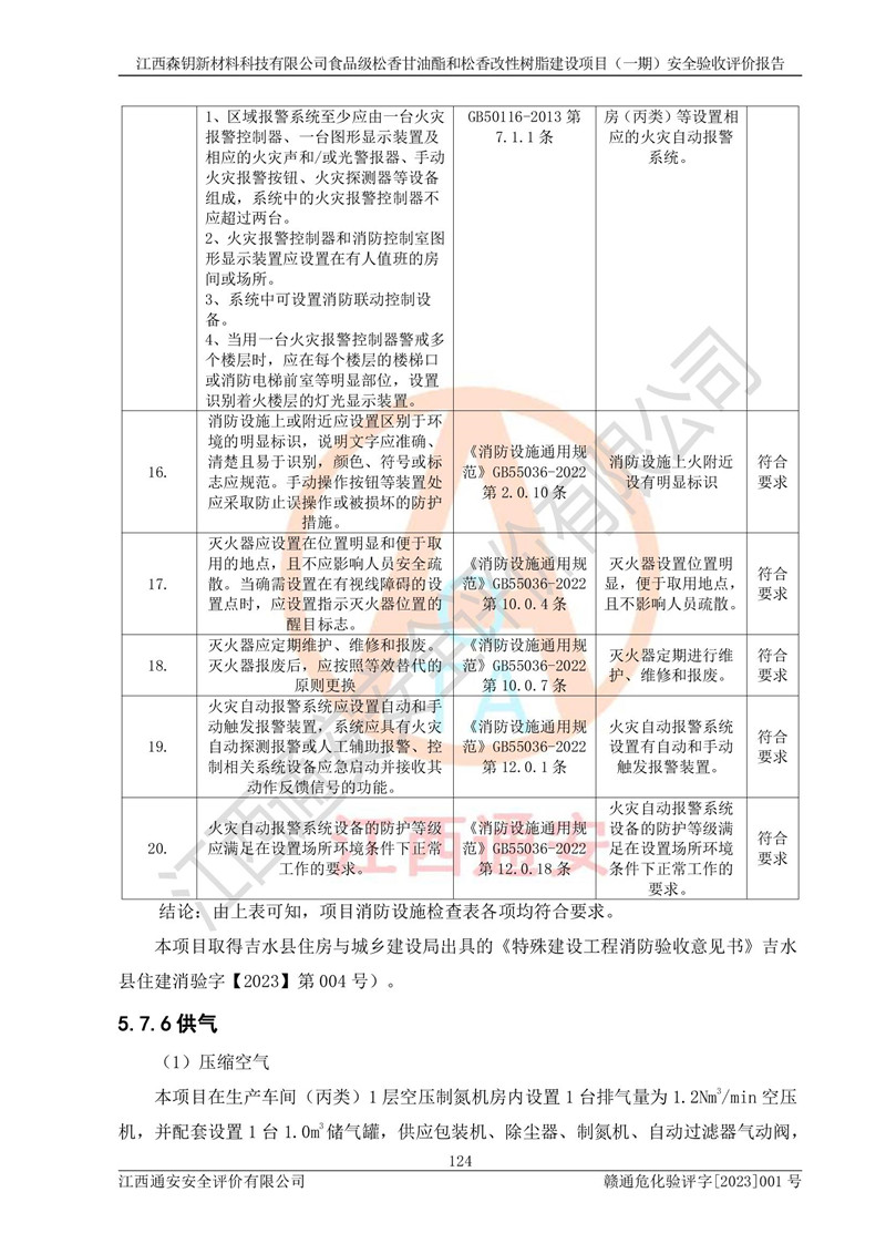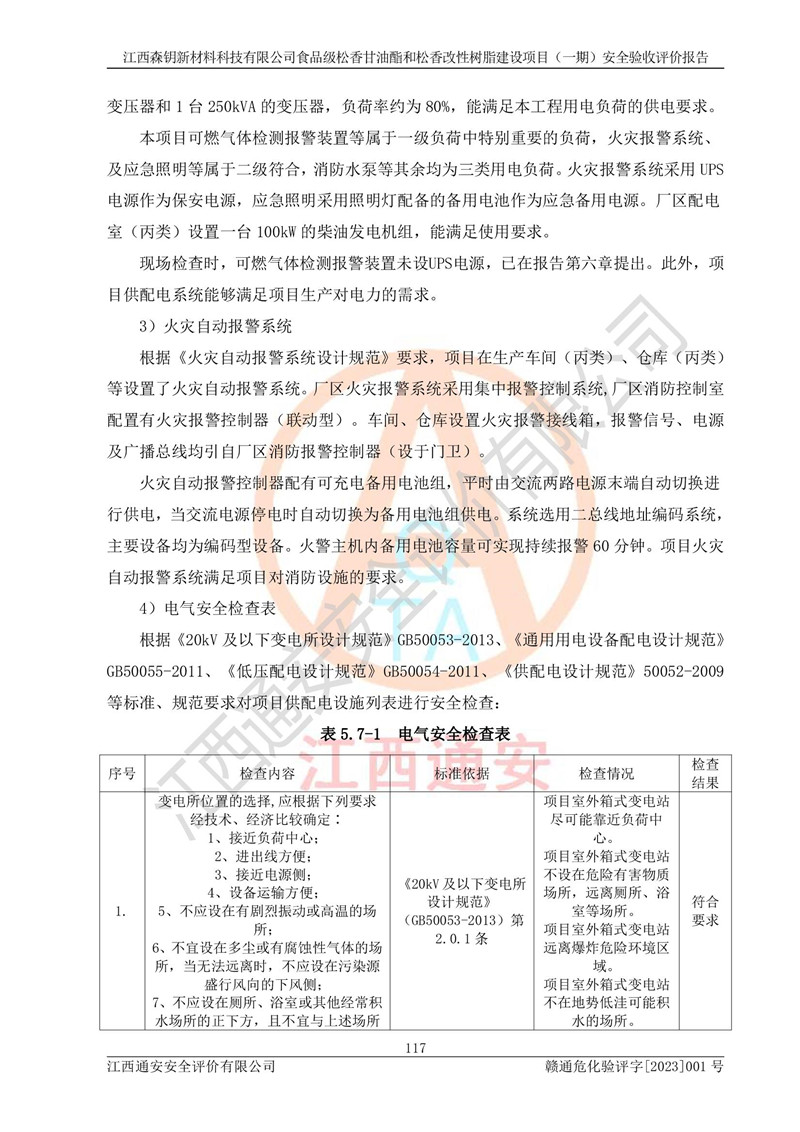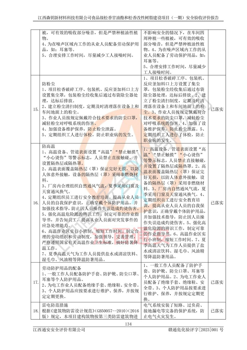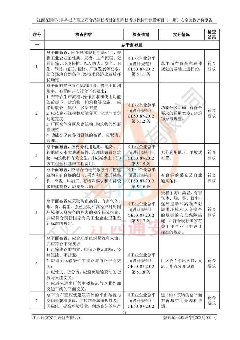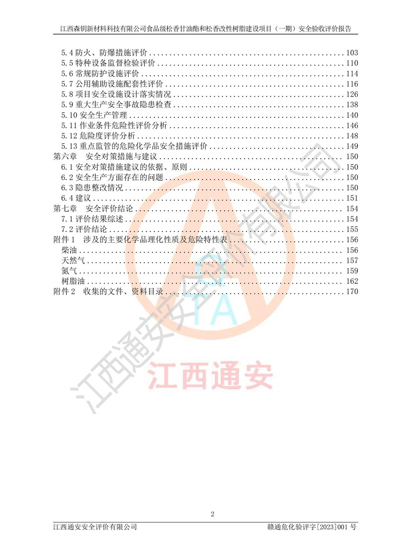 评价结论 | 本报告认为,江西森钥新材料科技有限公司食品级松香甘油酯和松香改性树脂建设项目(一期)生产装置现场情况与设计图纸一致,安全设施及安全管理符合**及有关部门关于安全生产法律、法规、标准的要求,安全风险程度是可以接受的,安全风险可控,符合安全生产条件,能够满足安全生产的要求,具备安全设施“三同时”验收条件。 | ||||
