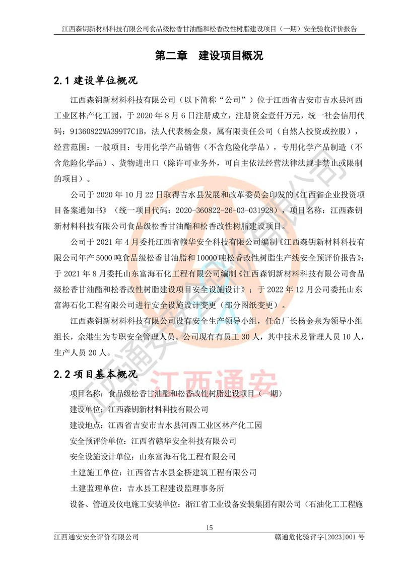 项目简介 | 江西森钥新材料科技有限公司(以下简称“公司”)位于江西省吉安市吉水县河西工业区林产化工园,于2020年8月6日注册成立,注册资金壹仟万元,统一社会信用代码:91360822MA399T7C1B,法人**杨金泉,属有限责任公司(自然人投资或控股),经营范围:一般项目:**化学产品销售(不含危险化学品),**化学产品制造(不含危险化学品)、货物进出口(除许可业务外,可自主依法经营法律法规非禁止或限制的项目)。 公司于2020年10月22日取得吉水县发展和改革委员会印发的《江西省企业投资项目备案通知书》(统一项目代码:2020-360822-26-03-031928),项目名称:江西森钥新材料科技有限公司食品级松香甘油酯和松香改性树脂建设项目。 公司于2021年4月委托江西省赣华安全科技有限公司编制《江西森钥新材料科技有限公司年产5000吨食品级松香甘油脂和10000吨松香改性树脂生产线安全预评价报告》;于2021年8月委托山东富海石化工程有限公司编制《江西森钥新材料科技有限公司食品级松香甘油酯和松香改性树脂建设项目安全设施设计》;于2022年12月公司委托山东富海石化工程有限公司进行安全设施设计变更(部分图纸变更)。 | ||||