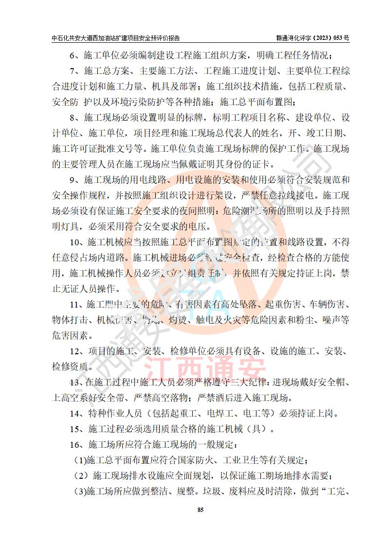 评价结论 | 中国石化销售股份有限公司江西九江共青城石油分公司共安大道西加油站扩建项目的选址、自然条件适宜该项目工程的建设;项目规划设计中的总体布局方案可行,符合有关法规、标准要求;项目选择的工艺过程及设备设施的安全可靠性能达到**法规、标准规定要求;项目存在的危险有害因素可控,在落实项目建设方案及评价报告提出的有关安全对策措施后,其危险有害程度能达到可以接受的程度,项目建设能够实现安全运行的目标。 | |||