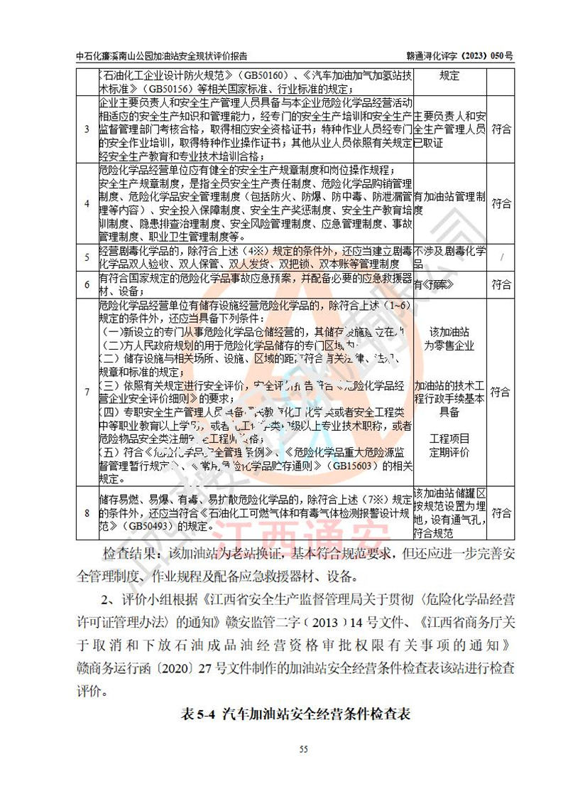 评价结论 | 中国石化销售股份有限公司江西九江濂溪石油分公司南山公园加油站涉及的安全条件、安全经营条件、安全生产管理符合《危险化学品经营许可证管理办法》、《汽车加油加气加氢站技术标准》等**有关法规、标准、规范要求,能满足危险化学品经营安全条件。 | |||