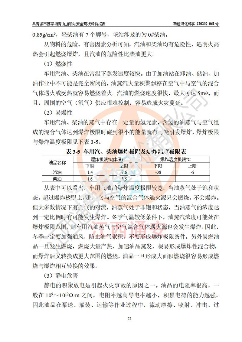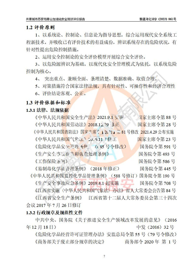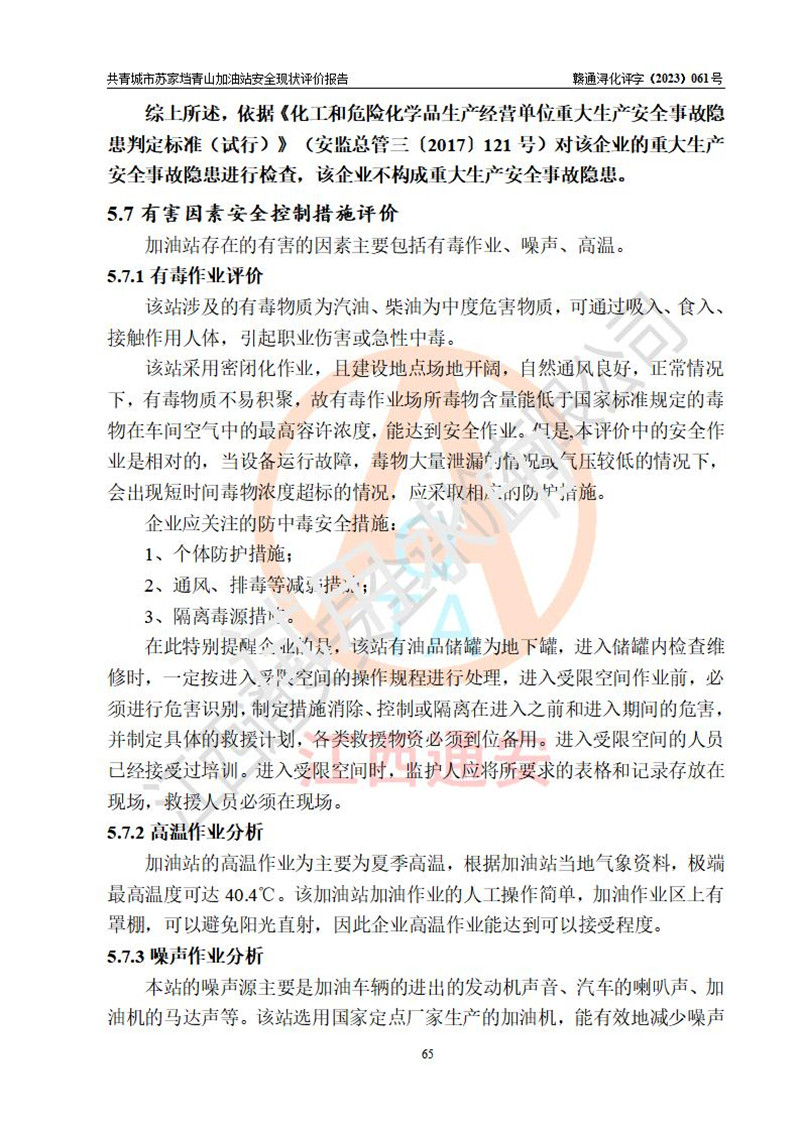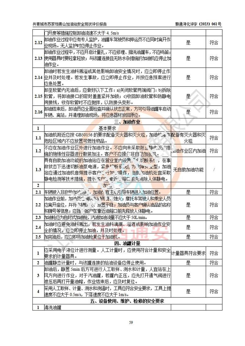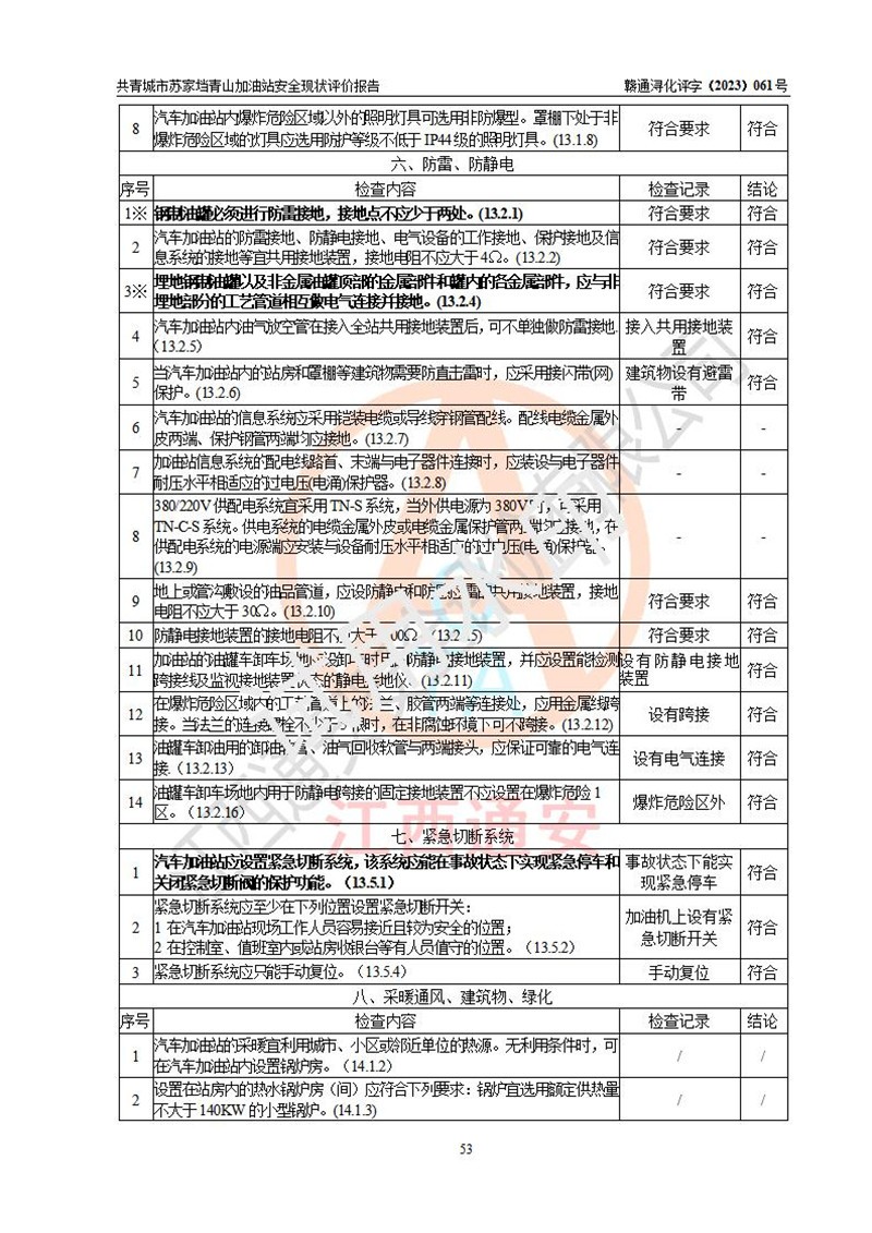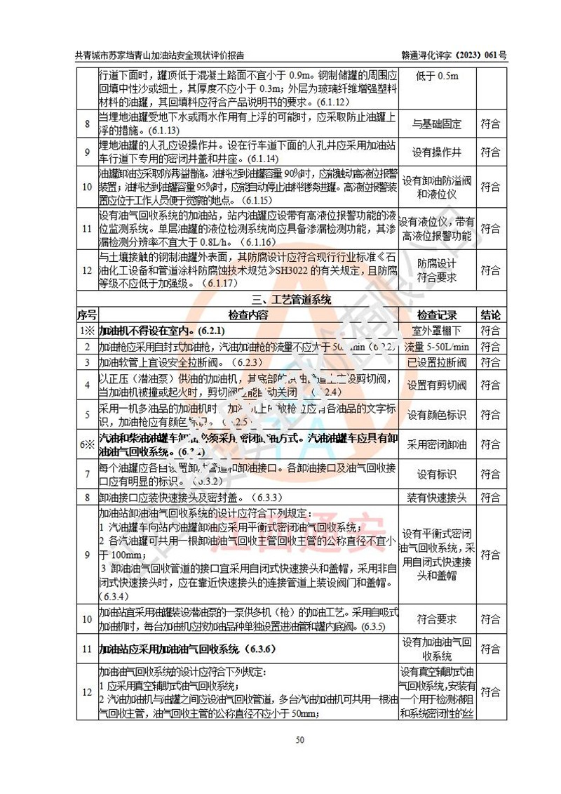 评价结论 | 共青城市苏家垱青山加油站涉及的安全条件、安全经营条件、安全生产管理符合《危险化学品经营许可证管理办法》、《汽车加油加气加氢站技术标准》等**有关法规、标准、规范要求,能满足危险化学品经营安全条件。 | |||