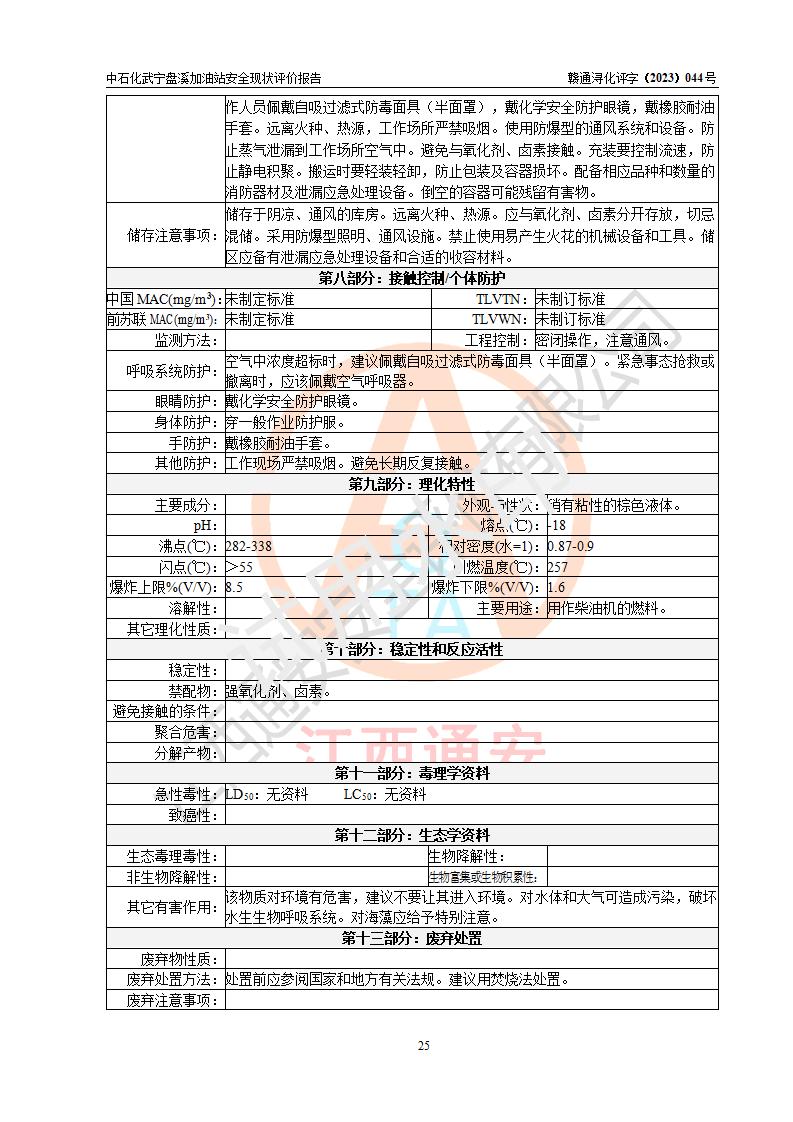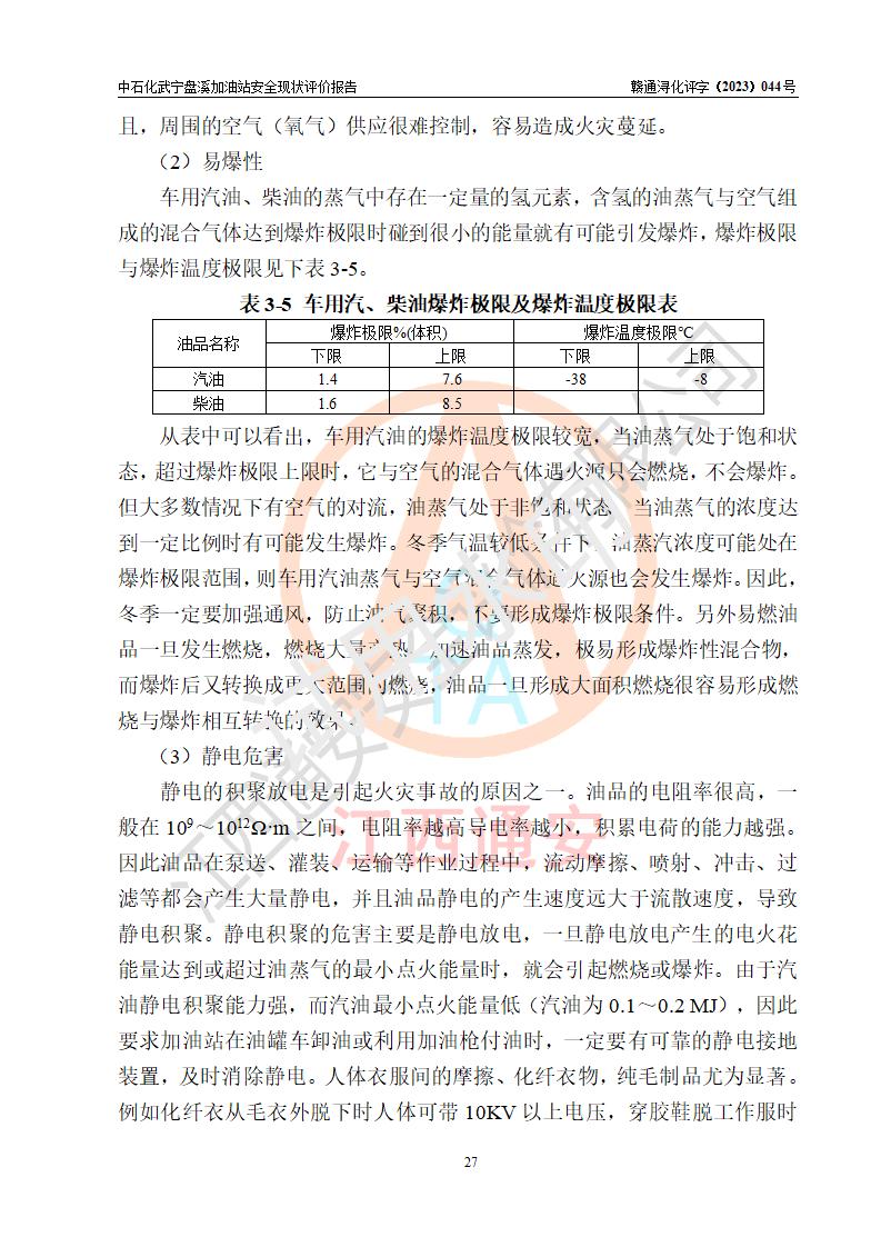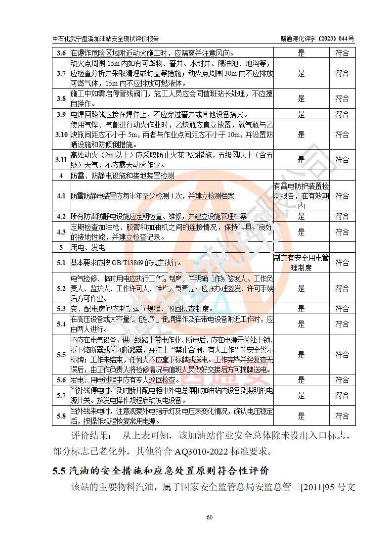评价结论 | 中国石化销售股份有限公司江西九江武宁石油分公司盘溪加油站储罐和通气管距站外通信线安全间距不足,企业整改后符合《汽车加油加气加氢站技术标准》中的相关要求,涉及的其他安全条件、安全经营条件、安全生产管理符合《危险化学品经营许可证管理办法》、《汽车加油加气加氢站技术标准》等**有关法规、标准、规范要求。 | |||