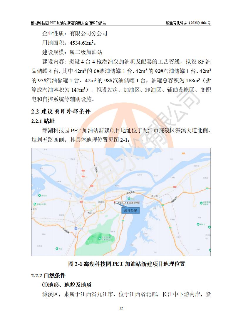 项目简介 | 九江利平能源有限公司于2023年02月10日取得营业执照,注册地址位于江西省九江市濂溪区濂溪大道699号,经营范围:成品油批发(不含危险化学品),润滑油销售(除依法经批准的项目外,凭营业执照依法自主开展经营活动)。依据九江市商务局文件(九商务字【2023】12号),在九江市濂溪区濂溪大道北侧、规划五路西侧新建一座二级加油站(站名为鄱湖科技园PET加油站)。 该项目已取得备案通知书,项目统一代码为2302-360402-04-01-989865,该项目的建设用地已取得九江市自然资源局颁发的不动产权证书:赣(2023)九江市不动产权第0045525号。 拟新建加油站总用地面积为4534.61m2,站内拟设4台4枪潜油泵加油机及配套的工艺管线,拟设SF油品储罐4台,其中42m3的0#柴油储罐1台、42m3的92#汽油储罐1台、42m3的95#汽油储罐1台、42m3的98#汽油储罐1台,油罐总容积为168m3(折算成汽油容积为147m3),按现行的《汽车加油加气加氢站技术标准》对加油站的等级划分,属二级加油站。 | |||