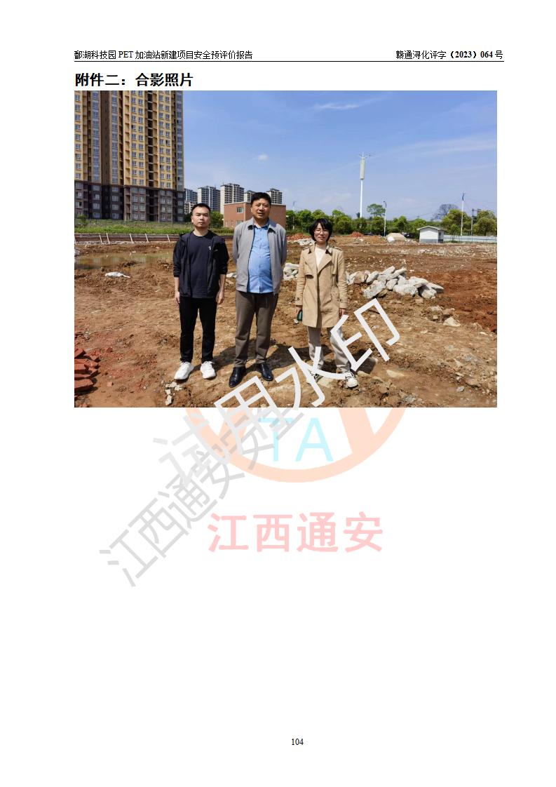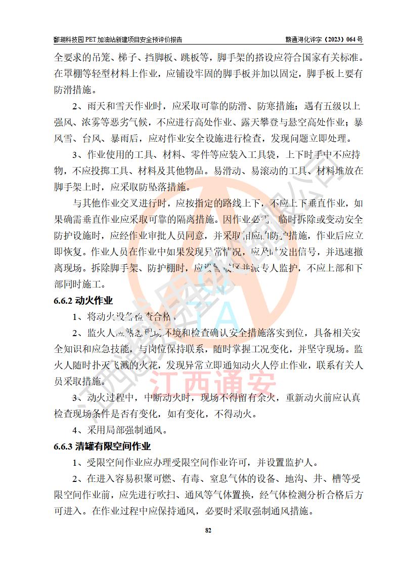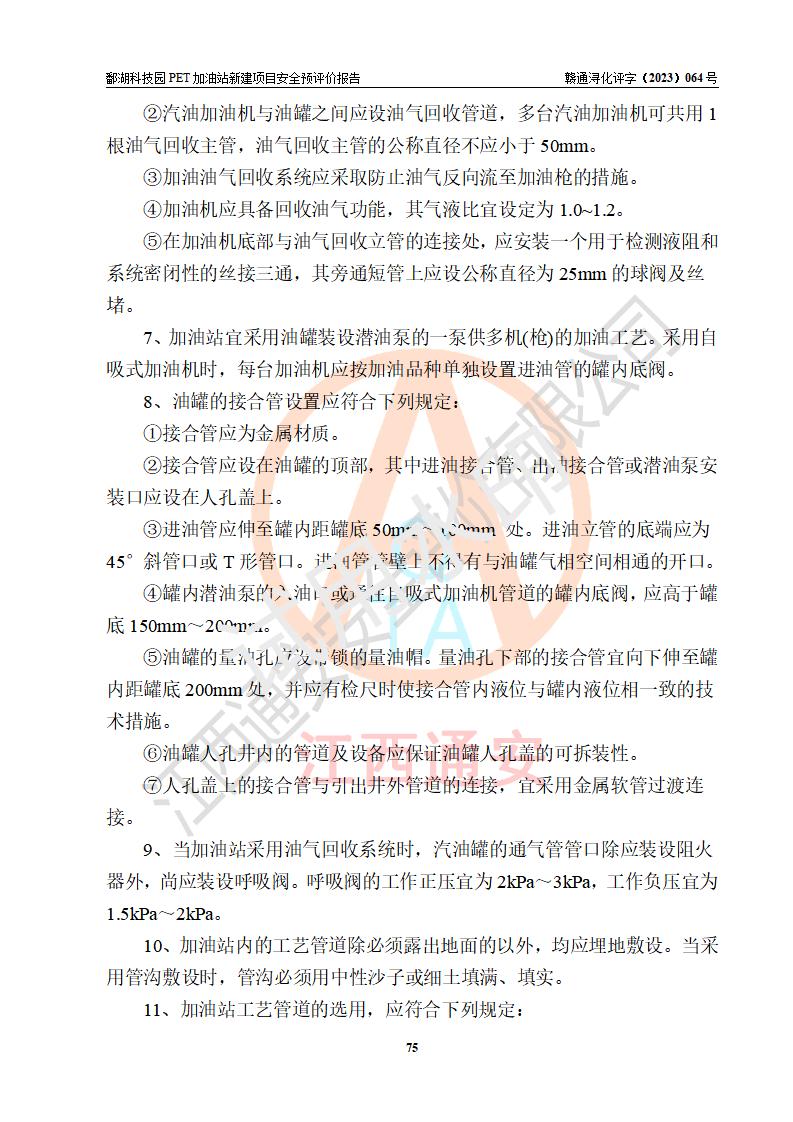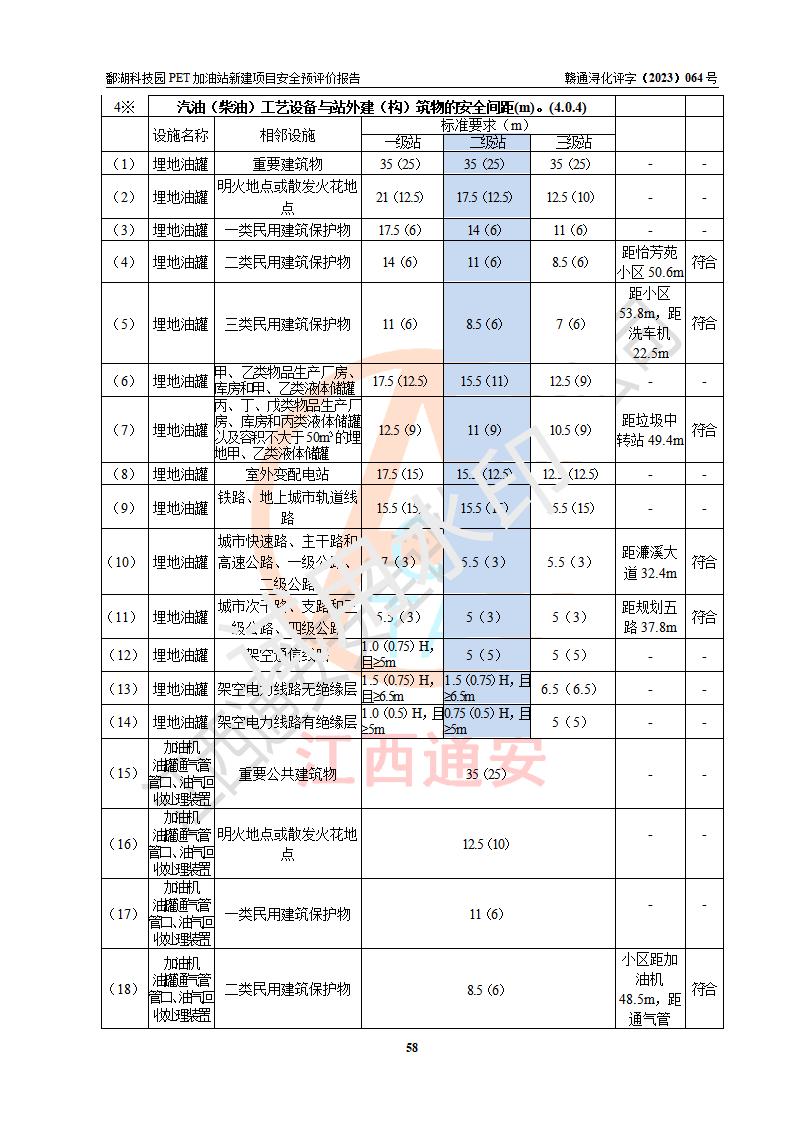 评价结论 | 鄱湖科技园PET加油站新建项目的选址、自然条件适宜该项目工程的建设;项目规划设计中的总体布局方案可行,符合有关法规、标准要求;项目选择的工艺过程及设备设施的安全可靠性能达到**法规、标准规定要求;项目存在的危险有害因素可控,在落实项目建设方案及评价报告提出的有关安全对策措施后,其危险有害程度能达到可以接受的程度,项目建设能够实现安全运行的目标。 | |||