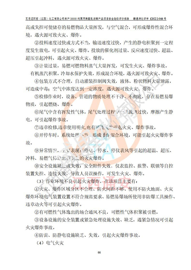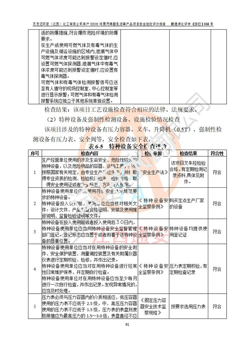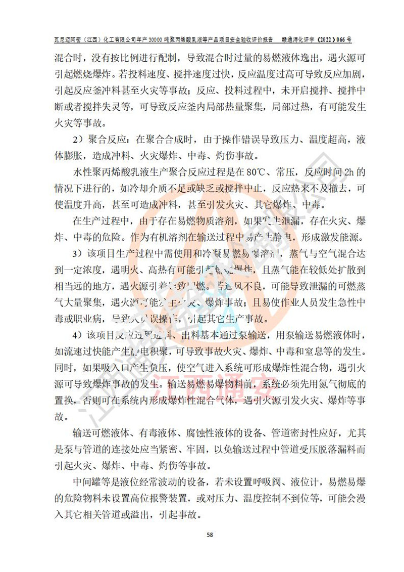评价结论 | 经评价组评价,瓦尼迈阿密(江西)化工有限公司年产30000吨聚丙烯酸乳液等产品项目现场总体布局、设备布置、自控系统情况与安全设计变更图纸一致;企业在役装置涉及重点监管危险化学品,相关自控系统配置与安全设计变更相符并正常投用;企业主要负责人、安全负责人均不属于新入职,企业主要负责人及安全负责人已取得危险化学品生产企业主要负责人及安全管理人员考核合格证,符合三年专项整治要求。 瓦尼迈阿密(江西)化工有限公司年产30000吨聚丙烯酸乳液等产品项目配套安全装置、防护设施以及采取的安全技术措施及安全管理措施符合**有关法规、标准、规范要求,在落实本评价报告有关对策措施后,项目风险可控,其安全生产条件和安全管理方面具备竣工安全验收的条件。 | |||||||