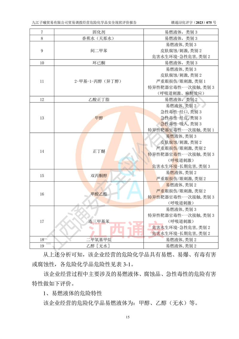 项目简介 | 九江子曦贸易有限公司是一家从事**化学产品销售等业务的公司,成立于2023年05月25日,注册资本30万元,法定**人刘希,经营场所位于江西省九江市浔阳区浔阳路2号商务大楼6层6E-1室,属租赁场所。该企业经营方式为不带储存设施经营危险化学品,即贸易调拨经营危险化学品,企业不涉及危险化学品的运输、储存、店面零售、经营场所样品摆放。 该企业经营的含易燃溶剂的合成树脂、油漆、辅助材料、涂料等制品[闭环闪点≤60°C]、醇酸树脂、丙烯酸酯类树脂涂料(含溶剂)、固化剂、香蕉水(天那水)、间二甲苯、环已酮、2-甲基-1-丙醇(异丁醇)、乙酸正丁脂、甲醇、正丁醚、双**醇、甲酸乙酯、连**基苯、二甲氧基甲烷、乙醇[无水]属于危险化学品。 | |||