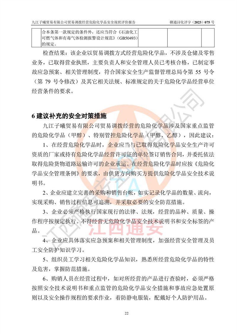 评价结论 | 九江子曦贸易有限公司贸易调拨经营危险化学品的安全条件符合**有关法规、标准、规范要求,落实评价报告有关建议后,风险可控,具备危险化学品经营安全条件。 | |||
