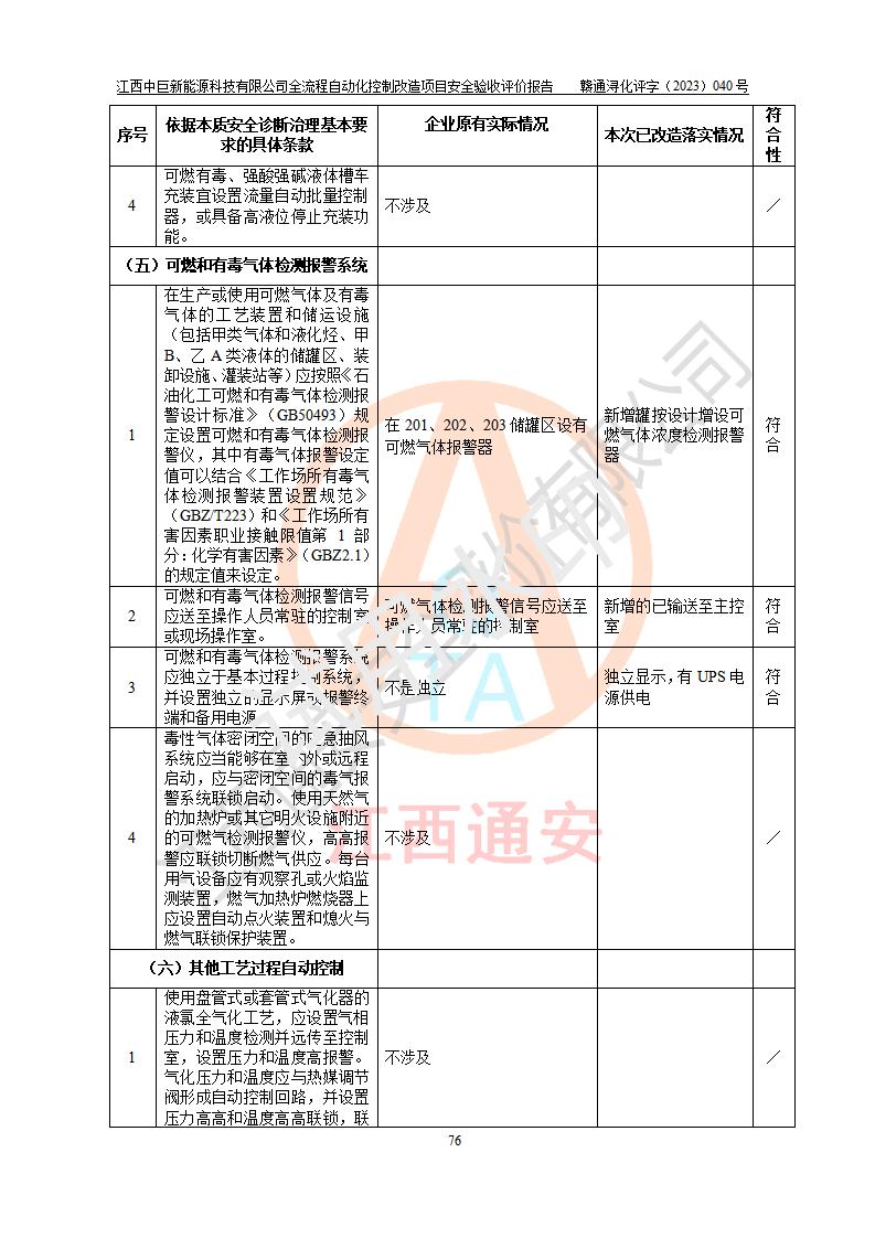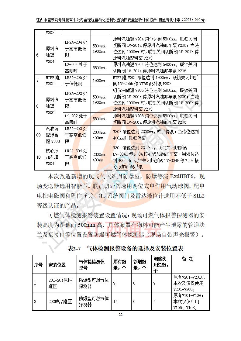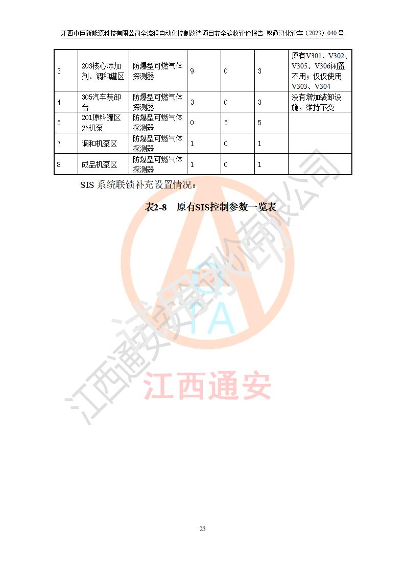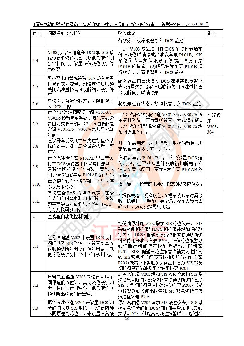 评价结论 | 江西中巨新能源科技有限公司10万t/a复合无铅催化醇醚汽油生产线全流程自动化控制改造项目自控设施生产现场情况与安全设计图纸一致(资质单位设计),按设计要求,完善了PLC、SIS、GDS系统。项目选择的仪表设备设施的安全可靠性能达到赣应急字〔2021〕190 号文件等**法规、标准规定要求。 项目风险可控,其安全生产条件和安全管理方面具备竣工安全验收的条件。 | |||||