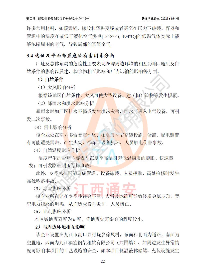 评价结论 | 湖口县中旺渔业服务有限公司外部防护距离和总平面布局符合《建筑设计防火规范2018年版》(GB50016-2014 )、《氧气站设计规范》(GB50030-2013)等标准规范要求,其他方面按相关法规、规范要求落实相应的技术设施和安全管理措施,其风险可控,能达到可以接受的程度,可满足安全生产条件。 | |||