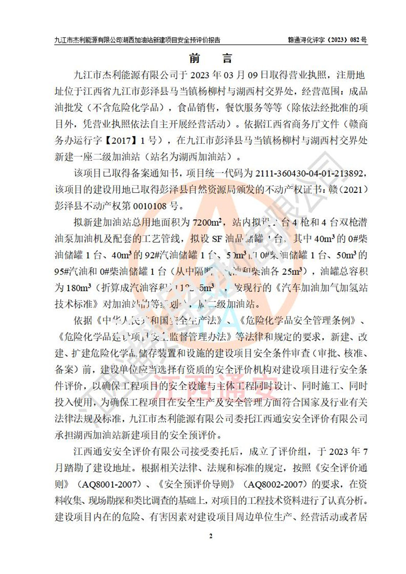 评价报告名称 | 九江市杰利能源有限公司湖西加油站新建项目安全预评价报告 | |||