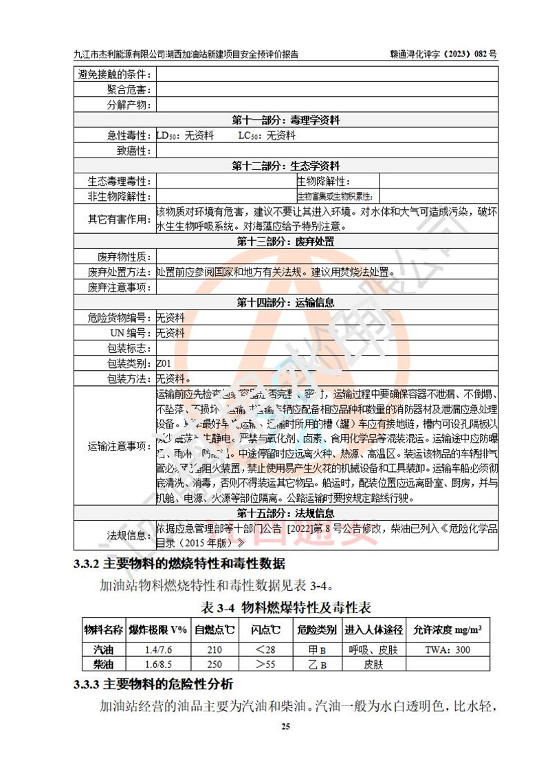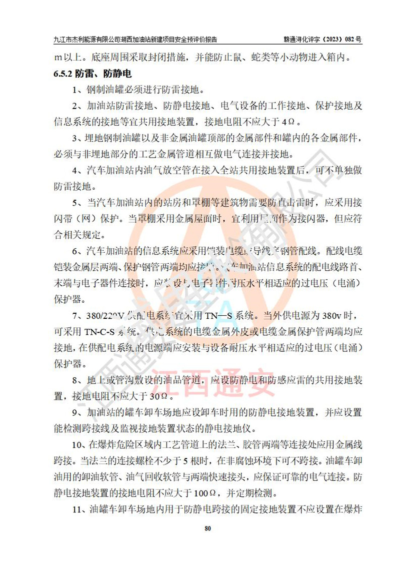 评价结论 | 九江市杰利能源有限公司湖西加油站新建项目的选址、自然条件适宜该项目工程的建设;项目规划设计中的总体布局方案可行,符合有关法规、标准要求;项目选择的工艺过程及设备设施的安全可靠性能达到**法规、标准规定要求;项目存在的危险有害因素可控,在落实项目建设方案及评价报告提出的有关安全对策措施后,其危险有害程度能达到可以接受的程度,项目建设能够实现安全运行的目标。 | |||