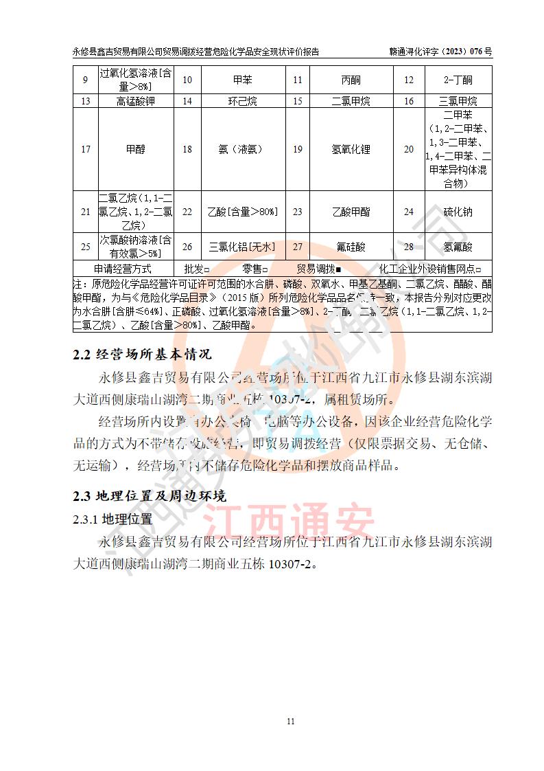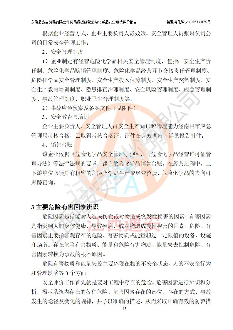 评价报告名称 | 永修县鑫吉贸易有限公司贸易调拨经营危险化学品安全现状评价报告 | ||||
