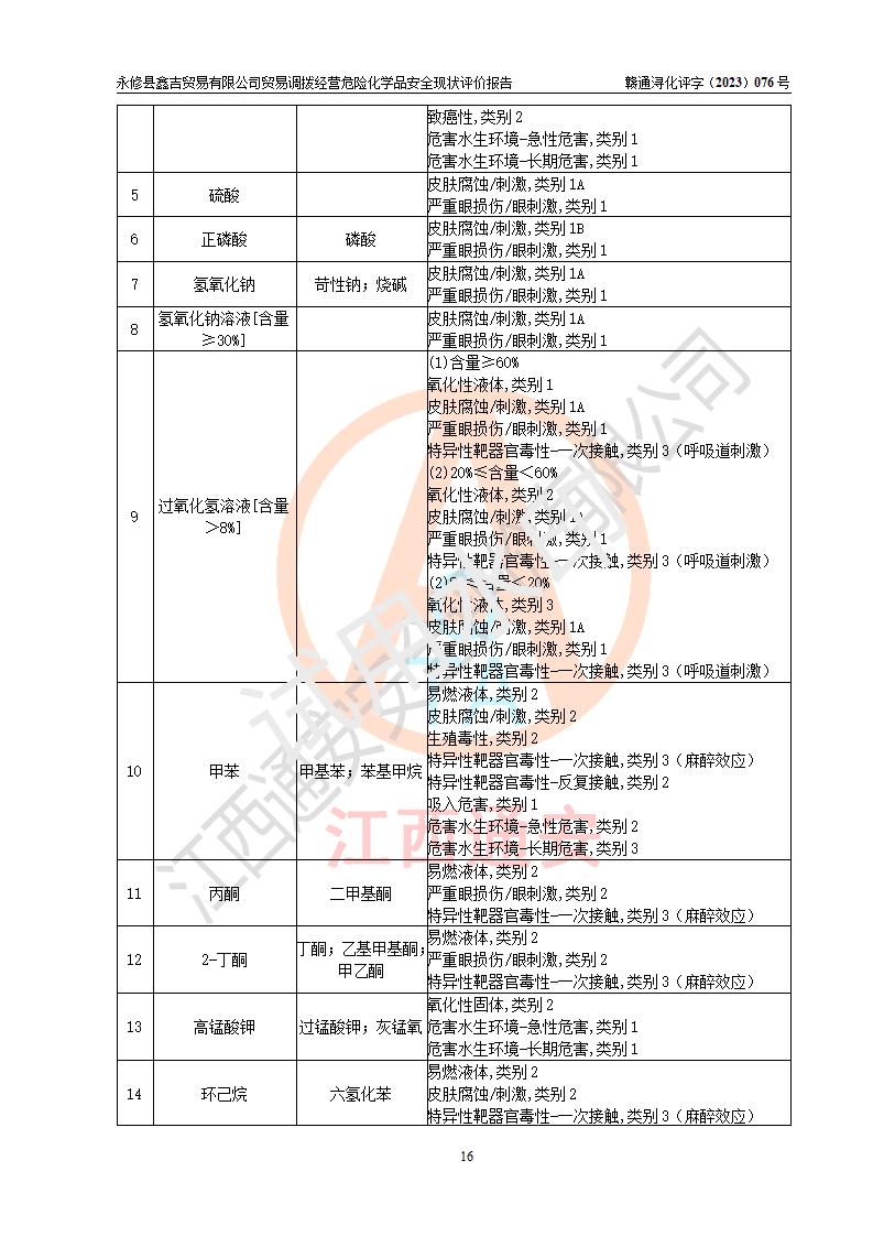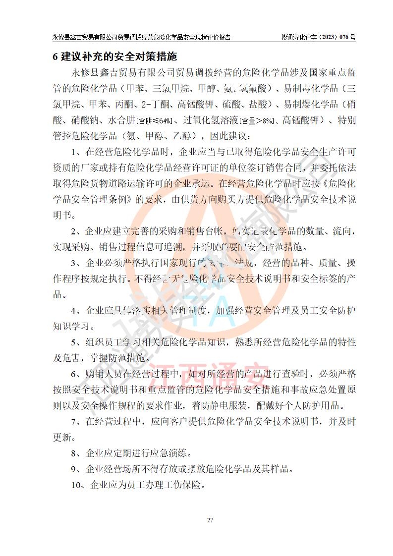 评价结论 | 该企业应重点防范经营的危险化学品具有的相应危险、有害因素。应重点关注的安全对策措施:应当向已取得危险化学品安全生产许可证的厂家或持有危险化学品经营许可证的单位采购危险化学品;经营有化学品安全技术说明书、化学品安全标签的危险化学品;经营的危险化学品委托具有相应资质的运输单位承运。 永修县鑫吉贸易有限公司贸易调拨经营危险化学品的安全条件符合**有关法规、标准、规范要求,落实评价报告有关建议后,风险可控,具备危险化学品经营安全条件。 | ||||
