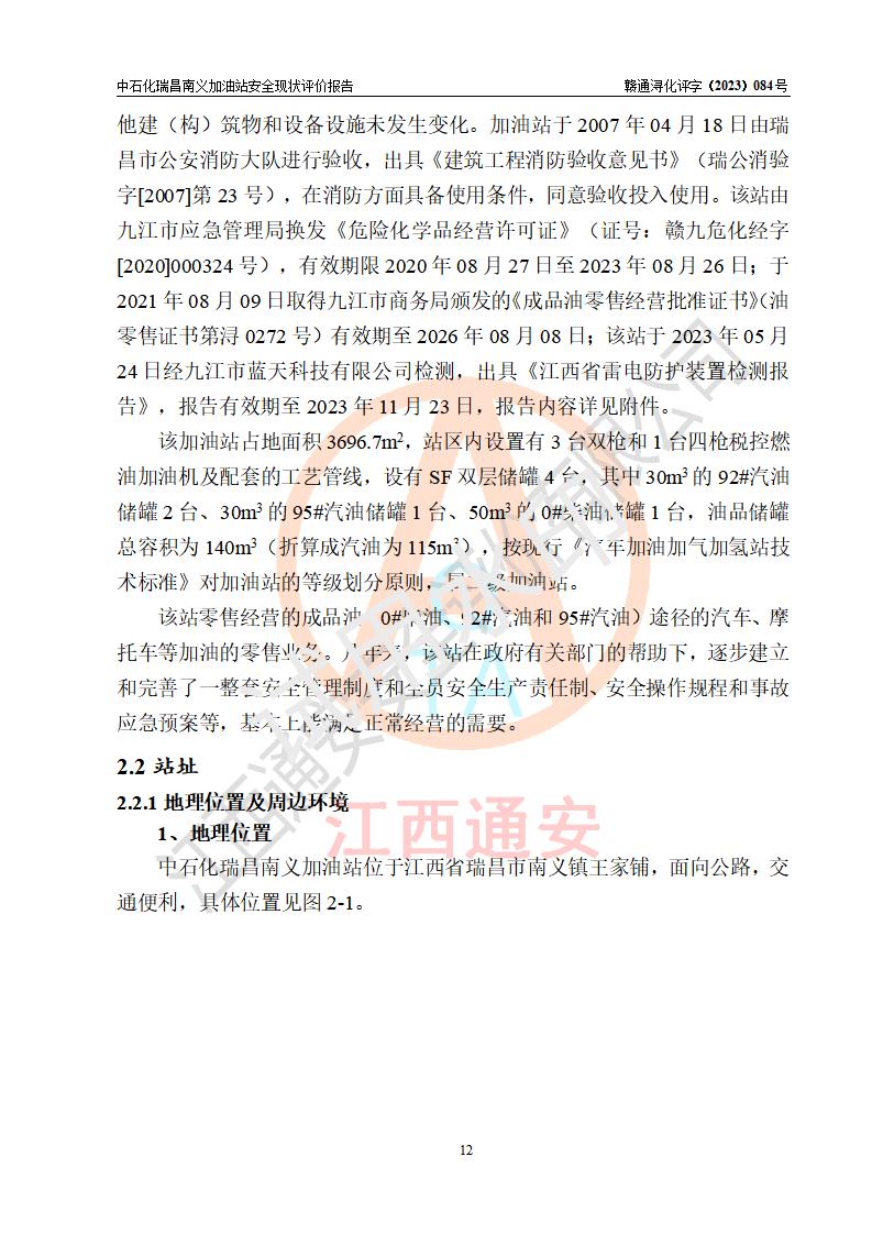 项目简介 | 中国石化销售股份有限公司江西九江瑞昌石油分公司南义加油站是一家专门从事成品油零售经营的有限公司分公司(外商投资企业分公司),经营场所位于江西省瑞昌市南义镇王家铺。现有从业人员4名,其中安全管理人员1人,加油站负责人陈小勇。 该加油站占地面积3696.7m2,站区内设置有3台双枪和1台四枪税控燃油加油机及配套的工艺管线,设有SF双层储罐4台,其中30m3的92#汽油储罐2台、30m3的95#汽油储罐1台、50m3的0#柴油储罐1台,油品储罐总容积为140m3(折算成汽油为115m3),按现行《汽车加油加气加氢站技术标准》对加油站的等级划分原则,属二级加油站。 该站由九江市应急管理局换发《危险化学品经营许可证》(证号:赣九危化经字[2020]000324号),**期限2020年08月27日至2023年08月26日。 | |||