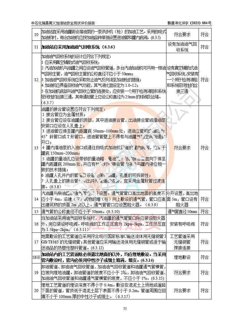 评价结论 | 中国石化销售股份有限公司江西九江瑞昌石油分公司南义加油站涉及的安全条件、安全经营条件、安全生产管理符合《危险化学品经营许可证管理办法》、《汽车加油加气加氢站技术标准》等**有关法规、标准、规范要求,能满足危险化学品经营安全条件。 | |||
