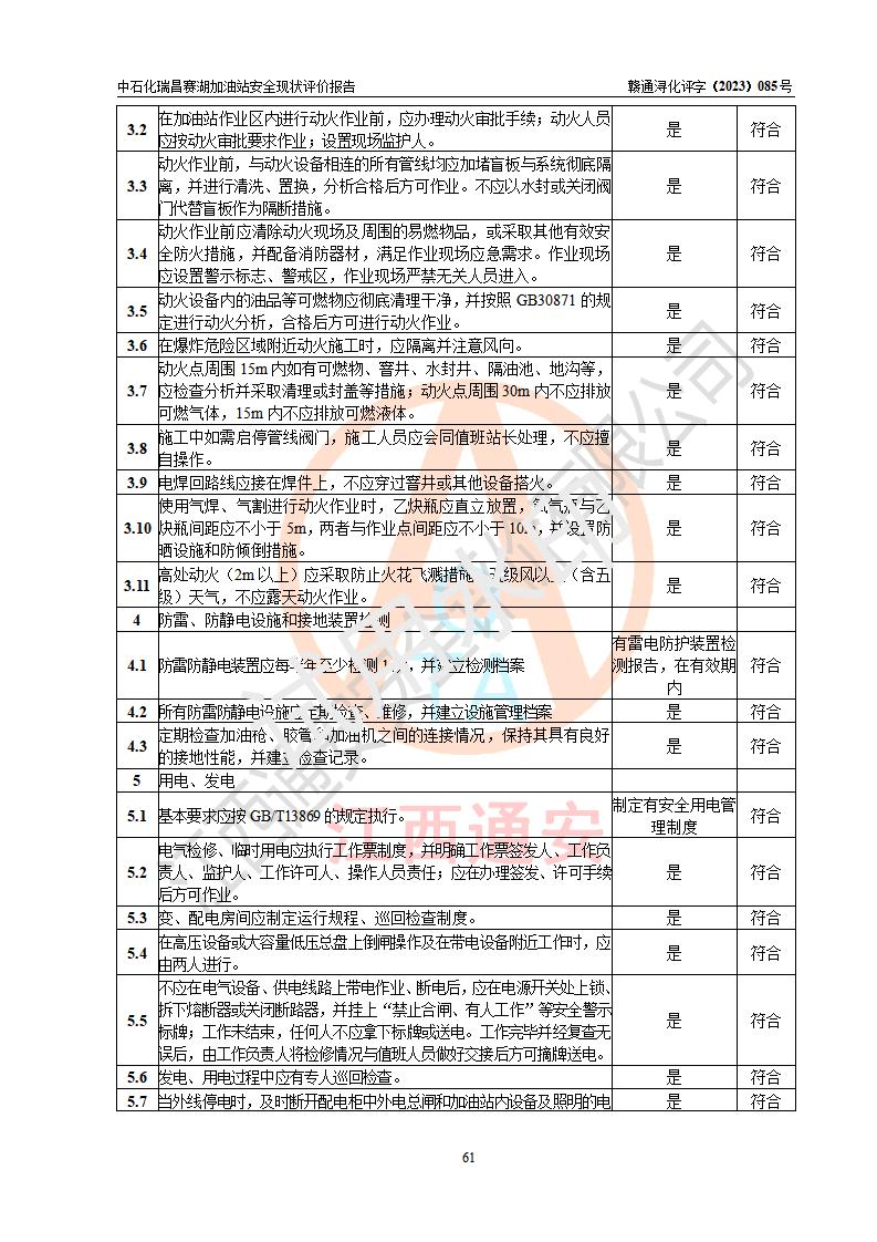评价结论 | 中国石化销售股份有限公司江西九江瑞昌石油分公司赛湖加油站涉及的安全条件、安全经营条件、安全生产管理符合《危险化学品经营许可证管理办法》、《汽车加油加气加氢站技术标准》等**有关法规、标准、规范要求,能满足危险化学品经营安全条件。 | |||