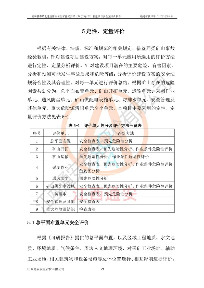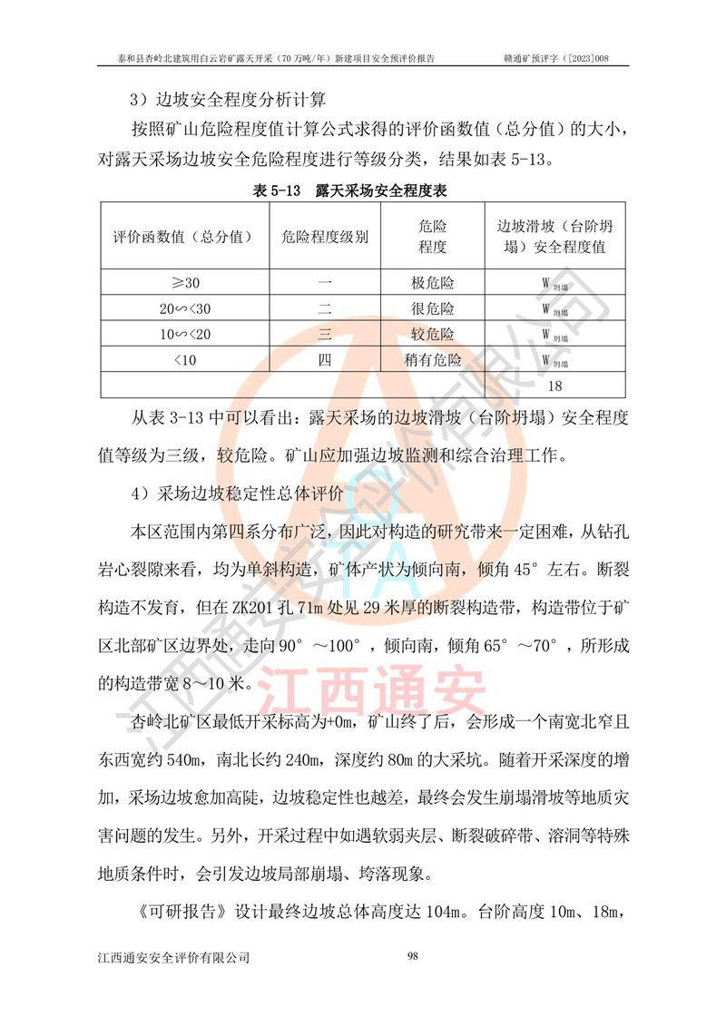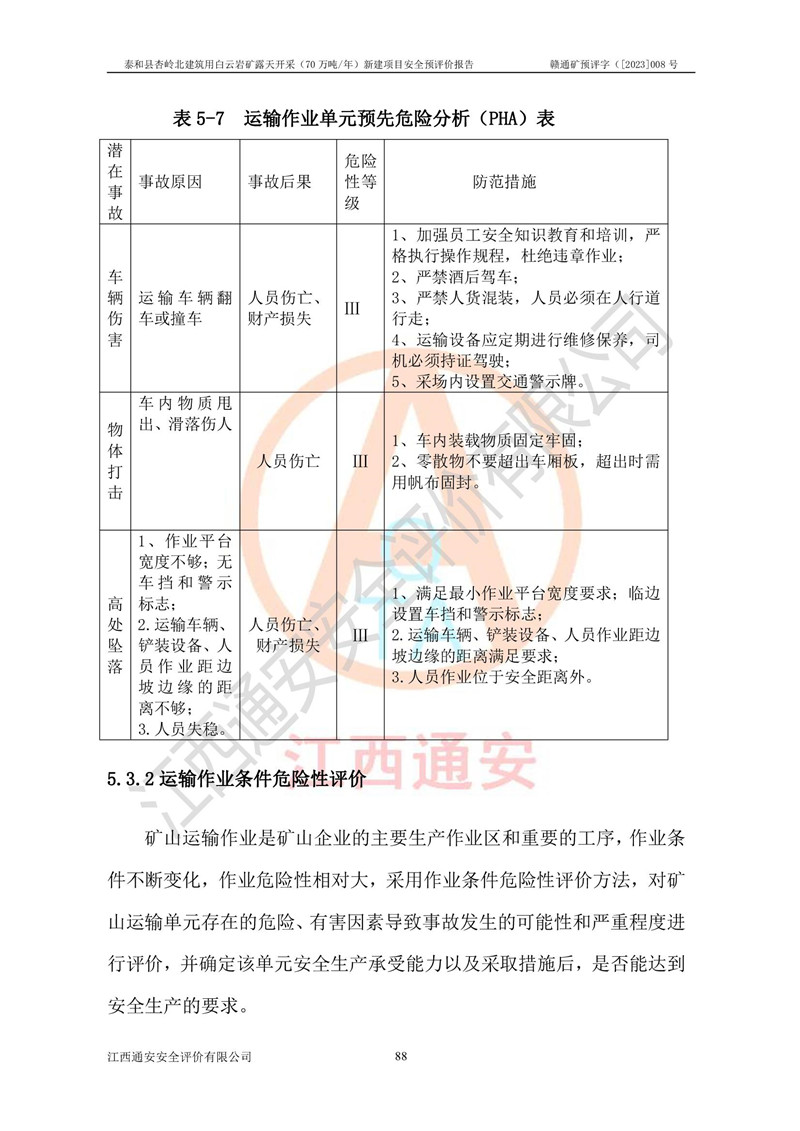 评价结论 | 1、本建设项目拟定的开采方案、采用的采矿工艺及各系统的安全设施基本符合安全生产法律、法规和行业安全技术规范的要求。 2、在建设施工及生产运行中,如能严格执行**有关安全生产法律、法规和有关标准、规范,认真落实《可研报告》提出的安全措施,并合理采纳本报告中提出的安全对策措施及建议,项目的主要危险、有害因素可得到较好控制,本评价项目安全生产风险在可接受范围。 结论:泰和县杏岭北建筑用白云岩矿露天开采(70万吨/年)新建项目从安全生产角度符合**有关安全生产法律、法规、规章、标准和规范的要求,风险可以接受。 | ||||