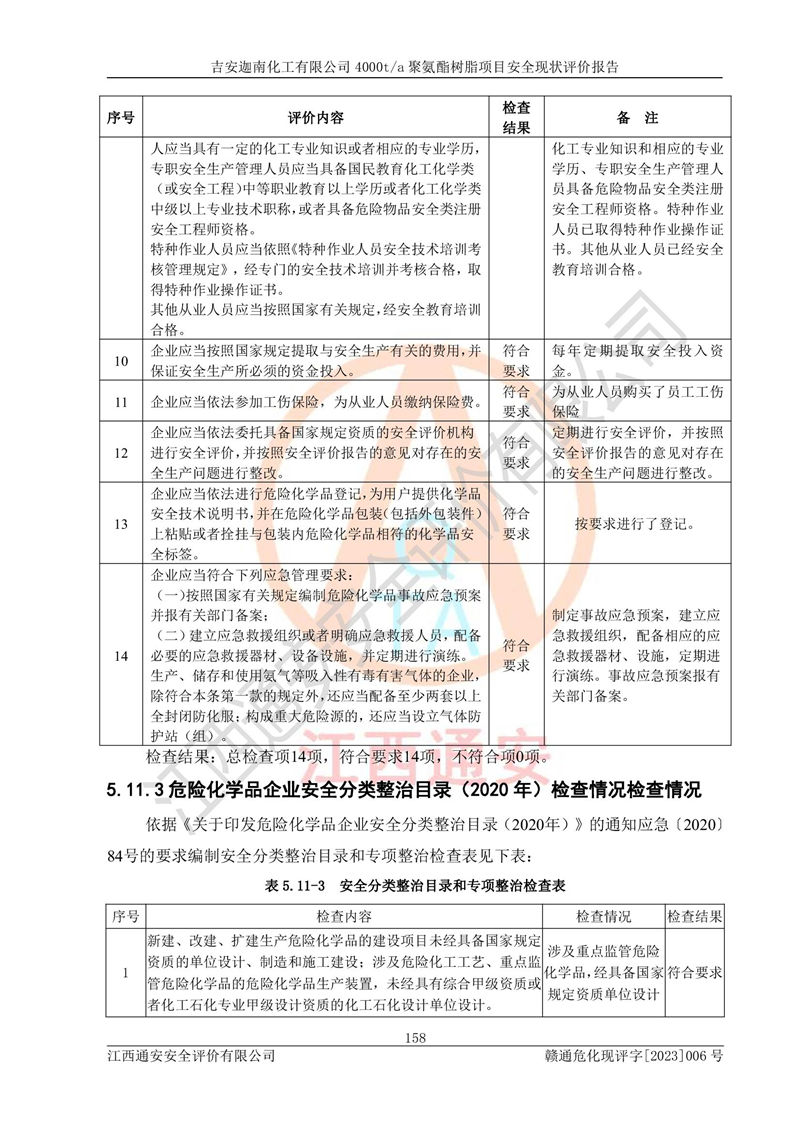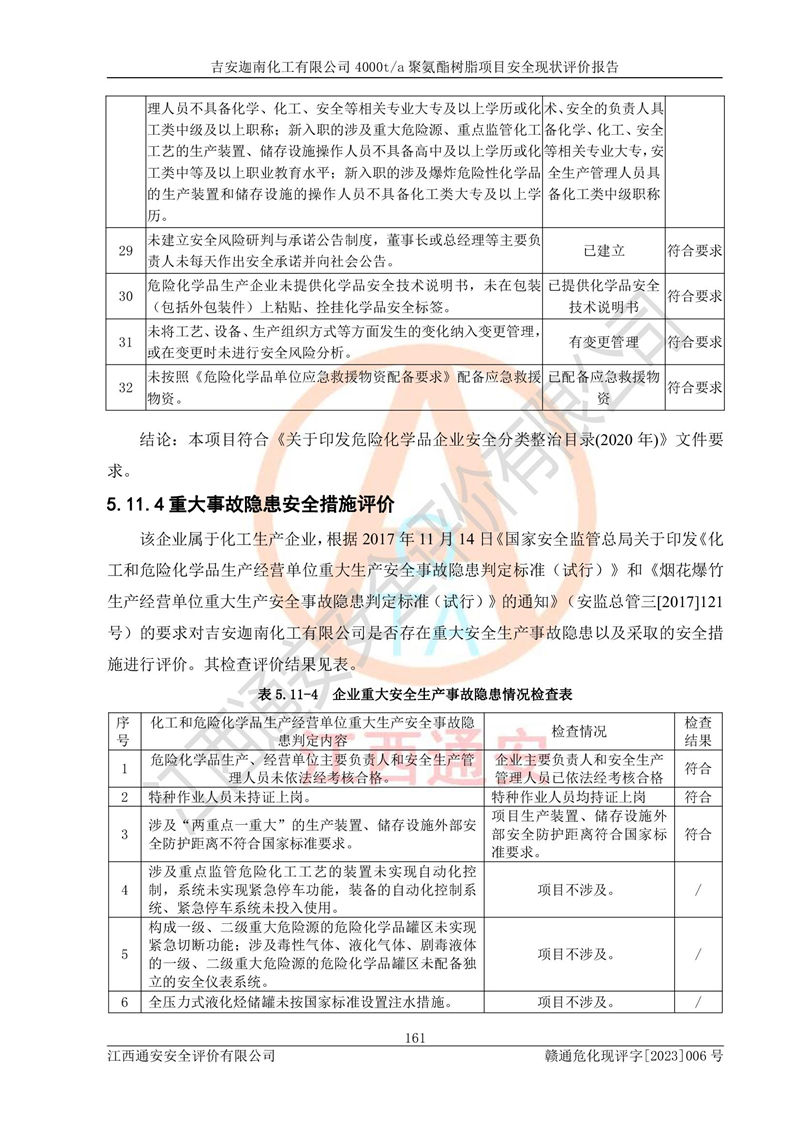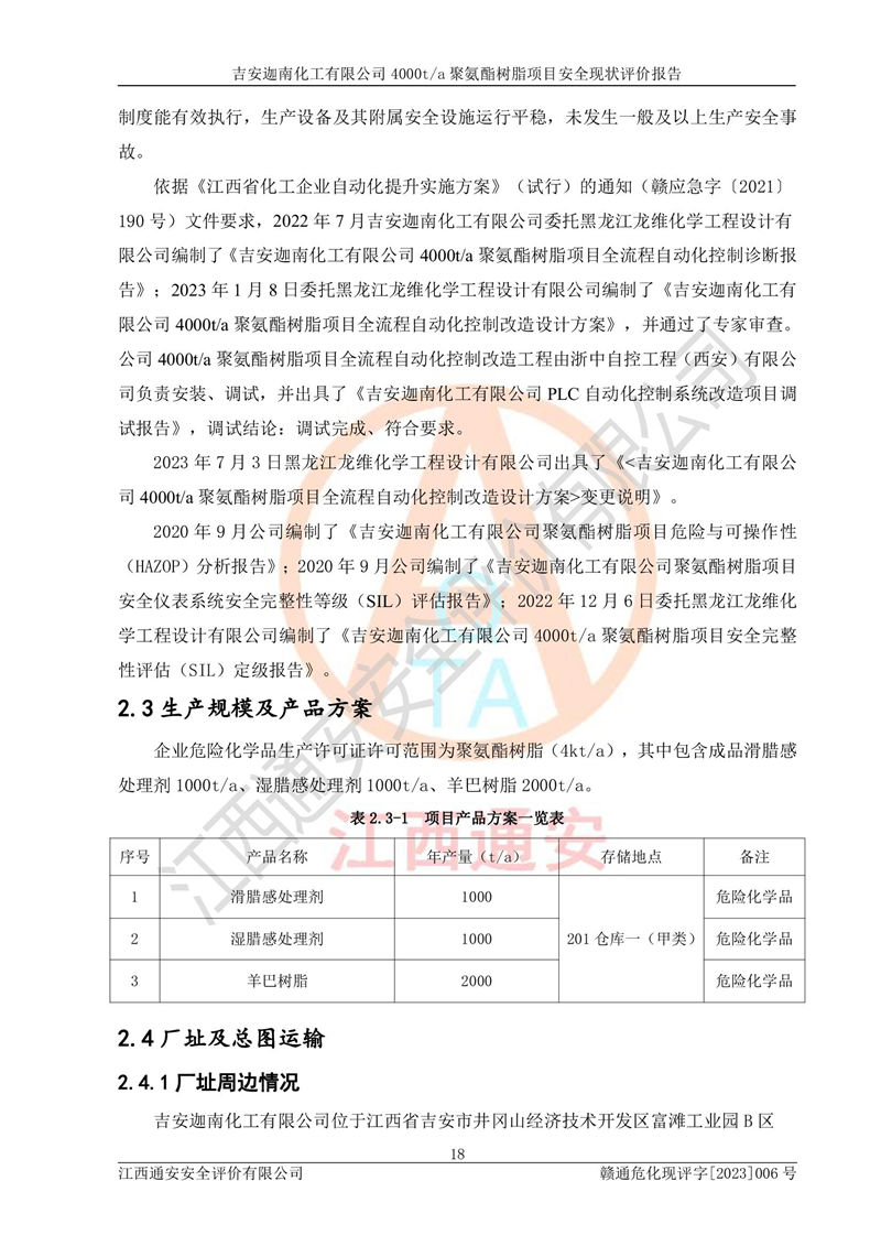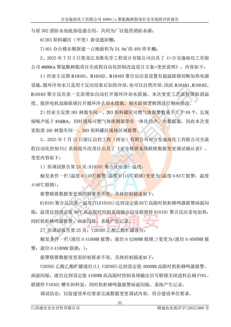 评价结论 | 本报告认为,吉安迦南化工有限公司4000t/a聚氨酯树脂项目在役生产装置现场情况与设计图纸一致,《吉安迦南化工有限公司4000t/a聚氨酯树脂项目全流程自动化控制改造工程设计方案》和《<吉安迦南化工有限公司4000t/a聚氨酯树脂项目全流程自动化控制改造设计方案>变更说明》中提出的控制措施已得到落实,企业控制系统设置情况与设计方案一致,由具有**相应资质的单位进行设计、施工,施工单位对自动控制系统调试合格,并出具了竣工图,自动化控制系统运行正常,有关从业人员资质符合《危险化学品生产企业安全生产许可证实施办法》要求,安全设施及安全管理符合**及有关部门关于安全生产法律、法规、标准的要求,安全风险是可以控制的,其风险程度是可以接受的,安全现状符合安全生产条件,能够满足安全生产的要求。 | ||||