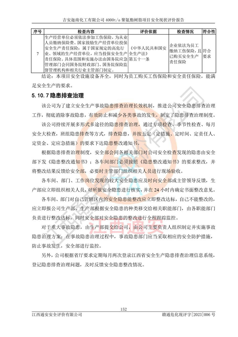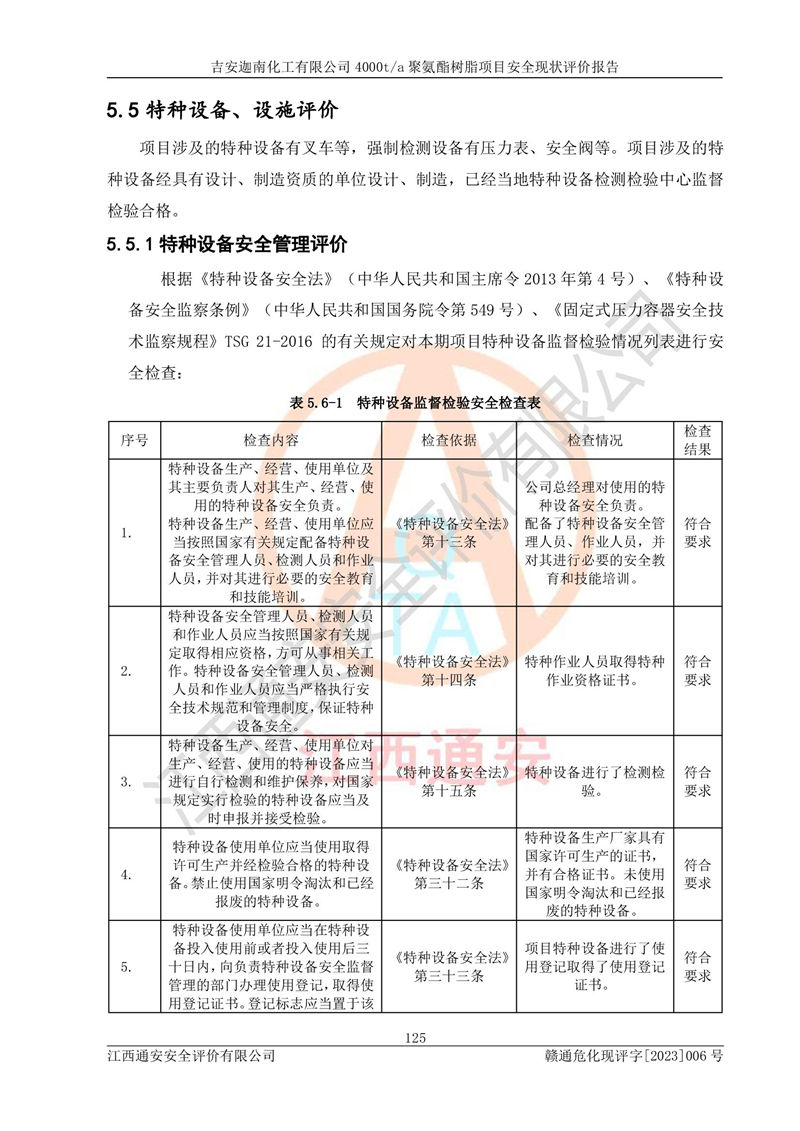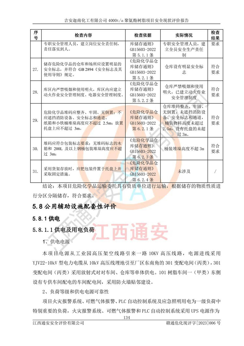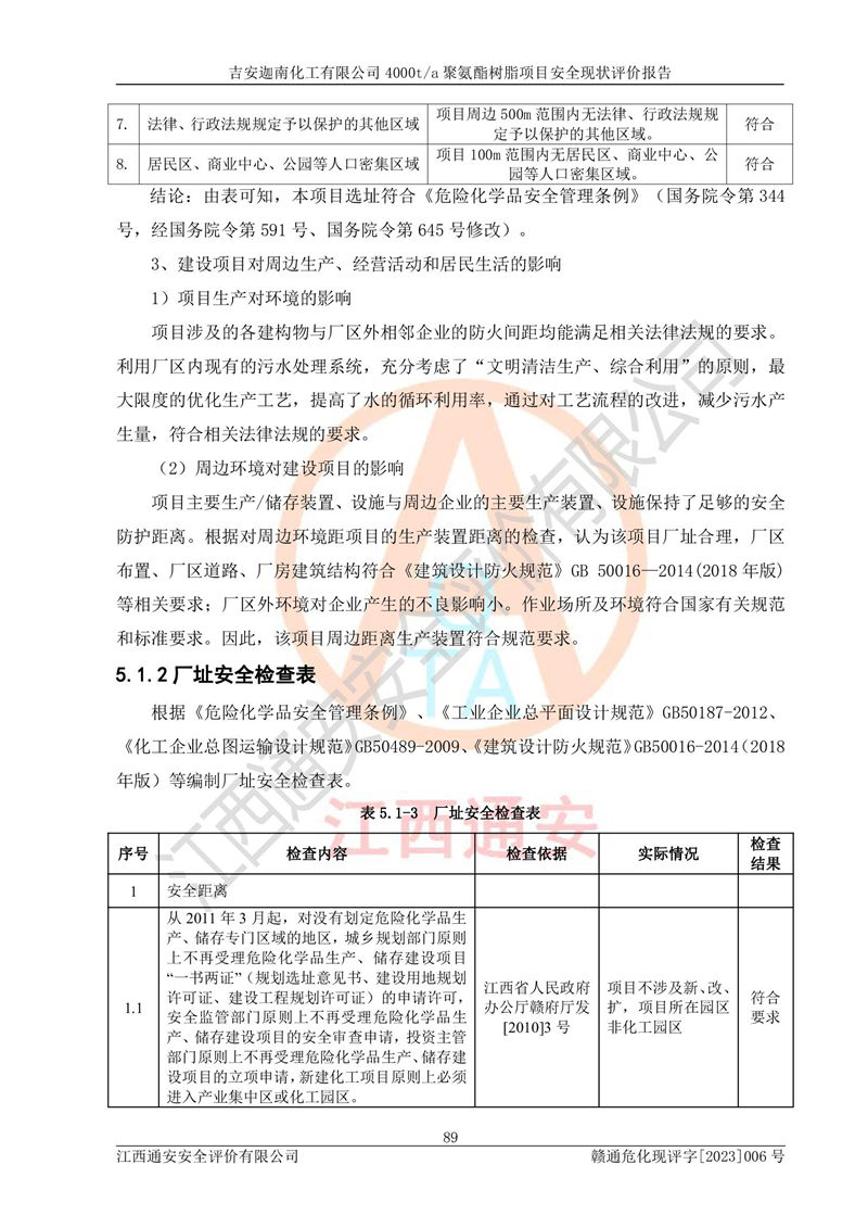 评价结论 | 本报告认为,吉安迦南化工有限公司4000t/a聚氨酯树脂项目在役生产装置现场情况与设计图纸一致,《吉安迦南化工有限公司4000t/a聚氨酯树脂项目全流程自动化控制改造工程设计方案》和《<吉安迦南化工有限公司4000t/a聚氨酯树脂项目全流程自动化控制改造设计方案>变更说明》中提出的控制措施已得到落实,企业控制系统设置情况与设计方案一致,由具有**相应资质的单位进行设计、施工,施工单位对自动控制系统调试合格,并出具了竣工图,自动化控制系统运行正常,有关从业人员资质符合《危险化学品生产企业安全生产许可证实施办法》要求,安全设施及安全管理符合**及有关部门关于安全生产法律、法规、标准的要求,安全风险是可以控制的,其风险程度是可以接受的,安全现状符合安全生产条件,能够满足安全生产的要求。 | ||||