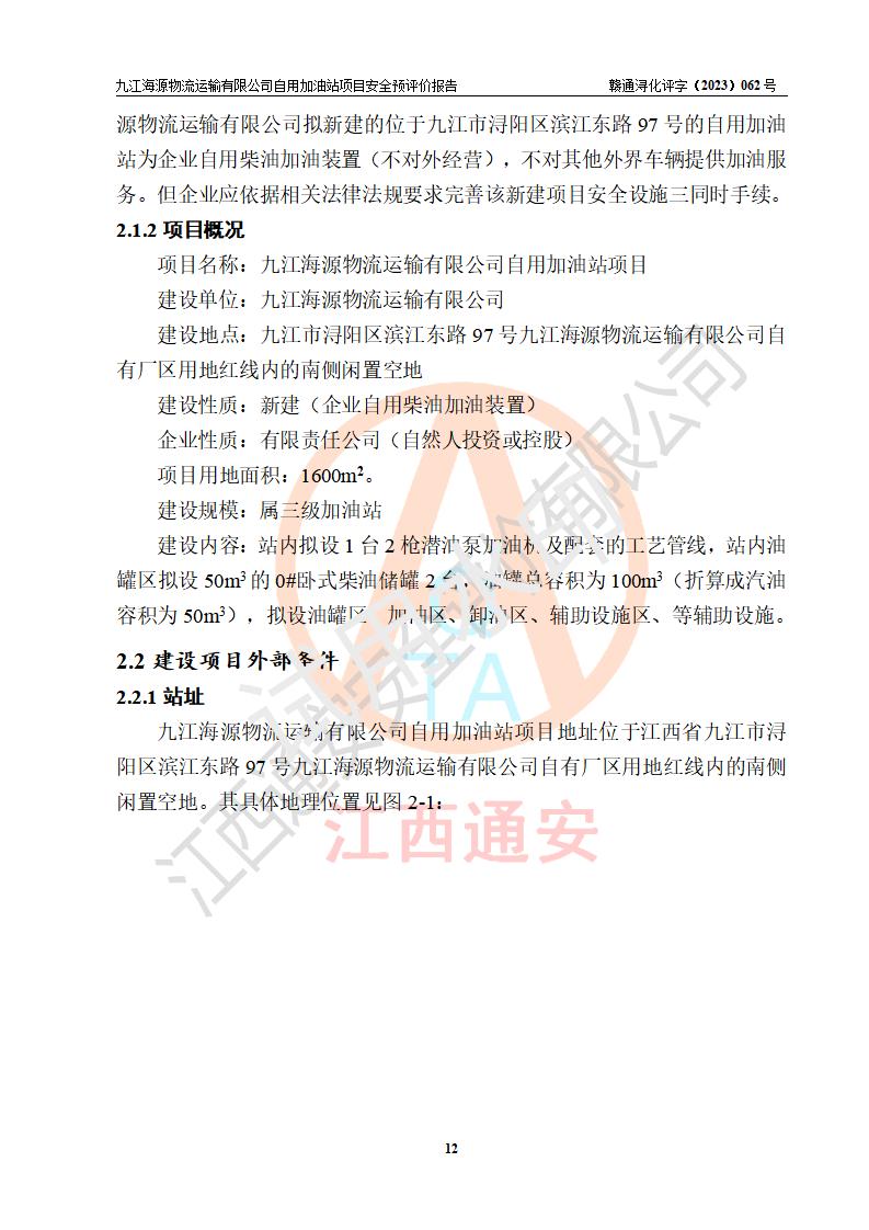 项目简介 | 九江海源物流运输有限公司是一家从事普通货物道路运输、危险货物运输、汽车维修、物流服务、仓储服务、货运信息服务等业务的公司,成立于2018年04月13日。公司办公地址位于江西省九江市浔阳区长虹北路22号丰源克拉城公寓13栋131号。 九江海源物流运输有限公司为了满足公司自有普通货物道路运输**及危险货物运输**(注:公司危险货物运输**主要为液碱运输**)内部加油的需要,拟在江西省九江市浔阳区滨江东路97号九江海源物流运输有限公司自有厂区用地红线内的南侧闲置空地新建一处自用加油站,该企业拟新建的企业自用加油站占地面积约为1600m2,站内拟设1台2枪潜油泵加油机及配套的工艺管线,站内油罐区拟设50m3的0#卧式柴油储罐2台,油罐总容积为100m3(折算成汽油容积为50m3),按现行的《汽车加油加气加氢站技术标准》对加油站的等级划分,属三级加油站。 依据《应急管理部办公厅关于认真做好柴油安全许可有关工作的通知》,九江海源物流运输有限公司拟新建的位于九江市浔阳区滨江东路97号的自用加油站为企业自用柴油加油装置(不对外经营),不对其他外界**提供加油服务。 | |||