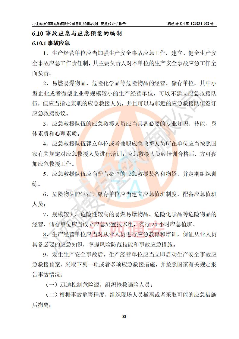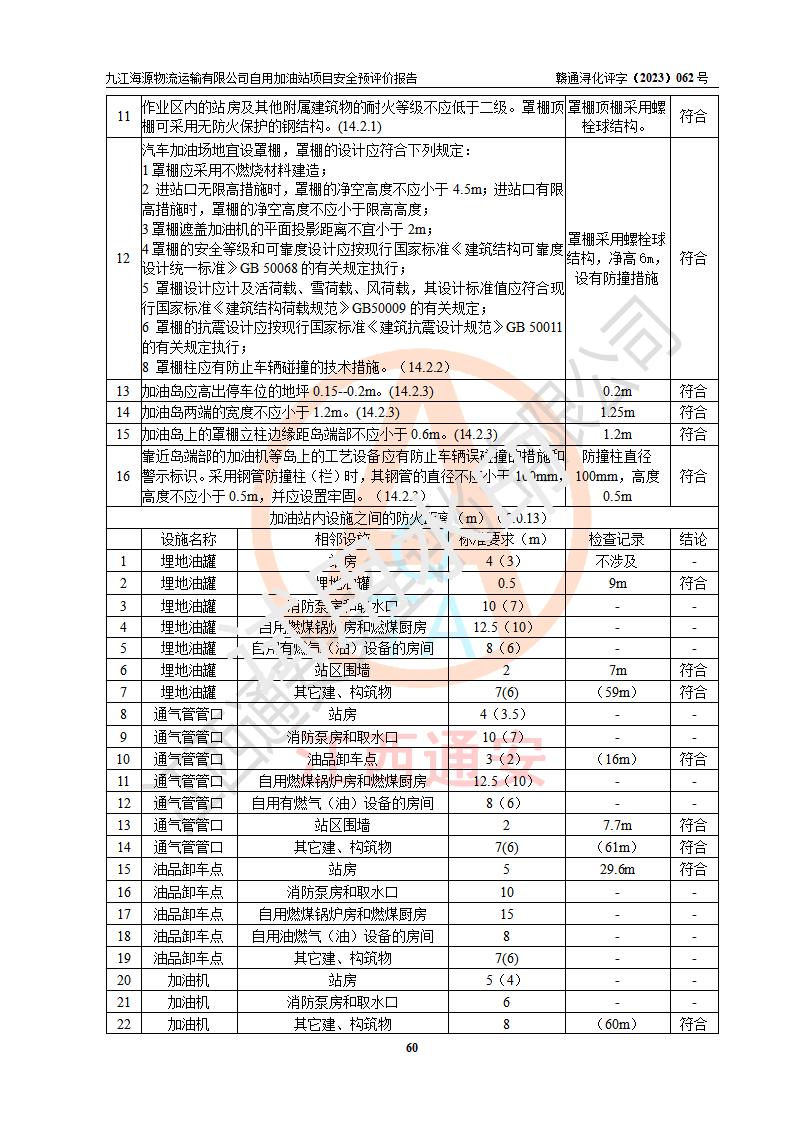 评价结论 | 九江海源物流运输有限公司自用加油站项目的选址、自然条件适宜该项目工程的建设;项目规划设计中的总体布局方案可行,符合有关法规、标准要求;项目选择的工艺过程及设备设施的安全可靠性能达到**法规、标准规定要求;项目存在的危险有害因素可控,在落实项目建设方案及评价报告提出的有关安全对策措施后,其危险有害程度能达到可以接受的程度,项目建设能够实现安全运行的目标。 | |||