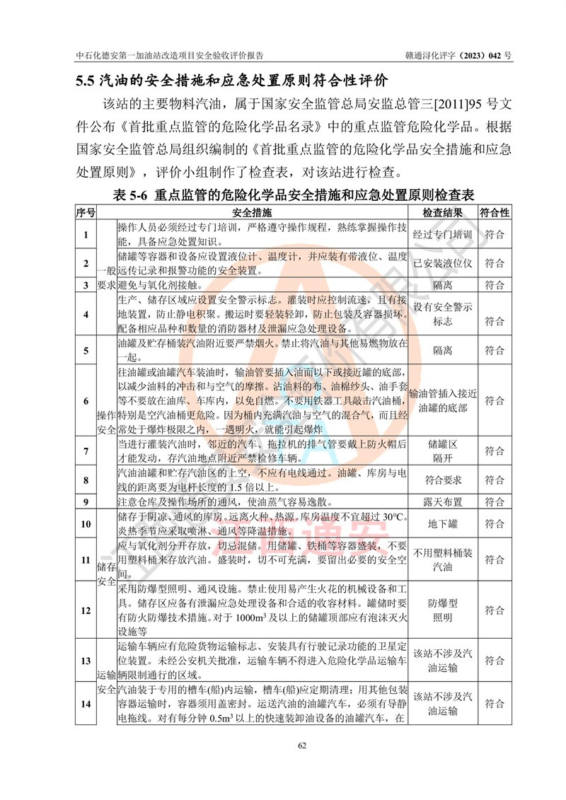评价结论 | 中国石化销售股份有限公司江西九江德安石油分公司**加油站改造项目涉及的安全条件、安全生产条件、安全生产管理符合《危险化学品经营许可证管理办法》、《汽车加油加气加氢站技术标准》等**有关法规、标准、规范要求,能满足成品油零售经营单位的安全条件,具备项目竣工验收的条件。 | |||