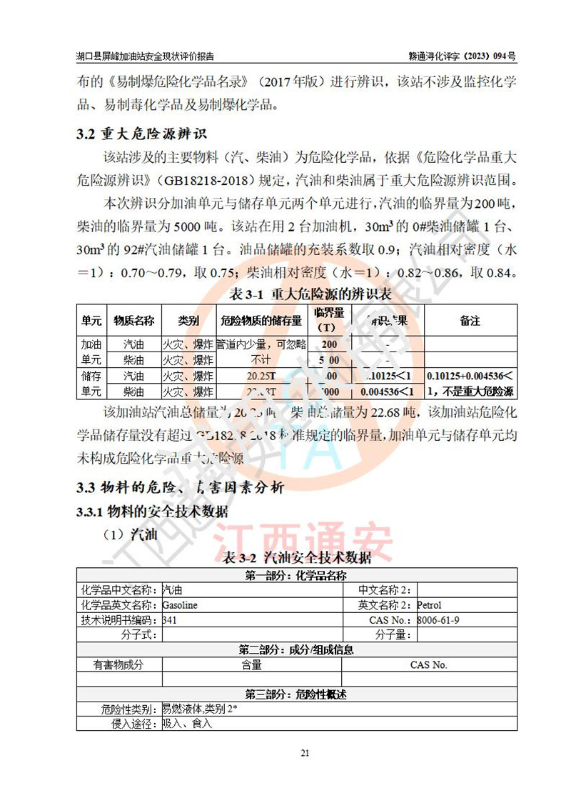 项目简介 | 湖口县屏峰加油站是一家专门从事成品油零售经营的个人独资企业,经营场所位于九江市湖口县屏峰集镇。现有从业人员3名,其中安全管理人员1人,加油站负责人徐光明。 该加油站占地面积900m2,站区内设置有2台单枪税控燃油加油机及配套的工艺管线,设有SF双层储罐2台,其中30m3的92#汽油储罐1台、30m3的0#柴油储罐1台,油品储罐总容积为60m3(折算成汽油为45m3),按现行《汽车加油加气加氢站技术标准》对加油站的等级划分原则,属三级加油站。 该站由九江市应急管理局换发《危险化学品经营许可证》(证号:赣九危化经字[2020]000347号),**期限2020年09月09日至2023年09月08日。 | |||