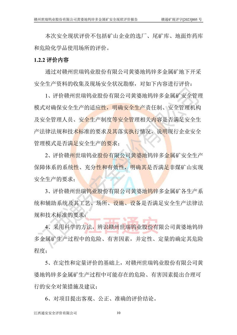 项目名称 | 赣州世瑞钨业股份有限公司黄婆地钨锌多金属矿安全现状评价报告 | ||||
