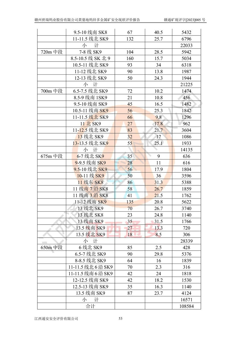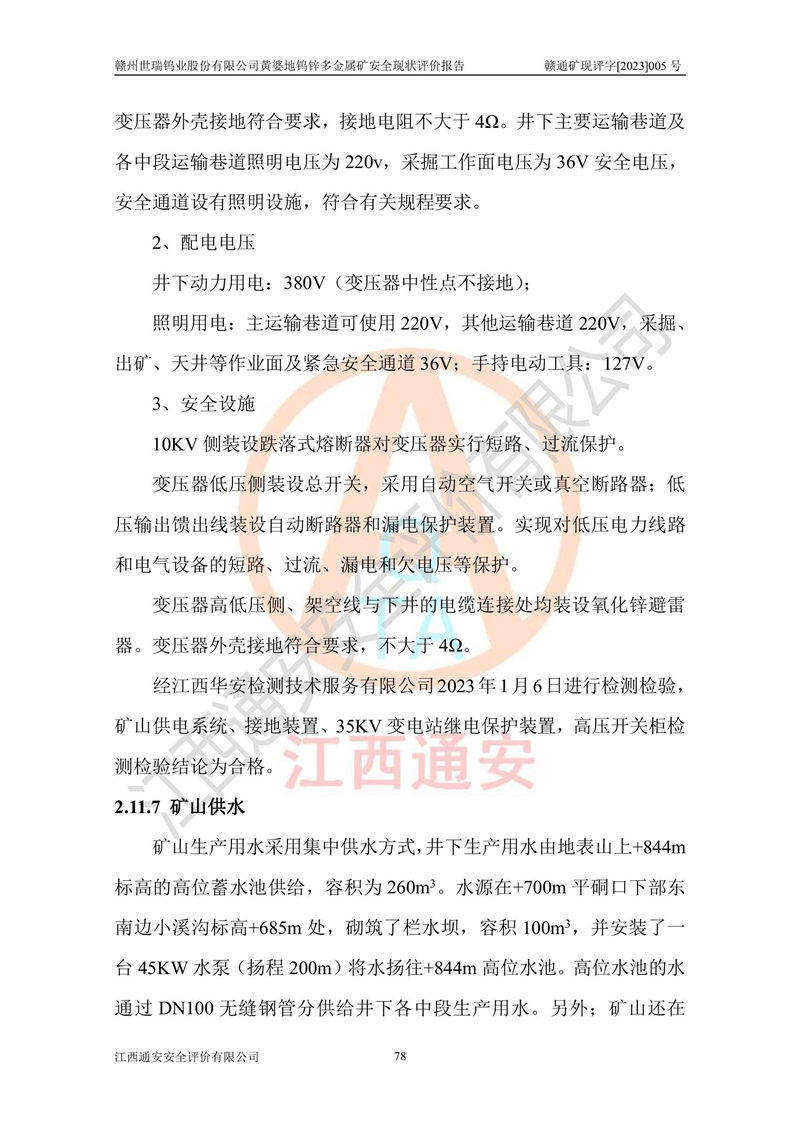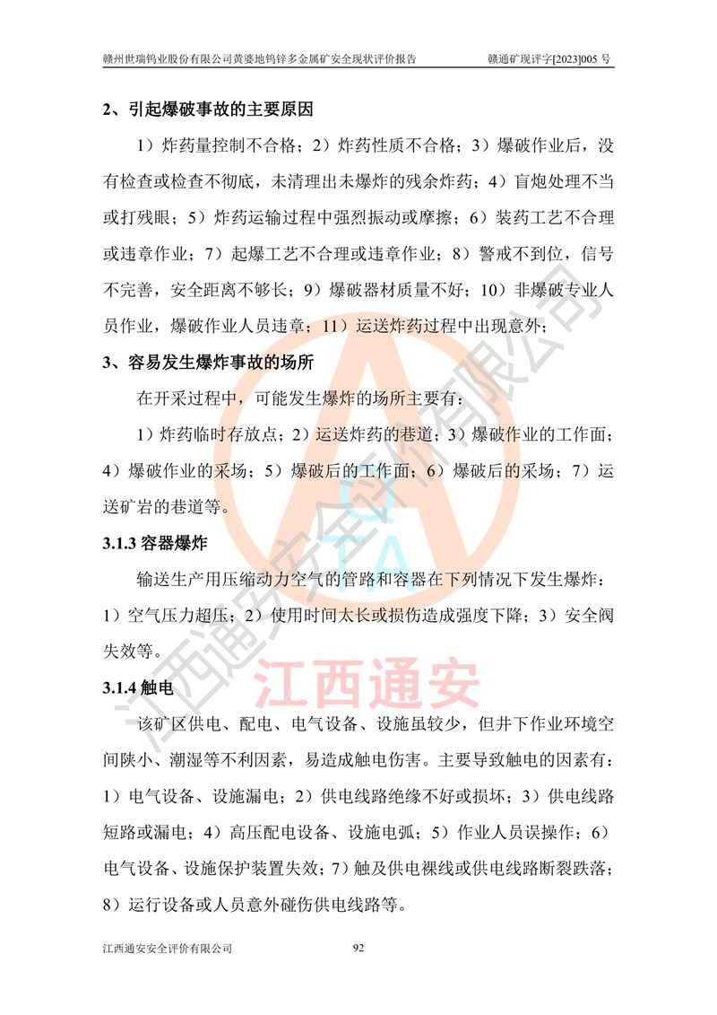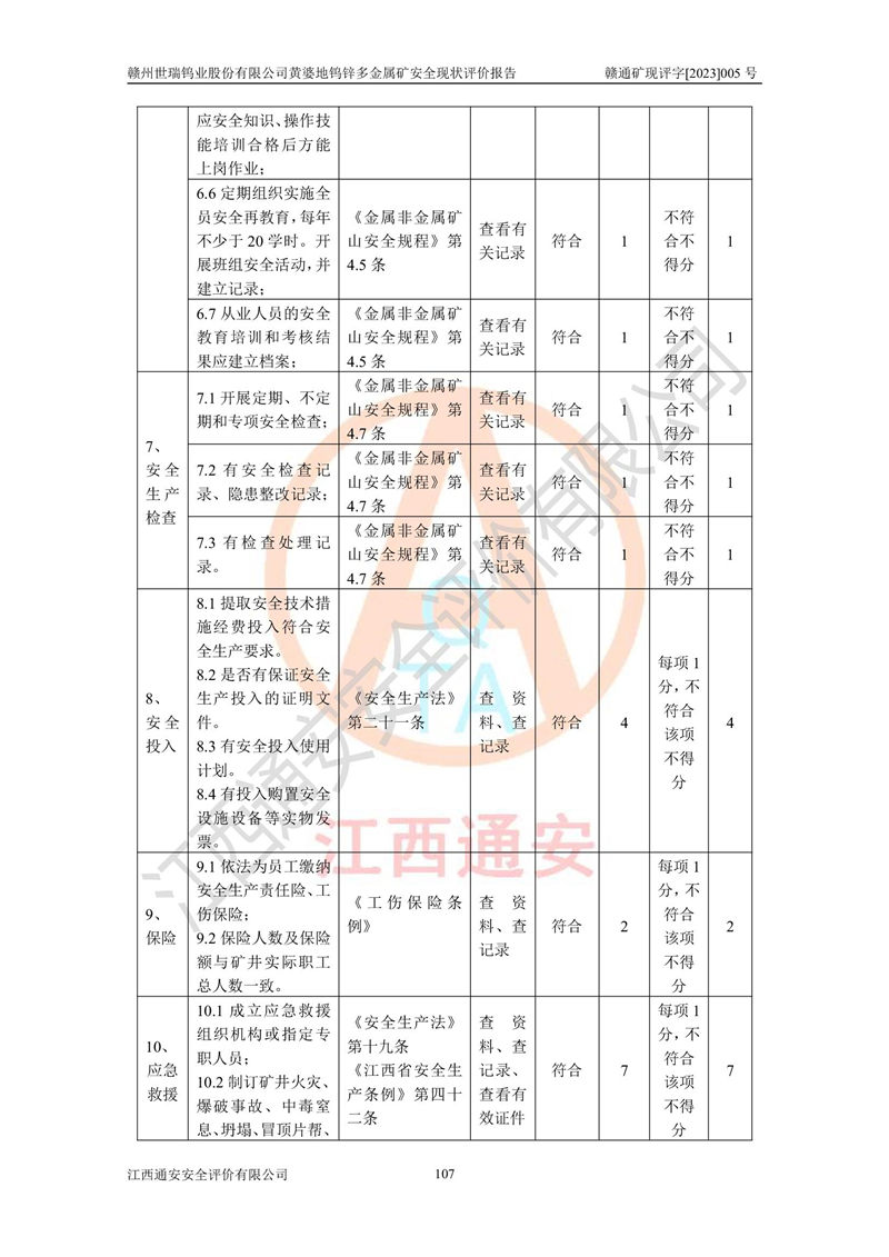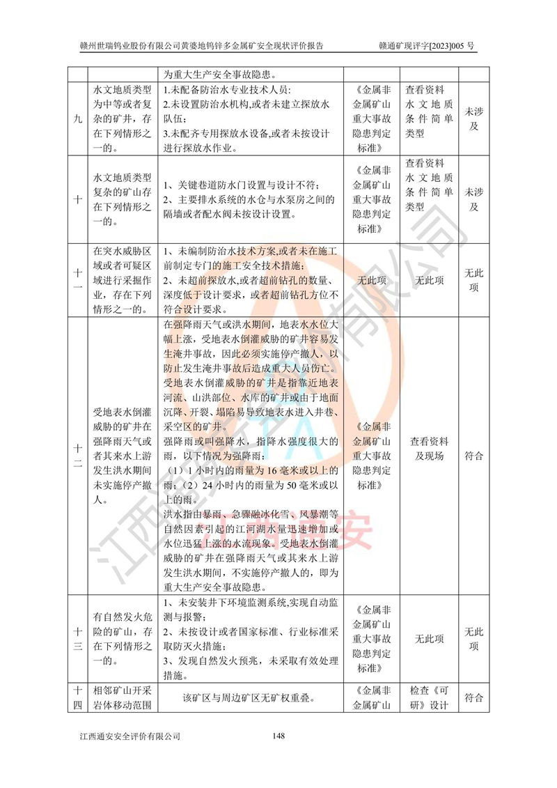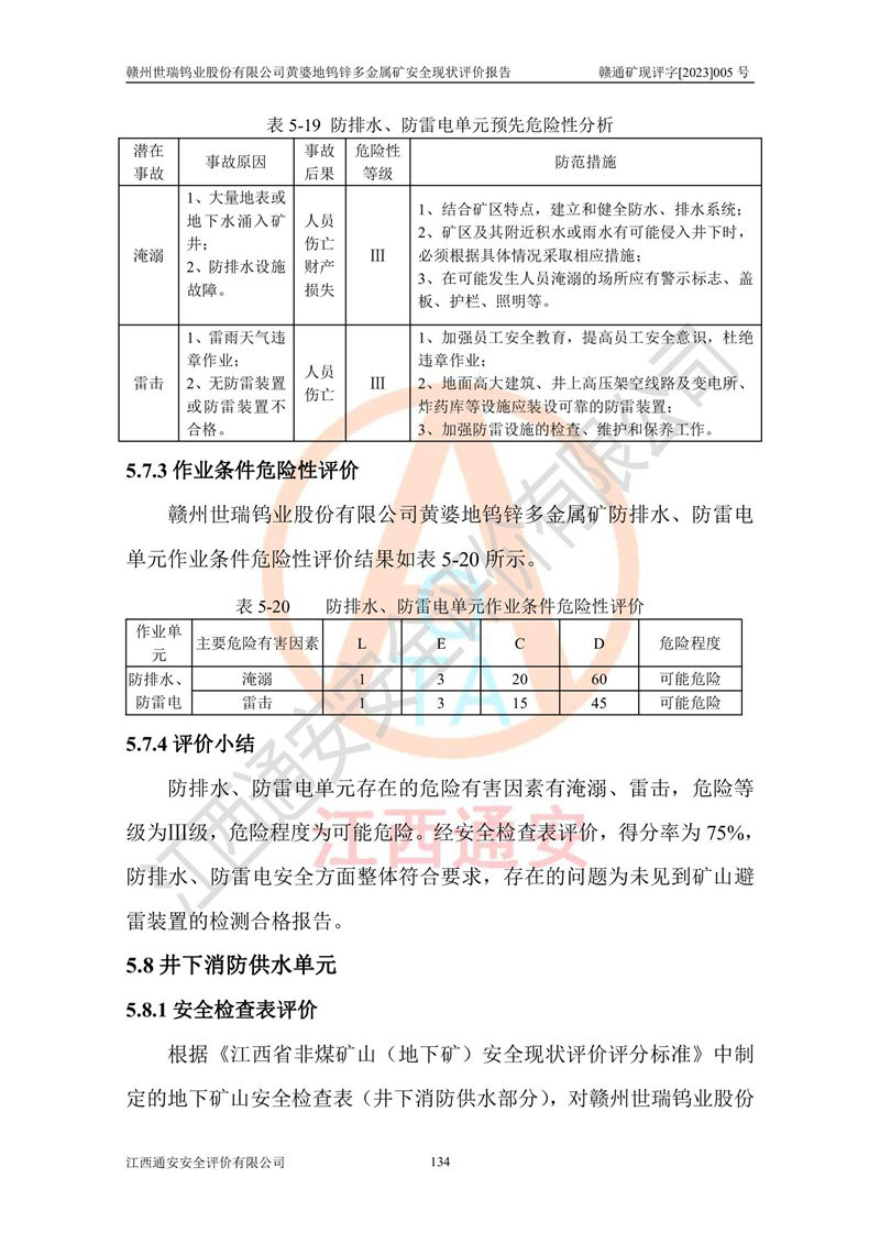 其它 | 赣州世瑞钨业股份有限公司黄婆地钨锌多金属矿设备、设施和场所符合**安全生产有关法律、法规、标准及规范的规定。通过对各单元安全检查表分析评价,矿山相关证照合法**,生产系统及辅助系统齐全可靠,现场管理较规范,建立了安全风险管控和隐患排查治理“双重预防”机制,能够满足矿山安全生产管理的要求,得分率为87.4%。赣州世瑞钨业股份有限公司黄婆地钨锌多金属矿地下开采满足安全生产条件。 | ||||