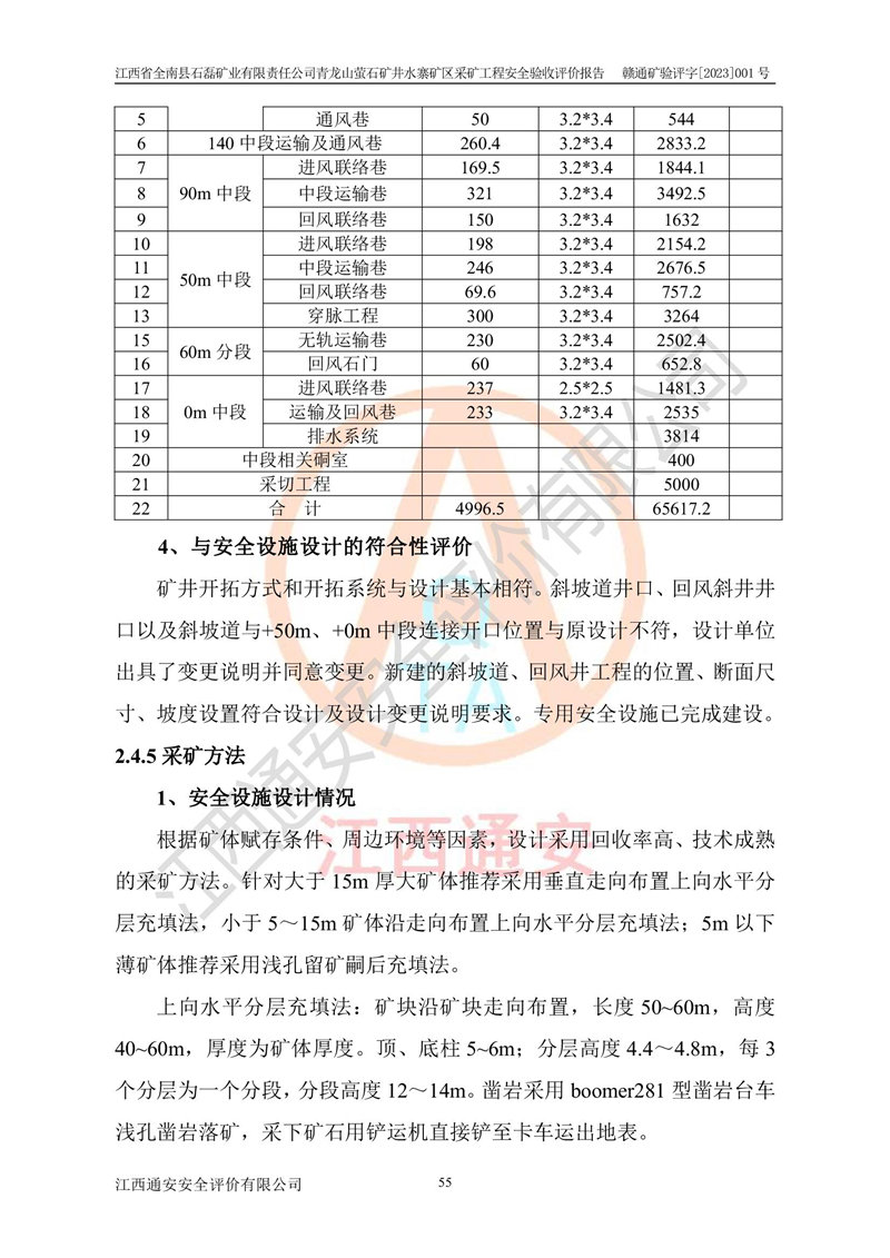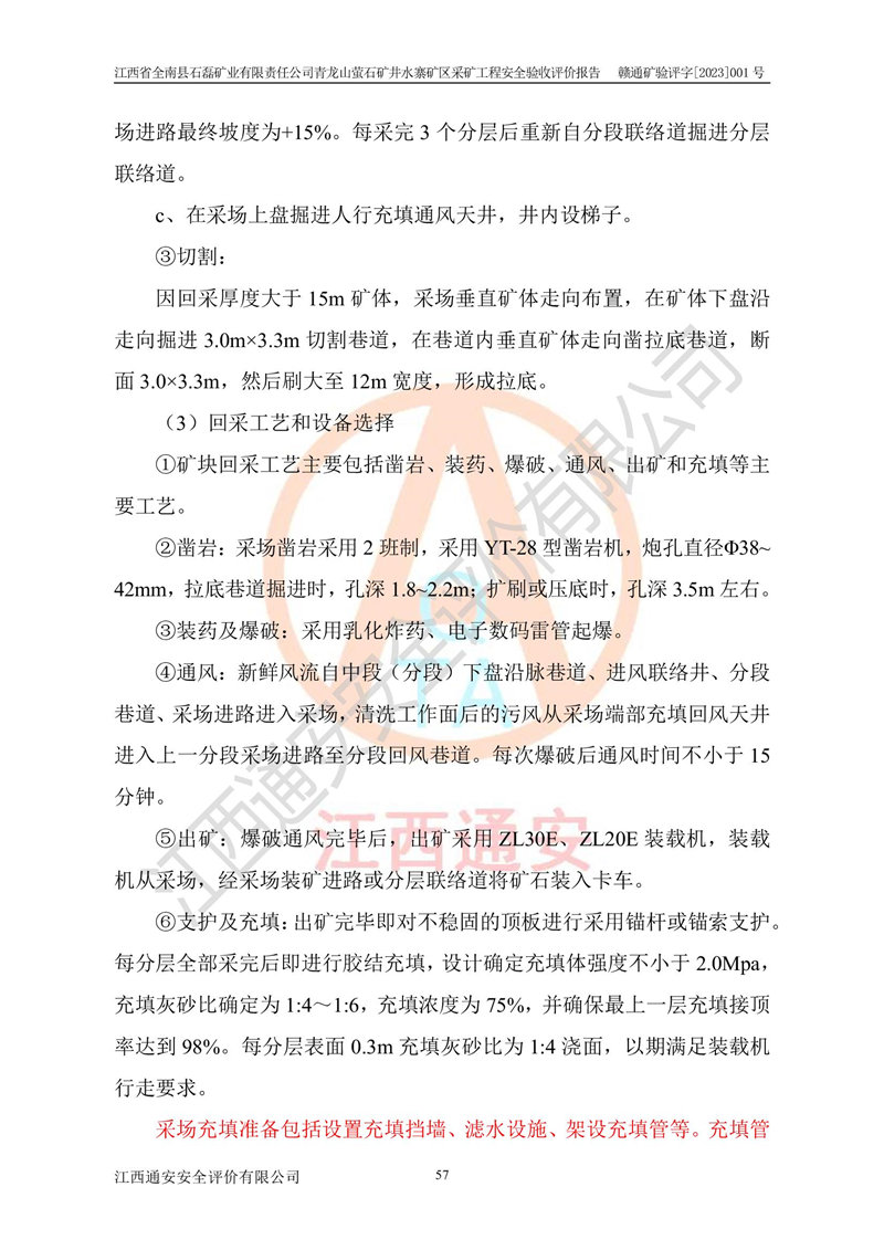 项目简介 | 江西省全南县石磊矿业有限责任公司青龙山萤石矿矿区位于全南县城北北东20°直距约36km处,行政区划隶属全南县社迳乡和陂头镇管辖,矿区地理坐标:东经114°36′52″~114°37′52″,北纬25°03′16″~25°04′10″,矿区面积:1.4007km²。矿区交通以公路为主,全南县城~陂头镇~社迳乡县乡级公路从矿区通过,北东至京九铁路铁石口站直线距离31km,至南龙高速公路崇仙段直线距离20km,交通便利。 江西省全南县石磊矿业有限责任公司于2017年1月4日取得了全南县市场和质量监督管理局换发的《营业执照》,统一社会信用代码91360729741962565R,企业性质为有限责任公司(自然人投资或控股),法定**人为杨赋斌,注册资本:柒仟陆佰万元整,经营范围:萤石矿开采、加工精选、收购、销售。**期至2025年10月30日。 江西省全南县石磊矿业有限责任公司于2021年4月30日取得江西省自然资源厅换发的采矿许可证(证号:C3600002011016120104186),矿山名称:全南县石磊矿业有限责任公司青龙山萤石矿,开采矿种为萤石(普通),开采方式为地下开采,生产规模6.0万吨/年,矿区面积1.4007km2,**期自2021年4月10日至2023年5月10日,矿区范围有7个拐点坐标圈定,开采深度+400m至0m标高。 青龙山萤石矿由青龙山矿区和井水寨矿区组成,本次采矿工程验收评价为青龙山萤石矿井水寨矿区。 矿山自上世纪90年代开始就断续有人开采过萤石,除露采外,主要是对V1、V2、V5号矿体进行了较大规模的开采,由于开采秩序混乱,2002年全南县对青龙山萤石矿进行整治,并作为县招商引资项目,将青龙山萤石资源整合后由全南县石磊矿业有限责任公司进行开采经营。 2003年7月由赣州市地质队对全南县青龙山萤石矿区(东段)进行了普查工作,完成了《江西省全南县青龙山萤石矿区(东段)资源储量普查报告》。2006年南方冶金学院编制了划定矿区范围(现采矿证范围)的《江西省全南县青龙山萤石矿矿产资源开发利用方案》,并于当年8月取得新采矿许可证。2007年初青龙山矿区恢复生产,而井水寨矿区处于停产状态。 井水寨矿区2002年之前有过较大规模的民采,全南县石磊矿业有限责任公司接管后,进行过小规模开采。为了规范采矿,2008年矿山委托江西省冶金设计院进行了《井水寨矿区技术改造工程设计和安全设施设计》,该《设计》于2009年8月25日由江西省安全生产监督管理局组织专家审查通过,并于9月21日取得了江西省安全生产监督管理局下发的审查意见书(赣安监非煤项目设审[2009]071号文)。原设计采用平硐+盲斜井、竖井开拓,基建期为2年。在此后的基建过程中,因萤石市场疲软,公司经济效益差,造成基建进度缓慢,并先后进行过四次项目建设延期,未能完成基建。2018年,随着萤石价格的回升,企业决定继续进行井水寨的基建。但由于原设计已过近10年,相关法律法规及规范要求做了较大的调整和修改,原设计不能作为现在的基建依据,经与相关部门沟通,同意重新进行设计。为此,江西省全南石磊矿业有限责任公司重新履行井水寨矿区安全设施“三同时”手续。 2017年6月,矿山委托江西省地质矿产勘查开发局赣南地质调查大队编制了《江西省全南县井水寨矿区萤石矿资源储量核实报告》,2019年2月江西省全南石磊矿业有限责任公司委托江西省冶金设计院有限责任公司完成《江西省全南县石磊矿业有限责任公司青龙山萤石矿井水寨矿区地下开采工程可行性研究报告》;2019年3月,矿山委托赣州永安安全生产科技服务有限公司编制了《江西省全南县石磊矿业有限责任公司青龙山萤石矿井水寨地下开采工程安全预评价报告》;2019年9月,矿山委托中国瑞林工程技术股份有限公司编制了《全南县石磊矿业有限责任公司青龙山萤石矿井水寨矿区采矿工程初步设计和安全设施设计》(以下简称《安全设施设计》)主要设计内容有:年生产规模19.8万吨,基建2.5年,设计开采范围为井水寨矿区13~17线+0m~+200m标高之间;由于主要矿体位于河床底下影响范围内,故采矿方法采用胶结充填法,即上向水平分层充填采矿法和浅孔留矿嗣后充填采矿法,同时对河床底下50m范围内仍预留了保安矿柱;开拓运输系统采用斜坡道开拓,无轨运输,共设有+0m、+50m、+90m、+140m、+200m(回风)等中段,其中+140m中段主要为残矿开采,设计对该中段矿量仅作排产计入,不进行专门详细的设计,具体的残矿开采由委托专门研究机构进行设计;各中段矿石、废石、人员和设备均从斜坡道进出。设计采用分层充填法开采,考虑到现有矿体的完整性以及中段资源量,总体上采用了从下至上开采顺序,首采中段为+50m中段,当上部矿体采完后,开采+0m中段。通风系统采用单翼对角抽出式通风,新风由斜坡道、进风井进入,经中段巷道、进风联络井、分段巷道、工作面、回风联络井、上中段回风巷道、回风斜井,由主房抽出地表;排水系统为0m中段集中排水;矿山供电电源引自全南县社迳乡江口35kV变电站的一回路架空线进入矿区;原罐笼井改作为进风井、管缆井及第二安全出口,新建全尾砂胶结充填系统,根据采矿工艺,按主次顺序进行充填,充填完老采矿区后进行回采,要达到回采条件,首先**将首采中段和上中段的+70m、+90m、+120m、+140m、+202m等老中段采空区充实。 该《安全设施设计》于2019年11月22日取得江西省应急管理厅下达的《全南县石磊矿业有限责任公司青龙山萤石矿井水寨矿区采矿工程安全设施设计的审