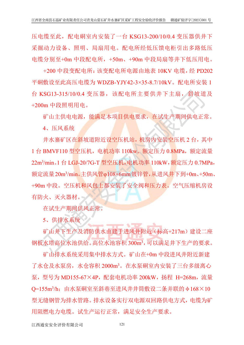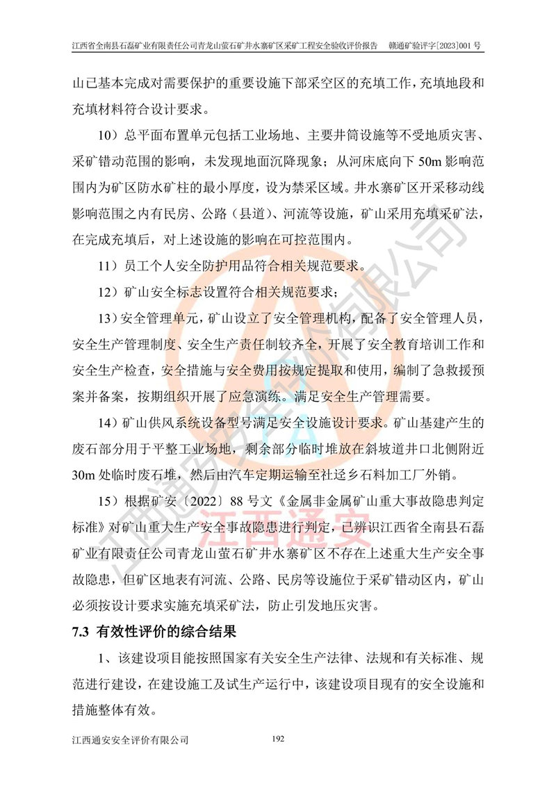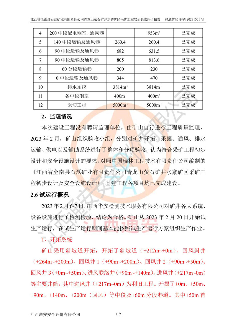 其它 | 江西省全南县石磊矿业有限责任公司青龙山萤石矿井水寨矿区采矿工程项目建设由陕西鼎能建设有限公司组织施工,矿山自行监理,施工建设和试生产运行以来,能够按照地下矿山安全设施“三同时”的要求开展各项工作,对试运行过程中发现的安全管理、生产技术和设备设施问题进行了整改,安全设施和措施符合安全设施设计要求并整体**、运行正常;安全设施经检测检验结论为合格,矿山安全生产组织机构健全,制订的各项安全生产责任制、安全管理制度和安全技术操作规程比较**,并能在生产过程中得到**遵守和实施。对照《金属非金属地下矿山建设项目安全设施竣工验收表》进行查找江西省全南县石磊矿业有限责任公司青龙山萤石矿井水寨矿区采矿工程建设项目竣工验收项目中,否决项的检查结论均为“符合”,检查项共110项,一般项不合格4项,在验收检查项总数中占比<5%。 综上所述,江西省全南县石磊矿业有限责任公司青龙山萤石矿井水寨矿区采矿工程建设项目安全设施符合《全南县石磊矿业有限责任公司青龙山萤石矿井水寨矿区采矿工程安全设施设计》及**有关法律法规、标准、规章、规范的规定要求,具备安全设施验收的条件。 | ||||