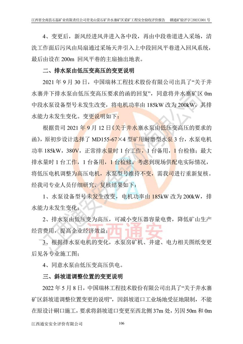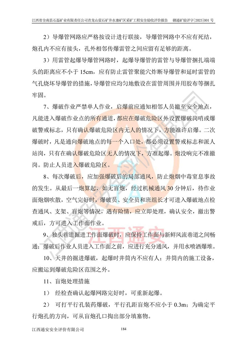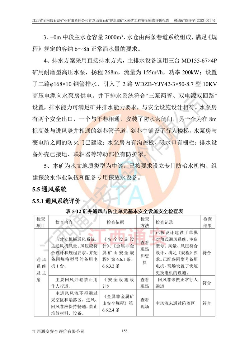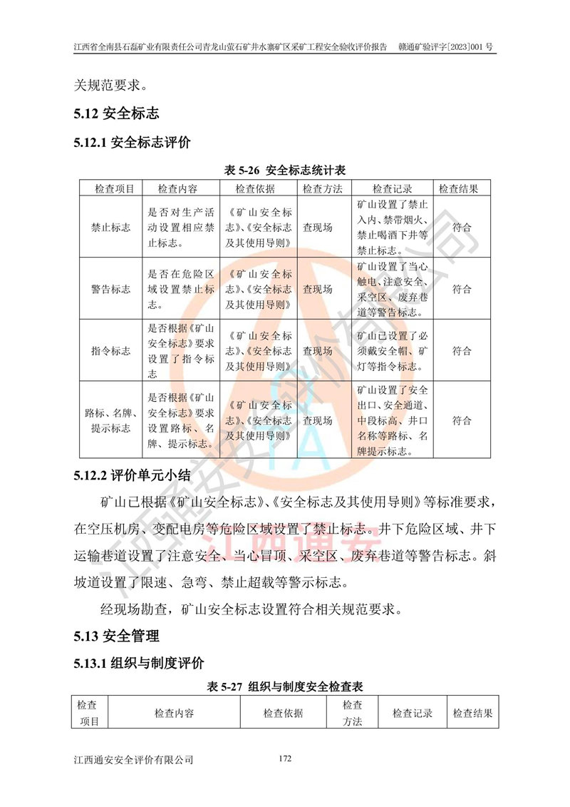 其它 | 江西省全南县石磊矿业有限责任公司青龙山萤石矿井水寨矿区采矿工程项目建设由陕西鼎能建设有限公司组织施工,矿山自行监理,施工建设和试生产运行以来,能够按照地下矿山安全设施“三同时”的要求开展各项工作,对试运行过程中发现的安全管理、生产技术和设备设施问题进行了整改,安全设施和措施符合安全设施设计要求并整体**、运行正常;安全设施经检测检验结论为合格,矿山安全生产组织机构健全,制订的各项安全生产责任制、安全管理制度和安全技术操作规程比较**,并能在生产过程中得到**遵守和实施。对照《金属非金属地下矿山建设项目安全设施竣工验收表》进行查找江西省全南县石磊矿业有限责任公司青龙山萤石矿井水寨矿区采矿工程建设项目竣工验收项目中,否决项的检查结论均为“符合”,检查项共110项,一般项不合格4项,在验收检查项总数中占比<5%。 综上所述,江西省全南县石磊矿业有限责任公司青龙山萤石矿井水寨矿区采矿工程建设项目安全设施符合《全南县石磊矿业有限责任公司青龙山萤石矿井水寨矿区采矿工程安全设施设计》及**有关法律法规、标准、规章、规范的规定要求,具备安全设施验收的条件。 | ||||