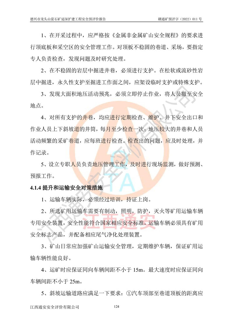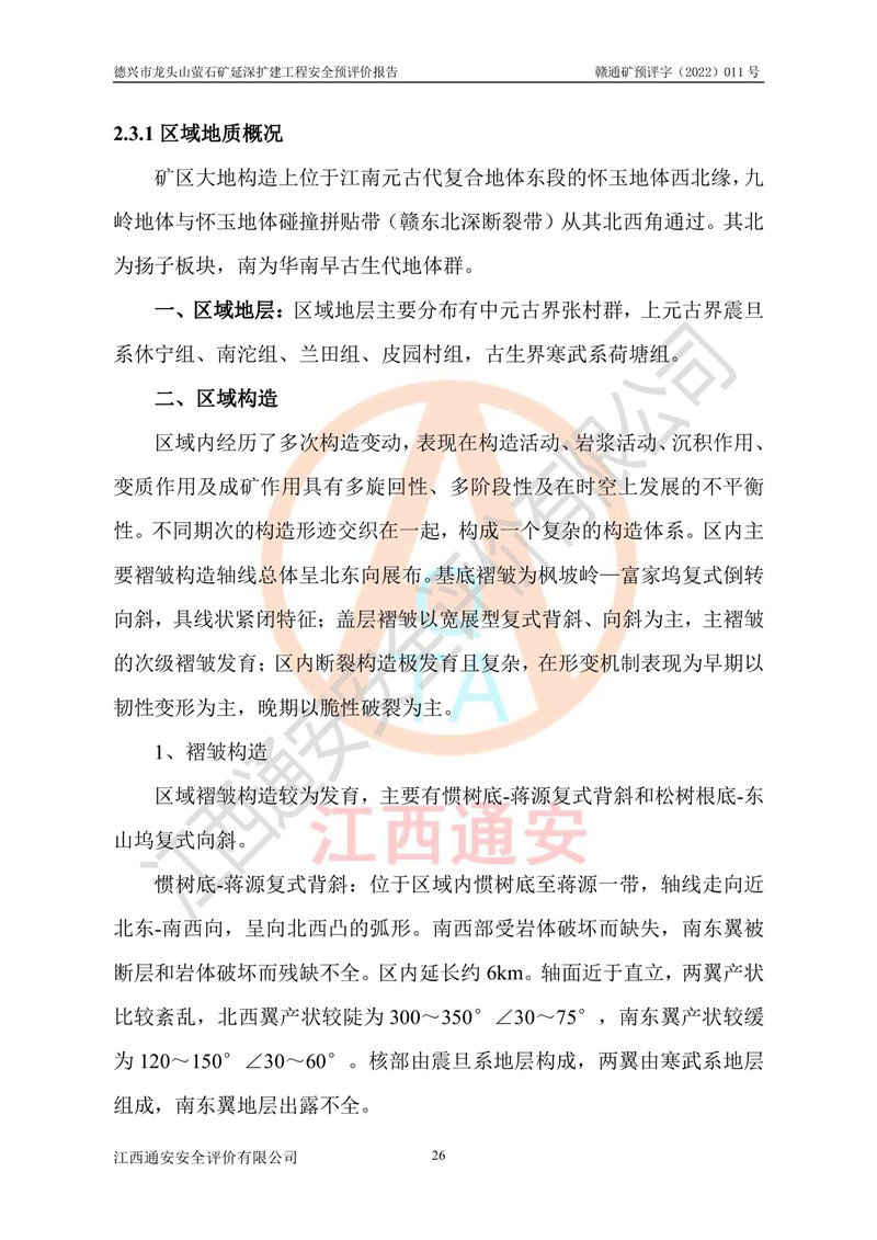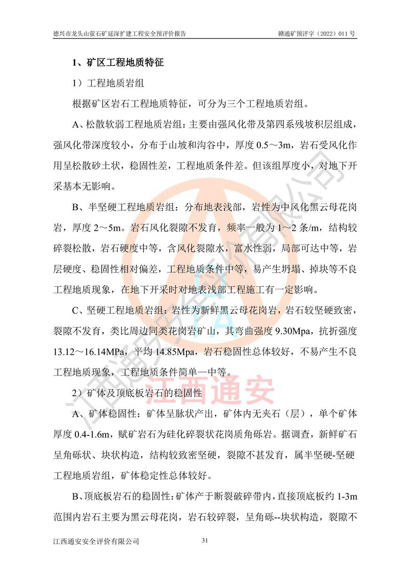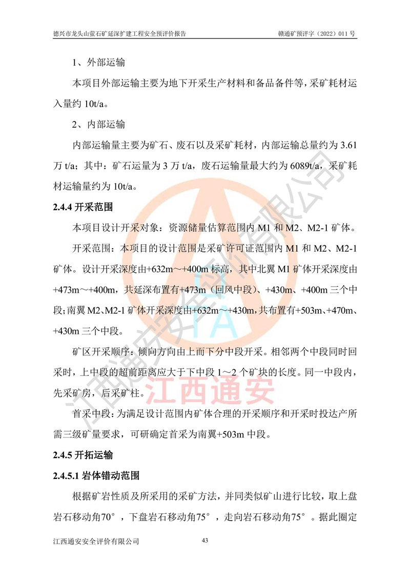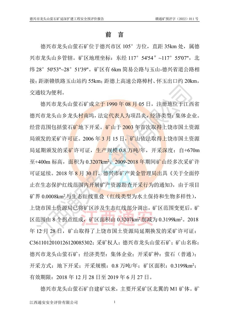 德兴市**山萤石矿位于德兴市区105°方位,直距35km处,属德兴市**山乡管辖。矿区地理坐标:东经117°54'54″~117°55'07",北纬28°50'53"~28°51'39"。矿区有6km简易公路与玉山-德兴省道公路相接;距浙赣铁路玉山站约55km;距德上高速公路樟村、怀玉出口约20km,交通较为便利。 德兴市**山萤石矿成立于1990年08月05日,注册地位于江西省德兴市**山乡**村南坞,法定**人为项昌炎,经济类型:集体企业。经营范围包括萤石矿地下开采。矿山于2003年首次取得上饶市国土资源局颁发的采矿许可证。2006年3月15日,矿山依法取得上饶市国土资源局延期颁发的采矿许可证,生产规模0.8万吨/年,开采深度:自+670m至+400m标高,面积为0.3207km2。2009-2018年期间矿山经多次采矿许可证延续。2018年8月30日,德兴市矿产黄金管理局出具《关于全面停止在生态保护红线范围内开展矿产资源勘查开采行为的通知》,由于项目矿界0.0008km2与生态红线重叠(红线类型为水土保持和生物多样性),上饶市国土资源局已将矿区涉及生态红线部分调出,矿区范围变更后,矿区范围由8个拐点组成,矿区面积由0.3207km2削减为0.3199km2。2018年12月28日,矿山取得了上饶市国土资源局延期换发的采矿许可证:C3611012010126120085302;采矿权人:德兴市**山萤石矿;矿山名称:德兴市**山萤石矿;经济类型:集体企业;开采矿种:萤石(普通);开采方式:地下开采;开采规模:0.8万吨/年;矿区面积:0.3199km2;**期限:2018年12月28日至2019年6月27日。 德兴市**山萤石矿自建矿以来,主要开采矿区北翼的M1矿体。矿山现采用竖井+盲竖井开拓,已开拓了竖井、盲竖井、回风井、+533m中段、+503m中段、+473m中段、+430m中段等工程。目前+473m中段以上矿体已基本采完。根据省安监局《关于进一步加强我省非煤地下矿山安全生产许可证工作的通知》(赣安监管一字[2012]253号)文件的要求,矿山开采多年形成的开拓方式与原开发利用方案及设计不符。2015年8月委托湖南联盛勘察设计有限公司编制了《德兴市**山萤石矿地下开采整改设计》及《德兴市**山萤石矿地下开采安全设施设计专篇》,并通过了原上饶市安监局组织的专家评审。2015年8月31日,原上饶市安监局下达了《关于德兴市**山萤石矿地下开采安全设施设计专篇的审查意见》的批复。2015年10月,矿山开展了整改设计安全设施验收评价工作,并委托江西矿安安全生产科学技术咨询中心有限公司编制了验收评价报告。2015年12月4日,矿山通过了整改设计安全设施竣工验收,并办理了安全生产许可证(许可对象为北翼M1矿体)。矿山取得安全生产许可证后,未开展其它设计或设计变更,矿山基本按整改设计进行开采。2020年5月,矿山委托中检集团康泰安全科技有限公司编制了《德兴市**山萤石矿安全现状评价报告》,作为安全生产许可证延期换证技术资料。2019 年6月27日-2021年1月12日,矿山因采矿许可未及时延续,主动申请停产,2021 年1月换放了采矿许可证,矿山依据《江西省安监局关于切实做好**非煤矿山停工停产及复工复产期间安全生产工作的指导意见》(赣安监管一字〔2015〕20 号)恢复生产,并开展了安全生产许可证延期换证工作。 2021年以前矿山采矿许可生产规模为0.8万吨,随着**对非煤矿山产业政策的调整,不断提高了非煤矿矿山准入门槛。矿山现有的采矿生产规模无法满足,《**安全生产专项整治三年行动计划》及“江西省主要矿产矿山低开采规模和低服务年限规划”等文件要求。 德兴市**山萤石矿北翼M1矿体经过多年开采后,原设计范围内(+473m以上中段)萤石矿资源储量日渐减少。为了扩大矿区资源储量,延长矿山服务年限,查明矿区萤石矿资源储量,提高矿床控制程度,为矿山提供更多可靠的资源储量。矿山加强了采矿许可范围内勘查地质工作,2018年4月委托江西省煤田地质局二二三地质队对其矿区范围内的北翼M1,南翼M2、M2-1矿体开展储量核实工作,2019年2月江西省煤田地质局二二三地质队提交了《江西省德兴市**山矿区萤石矿资源储量核实报告》报告中显示截止2018年12月31日,矿区保有萤石矿资源储量(122b+332+333)矿石量189.1kt,矿物量85.4kt,平均品位45.16%。北翼M1矿体其中122b类型矿石量5.7kt,333类型矿石量32.1kt。南翼M2、M2-1矿体其中332类型矿石量46.9kt,333类型矿石量104.4kt。 2021年1月12日,矿山取得上饶市自然资源局延期换发的采矿许可证,证号:C3611012010126120085302,采矿权人:德兴市**山萤石矿,地址:江西省德兴市,矿山名称:德兴市**山萤石矿,经济类型:集体企业,开采矿种:萤石(普通),开采方式:地下开采,生产规模:3.0万t/a,矿区面积:0.3199km2,**期限:肆年零玖月自2021年1月12日至2025年10月12日。开采深度由670m至400m标高,共有8个拐点圈定。 2021年8月19日,矿山取得江西省应急管理厅换发的安全生产许可证(开采对象北翼M1矿体)。编号:(赣)FM安许证字[2006]M0836号,单位名称:德兴市**山萤石矿,主要负责人:项昌炎,单位地址:德兴市**山乡**村,经济类型:集体企业,许可范围:萤石矿0.8万吨/年,竖井开拓,+473m中段地下开采。**期至2024年8月18日。 目前,矿山已完成了采矿许可证范围内详查工作,完成了资源价款处置,并完成了采矿许可生产规模的变更及采矿权延续等工作。为了使矿井达到持续稳定的生产接替,保持三级矿量平衡,矿山在完成储量核实报告工作后,现阶段正在履行延深扩建工程“三同时”建设手续。2021年8月30日,矿山向德兴市工业和信息化局申请了