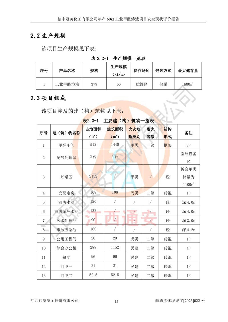 项目简介 | 信丰冠美化工有限公司位于江西省赣州市信丰县工业园伟邦路,法定**人为汪学斌,成立于2007年04月09日,注册资本壹仟万元整,营业执照经营范围为工业甲醛、尿醛树脂胶生产、销售(凭许可证经营)等。 信丰冠美化工有限公司2020年07月23日取得了《安全生产许可证》,许可证编号:(赣)WH安许证字[2008]0500号,许可范围为工业甲醛溶液(60kt/a),**期2020年08月06日至2023年08月05日。该公司2022年8月30日取得了安全生产标准化证书,证书编号:赣AQBWⅡ[2022]015,**期至2025年8月。该公司现有员工23人,其中专职安全管理人员1人。 根据《江西省危险化学品产业转移项目和化工园区安全风险防控专项整治实施方案》(赣安办字〔2021〕86 号)要求,为提升生产本质安全,减少重大危险源,信丰冠美化工有限公司对贮罐区进行了调整,停用1台甲醇储罐和1台甲醇计量罐,2台甲醇储罐变更为2台甲醛储罐。信丰冠美化工有限公司委托山东富海石化工程有限公司对60kt/a工业甲醛项目出具了在役化工装置安全设计诊断及整改设计文本和图纸(2022年12月),取得了赣州市应急管理局出具的审查意见,并对贮罐区进行了整改。贮罐区整改完成后,经辨识,信丰冠美化工有限公司生产、储存单元不构成危险化学品重大危险源。信丰冠美化工有限公司向信丰县应急管理局申请了重大危险源核销,2023年2月2日取得了核销登记表,核销编号为HX赣360722[2023]001。 信丰冠美化工有限公司年产60kt工业甲醛溶液项目生产过程中涉及的原辅材料为甲醇和银触媒(催化剂),氮封需要使用氮气,副反应产物为氢气,产品为甲醛溶液。根据《危险化学品目录》,该项目涉及的甲醇、氮气[压缩的]、氢气、甲醛和甲醛溶液属于危险化学品。经辨识,甲醇和氢气属于重点监管的危险化学品,甲醛属于高毒物品,甲醇属于特别管控的危险化学品,不涉及监控化学品、易制毒化学品、易制爆危险化学品和剧毒化学品,生产、储存单元不构成危险化学品重大危险源,涉及的氧化反应属于重点监管的危险化工工艺。根据《安全生产许可证条例》、《危险化学品安全管理条例》和《危险化学品生产企业安全生产许可实施办法》的相关规定,该项目甲醛溶液属于危险化学品,需要办理危险化学品安全生产许可证。根据生产工艺特点及物料的理化特性可知,该项目生产过程中存在火灾与爆炸、中毒与窒息、触电、机械伤害等危险有害因素。 该公司自2020年07月23日取得安全生产许可证以来,生产运行正常,未发生一般及以上生产安全事故。 | ||||||