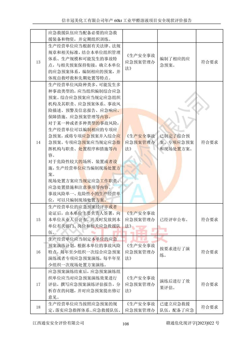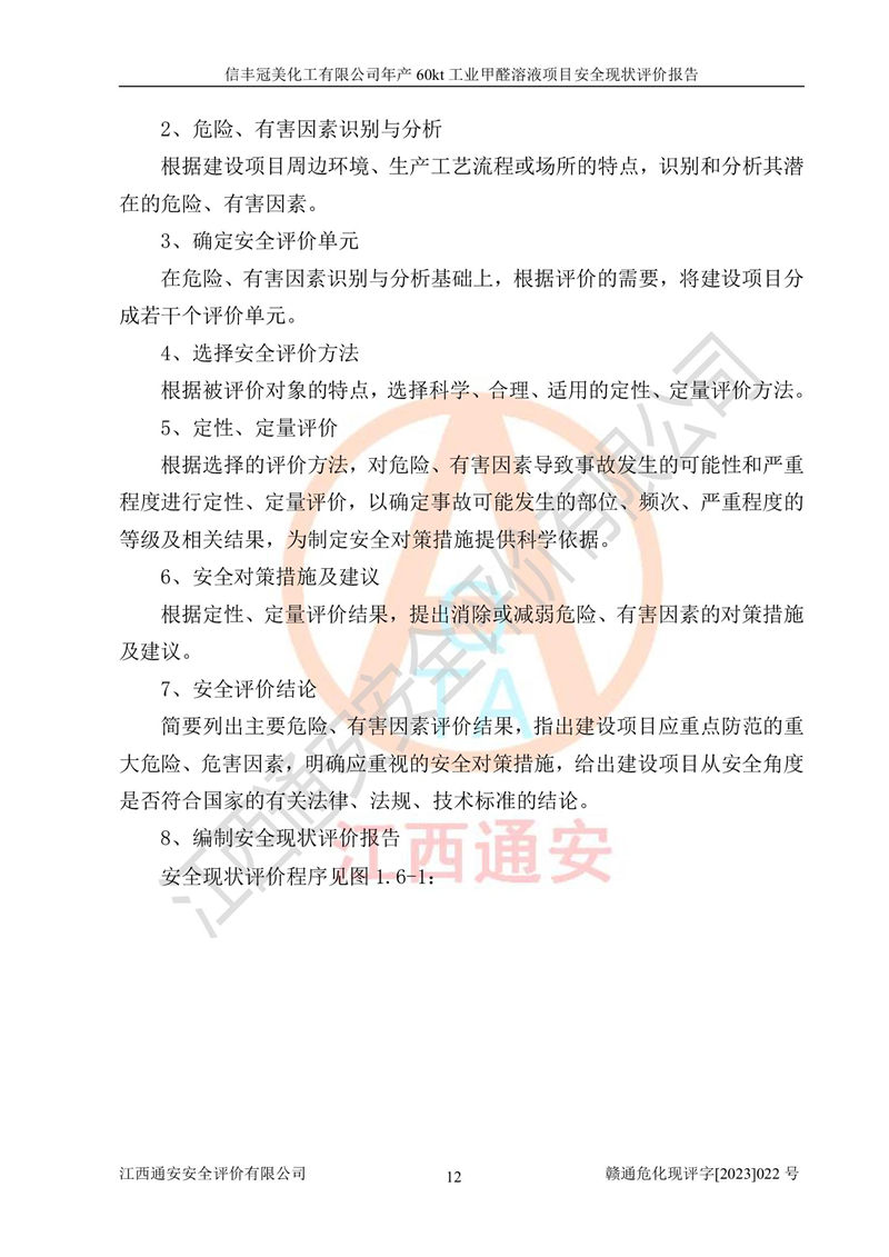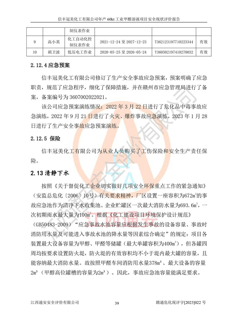 评价结论 | 信丰冠美化工有限公司年产60kt工业甲醛溶液项目现场情况与设计图纸一致,DCS和SIS系统设计符合要求、运行正常,有关从业人员资质符合《江西省危险化学品安全专项整治三年行动实施方案》要求,安全设施及安全管理符合法律、法规、标准的要求,安全风险是受控制的,其风险程度是可以接受的,安全设施符合安全生产条件,能够满足安全生产的要求。 | ||||||