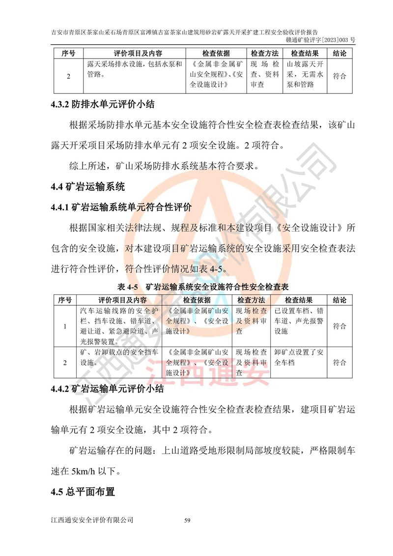 其它 | 该建设项目(扩建工程)自进行矿山基建施工、试生产运行以来,能够按照露天矿山安全设施“三同时”的要求开展各项工作,对试运行过程中存在的安全管理问题,安全技术问题进行了整改,符合安全设施与主体工程同时设计、同时施工、同时投入生产和使用的要求;已建项目的安全设施总体运行**、技术措施得当;安全生产组织机构健全,制订的各项安全生产管理制度和安全技术规程,能在生产过程中得到**遵守和实施,试生产运行以来,安全设施运行正常,对照《金属非金属露天矿山建设项目安全设施竣工验收表》查找吉安市青原区茶家山采石场青原区富滩镇古富茶家山建筑用砂岩矿露天开采扩建工程竣工验收项目中,否决项的检查结论均为“符合”且验收检查项总数中检查结论为“不符合”的项少于5%。 综上所述,吉安市青原区茶家山采石场青原区富滩镇古富茶家山建筑用砂岩矿露天开采扩建工程安全设施符合《吉安市青原区茶家山采石场青原区富滩镇古富茶家山建筑用砂岩矿露天开采扩建工程安全设施设计》及**有关法律法规、标准、规章、规范的规定要求,具备安全验收的条件。 | ||||