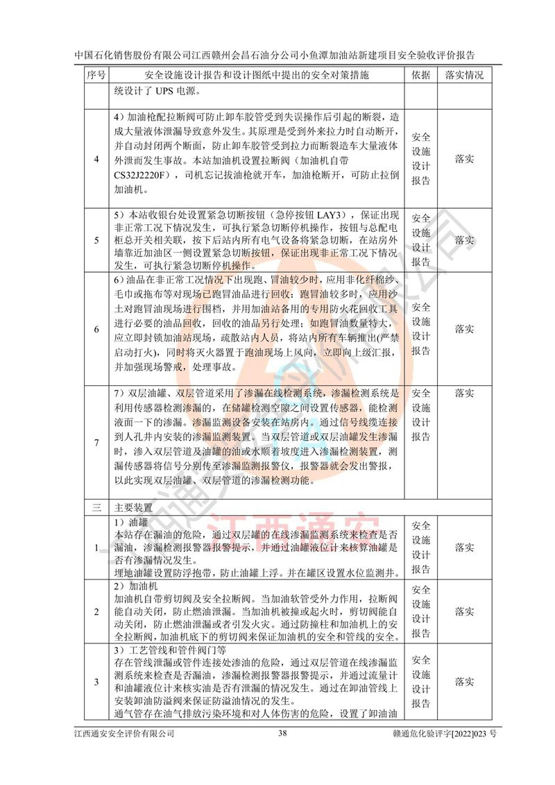 其它 | 中国石化销售股份有限公司江西赣州会昌石油分公司小鱼潭加油站新建项目严格执行**有关安全生产法律、法规和有关标准、规范,认真落实并合理采纳安全条件评价报告及安全设施设计专篇设计中的安全对策、措施及建议,做到安全设施与主体工程同时设计、同时施工、同时投入生产和使用的“三同时”,对潜在的危险、有害因素采取了安全对策措施,工程潜在的危险、有害因素可得到**控制,风险在**控制和可接受范围内。现场与设计一致。 该项目安全设施设计专篇设计的安全设施得到落实符合**安全生产方面的法律、法规、标准、规范的要求,具备安全验收条件,符合安全生产条件。 | ||||
