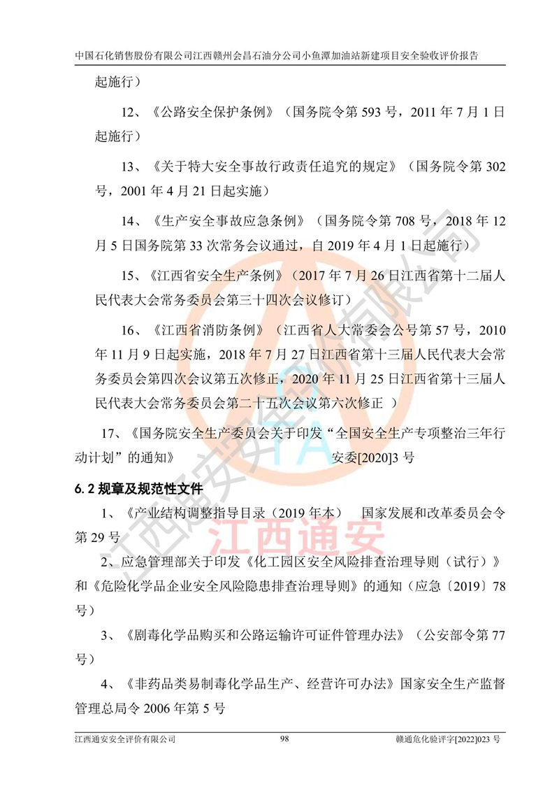 主要任务 | 受中国石化销售股份有限公司江西赣州会昌石油分公司的委托,江西通安安全评价有限公司承担其项目安全验收评价工作,于2022年10月组成评价小组,对所提供的资料、文件进行了审核,对现场进行了实地检测,根据《安全评价通则》AQ8001-2007和《危险化学品建设项目安全评价细则(试行)》(安监总危化[2007]255号)要求,编写此评价报告。 | ||||