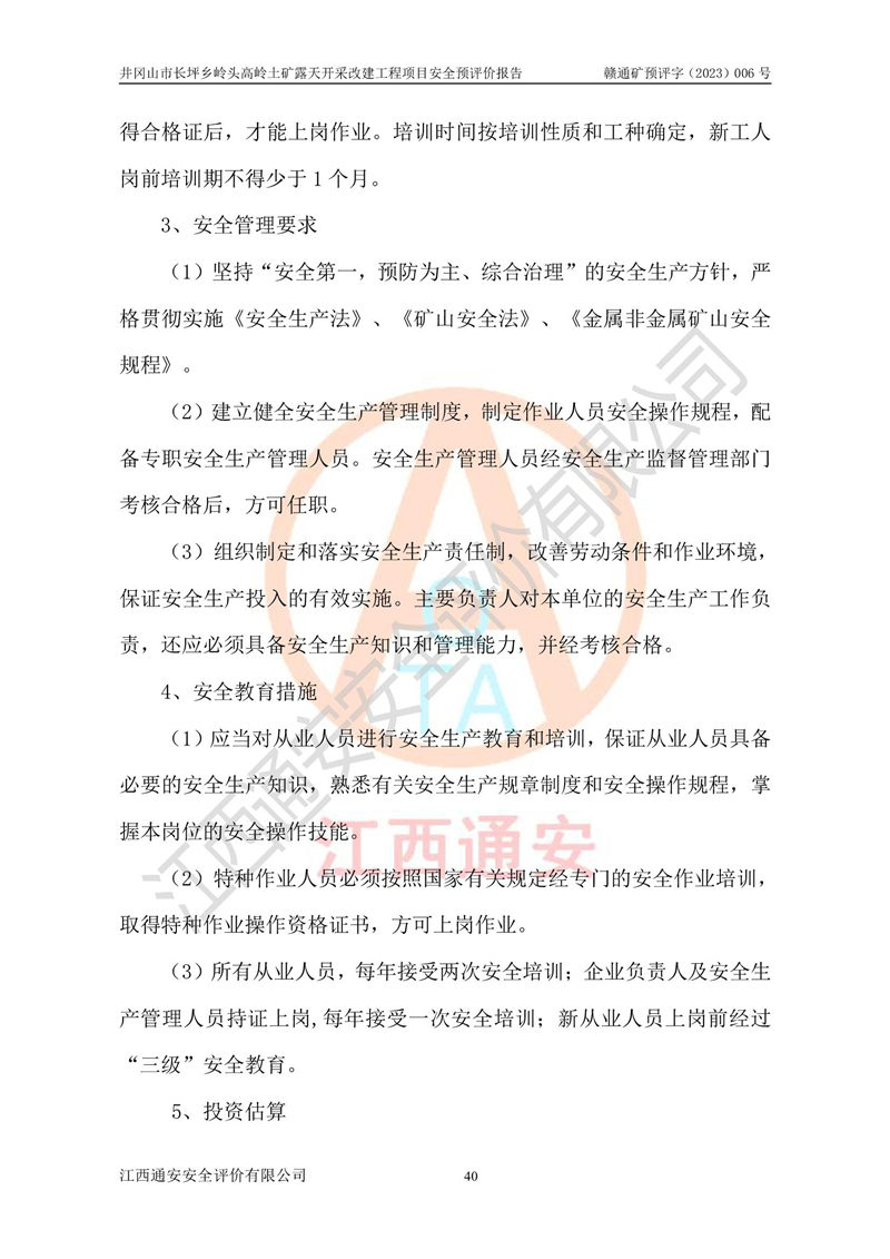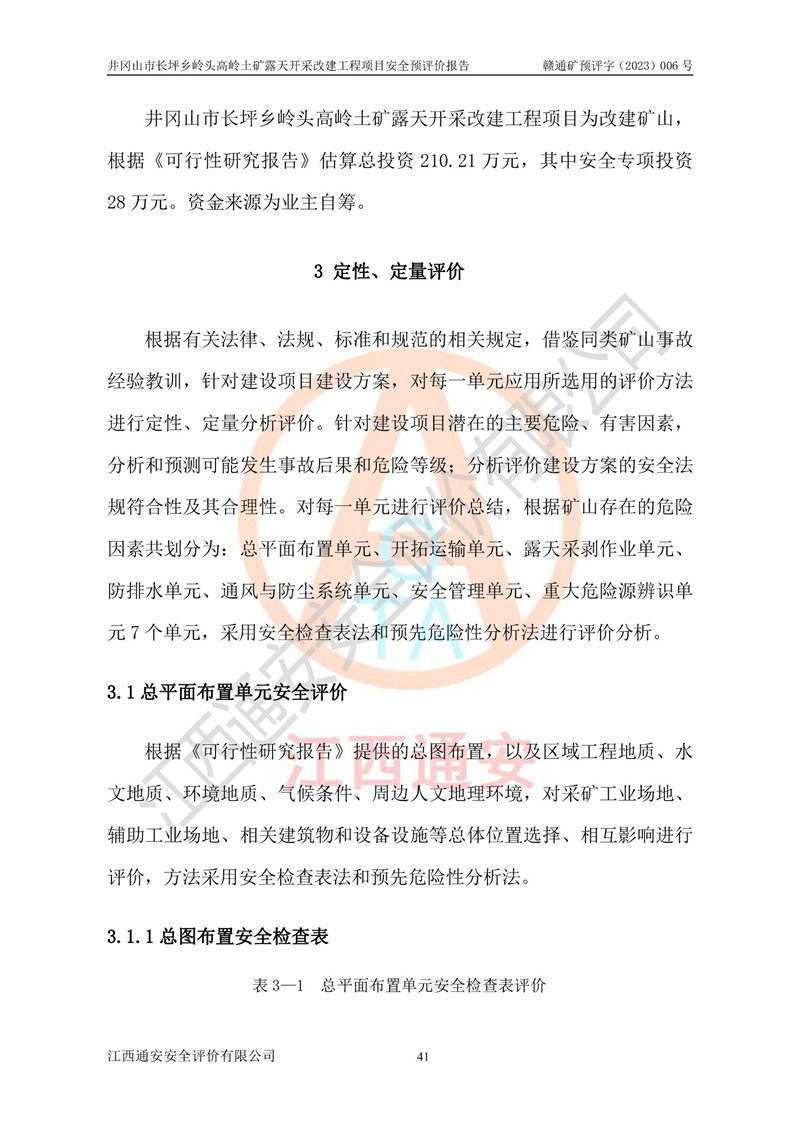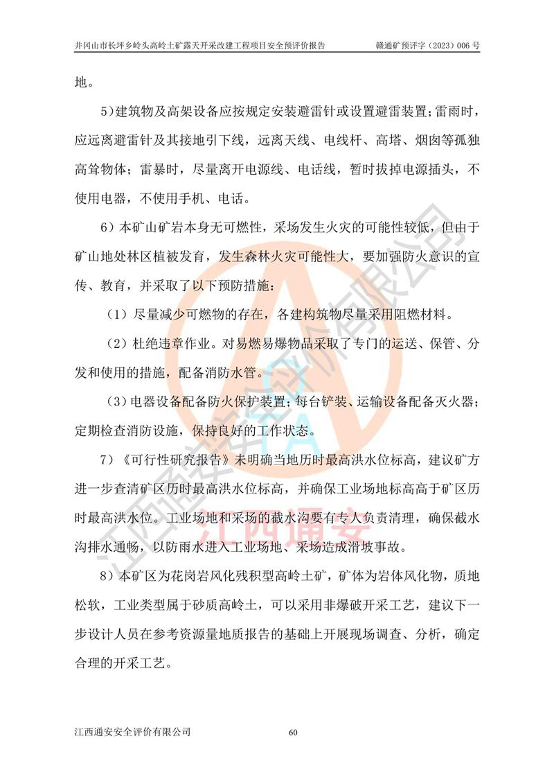 其它 | 1、该评价项目中存在的主要危险因素:滑坡和坍塌、**伤害、机械伤害、起重伤害、火灾、高处坠落、物体打击、淹溺、泥石流。 2、该评价项目应重点防范的重大危险有害因素:滑坡和坍塌、**伤害、高处坠落、机械伤害。 3、该评价项目中存在的有害因素包括:粉尘、噪声与振动、不良作业环境,如高温、雷击对矿山人员的伤害和其他不利的环境因素等。该评价项目应重点防范的有害因素:粉尘和噪声。 4、该矿山为非金属露天采场,无瓦斯和自燃发火危险,矿区范围内及周边无较大水系,矿区工程及水文地质条件中等。该采场不使用有毒有害危险化学品药剂,无爆破作业,不使用民用爆破器材。矿山乙炔使用量小,在设备检修过程中,气割作业使用乙炔,钢瓶装,一般储存量1~3瓶,远小于其临界值,末构成重大危险源,本评价项目不存在重大危险源。 建设项目拟定的开采方案、采用的采矿工艺及各系统的安全设施基本符合安全生产法律、法规和行业安全技术规程。在建设施工及生产运行中,如能严格执行**有关安全生产法律、法规和有关标准、规范,认真落实设计提出的安全措施,并合理采纳本报告中提出的安全对策措施及建议,项目的主要危险、有害因素可得到较好控制,安全生产风险在可接受范围。井冈山市长坪乡岭头高岭土矿露天开采改建工程项目从安全生产角度符合**有关安全生产法律、法规、规章、标准和规范的要求,风险可以接受。 | ||||